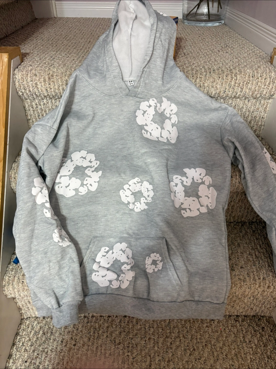 10I am selling a grey hoodie. It features a white design on the front, back, and sleeves. A classic style with a kangaroo pocket. Size says 2 xl fits more like xl $25 pick up heartlake Brampton