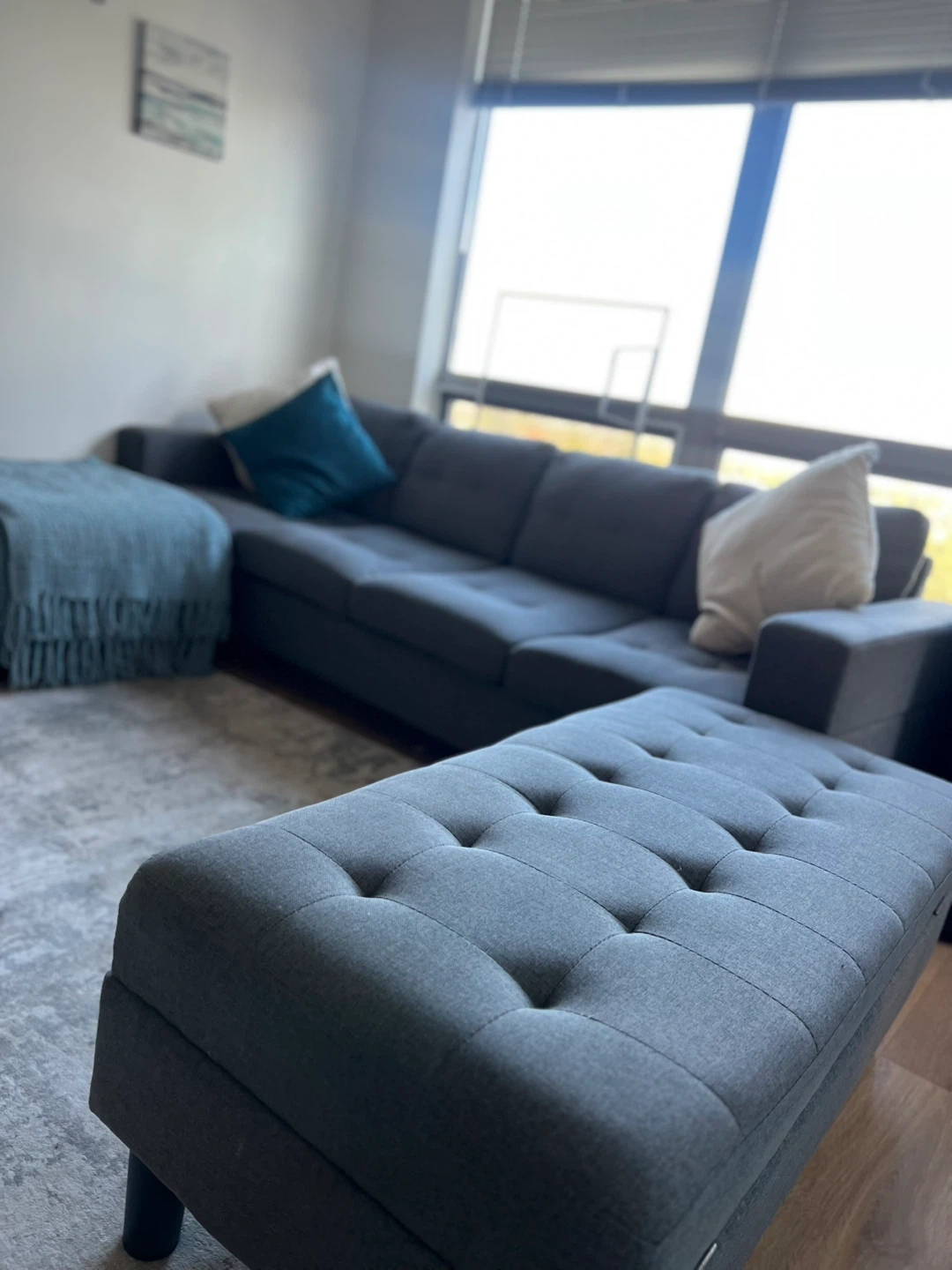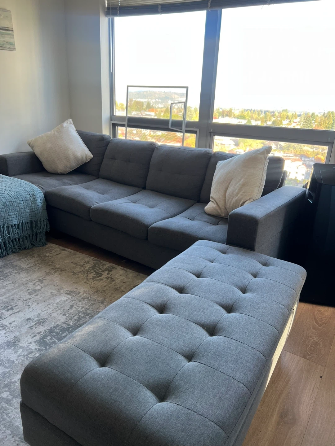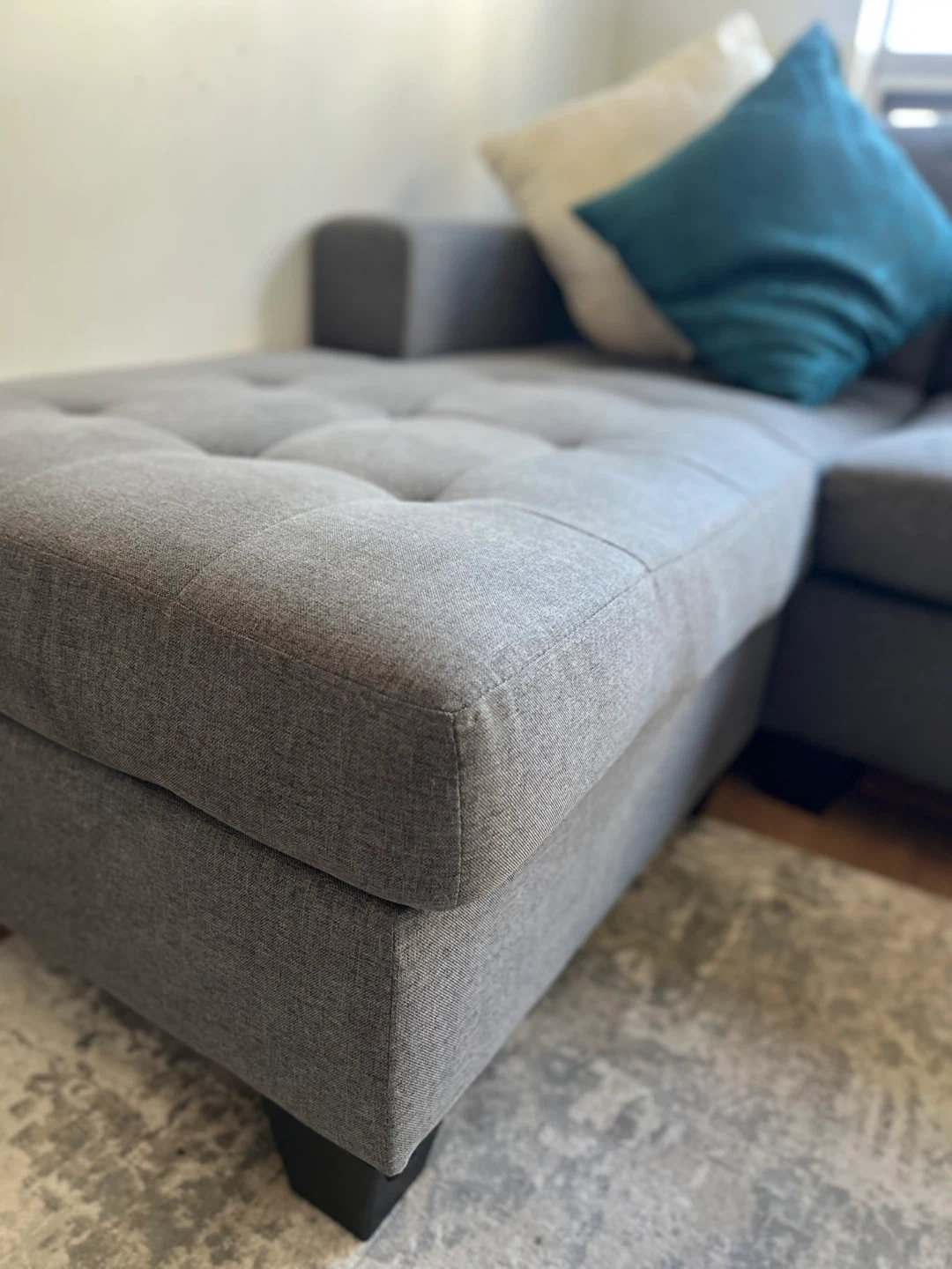 15Selling a comfy grey sectional couch with a matching ottoman. It's in good condition and would be perfect for a living room or den. The ottoman has a tufted top and provides extra seating or a place to kick up your feet after a long day.