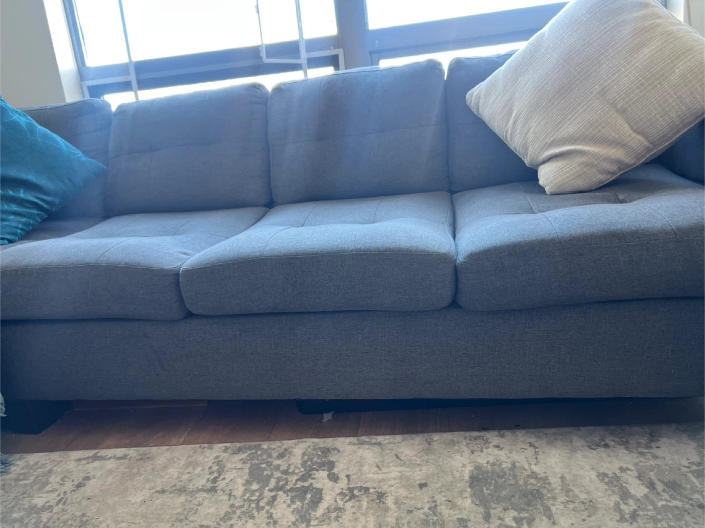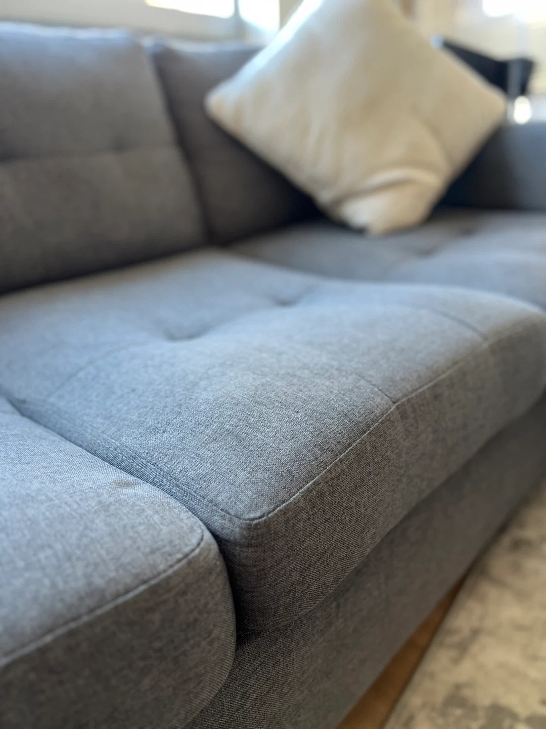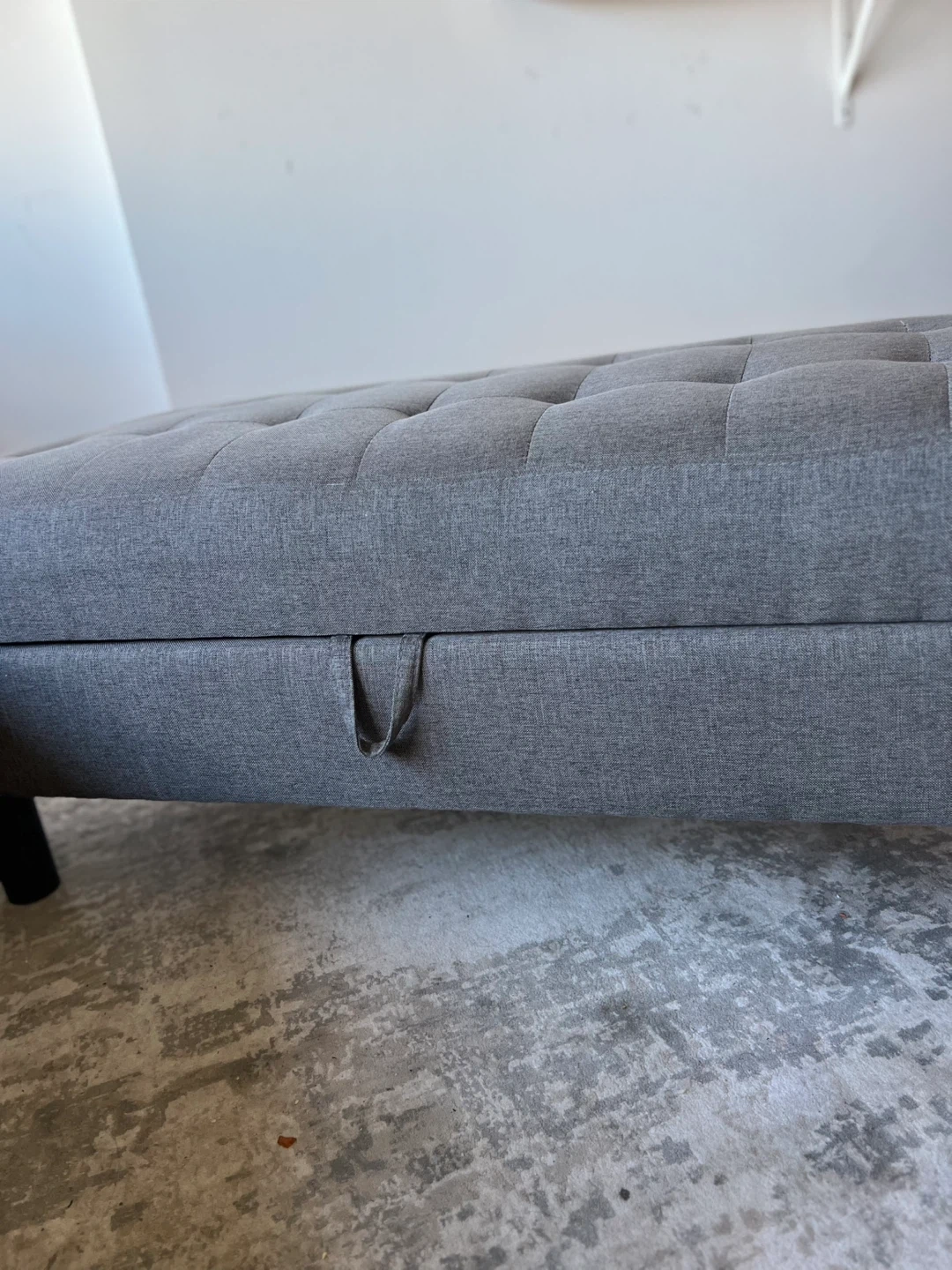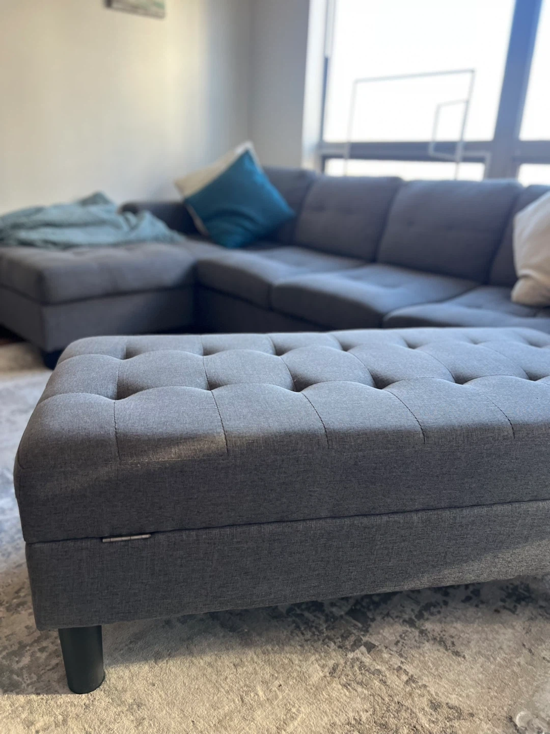 15Selling a comfy grey sectional couch with a matching ottoman. It's in good condition and would be perfect for a living room or den. The ottoman has a tufted top and provides extra seating or a place to kick up your feet after a long day.
