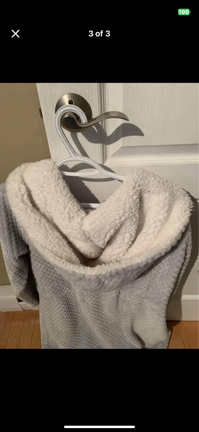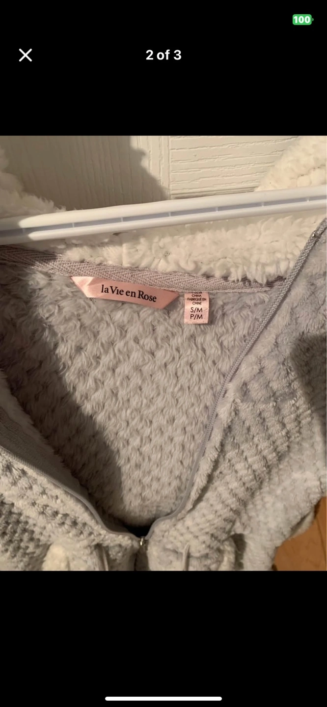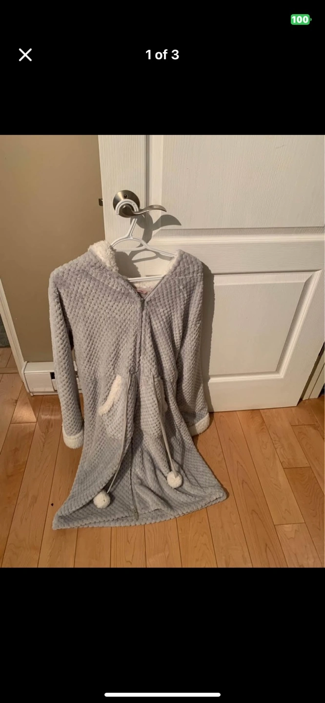 10Cozy grey zip-up hoodie. Soft material, perfect for lounging. Features a hood and pockets. Size in pic