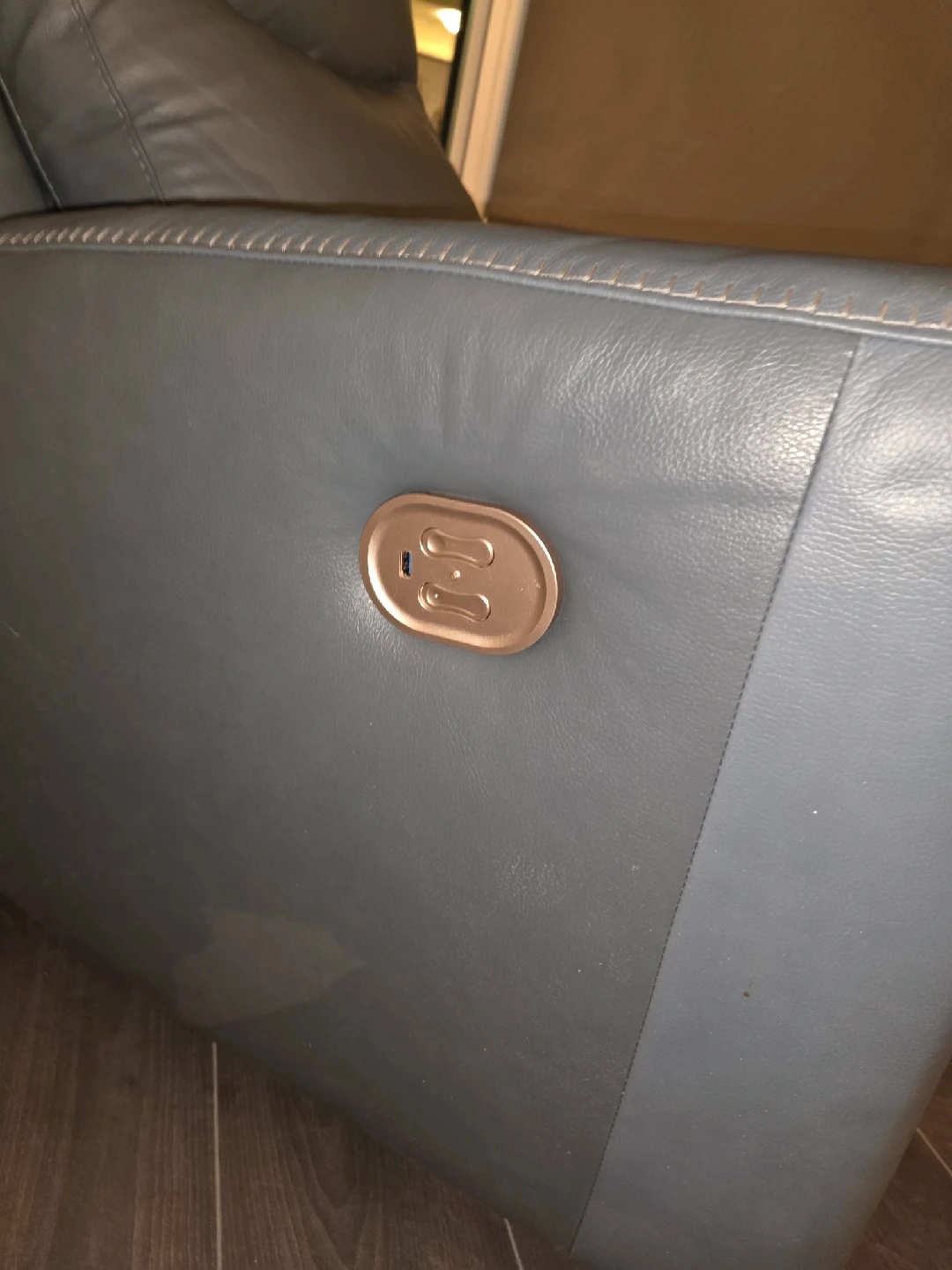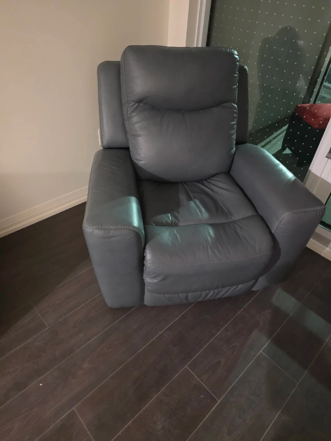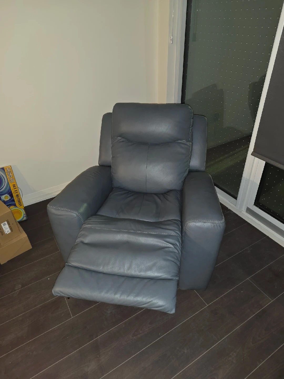 94Selling a comfy grey/blue pure leather recliner chair! It's in great shape and perfect for relaxing after a long day. The material is leather, and it's a nice neutral colour that would fit into any living room. It has a power reclining feature.