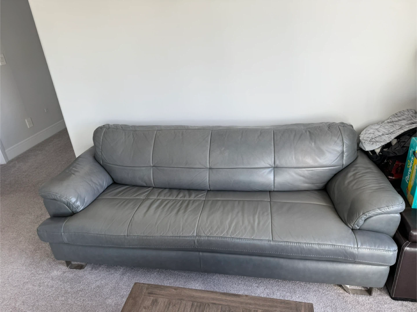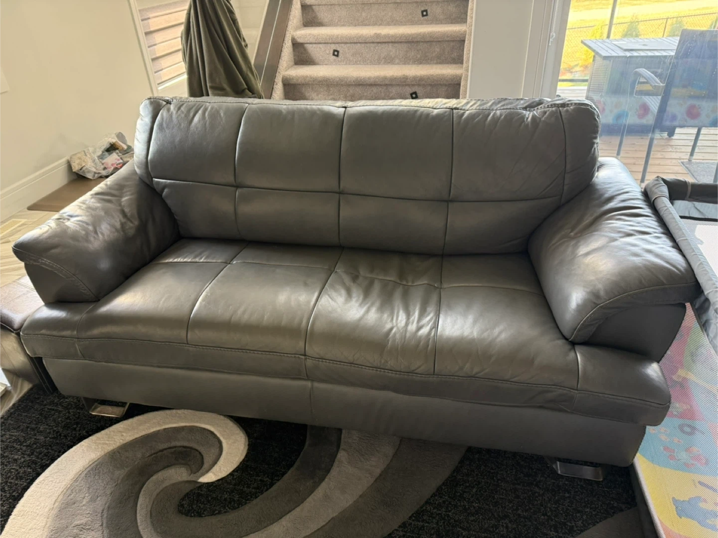 Selling a comfy grey leather loveseat sofa! It's in good condition and perfect for a smaller space or as extra seating in a larger room. The leather is soft and the cushions are supportive, making it a great spot to relax