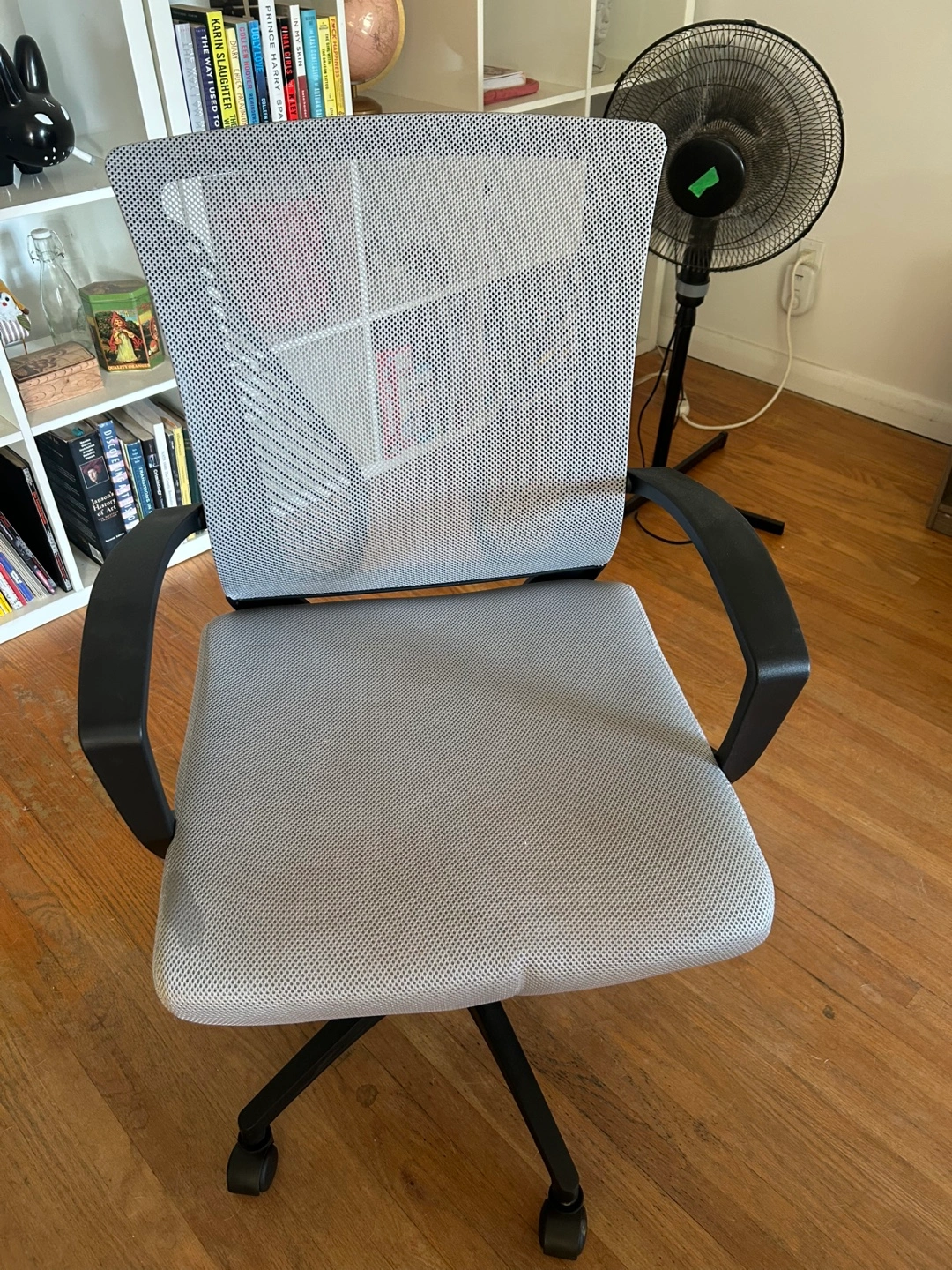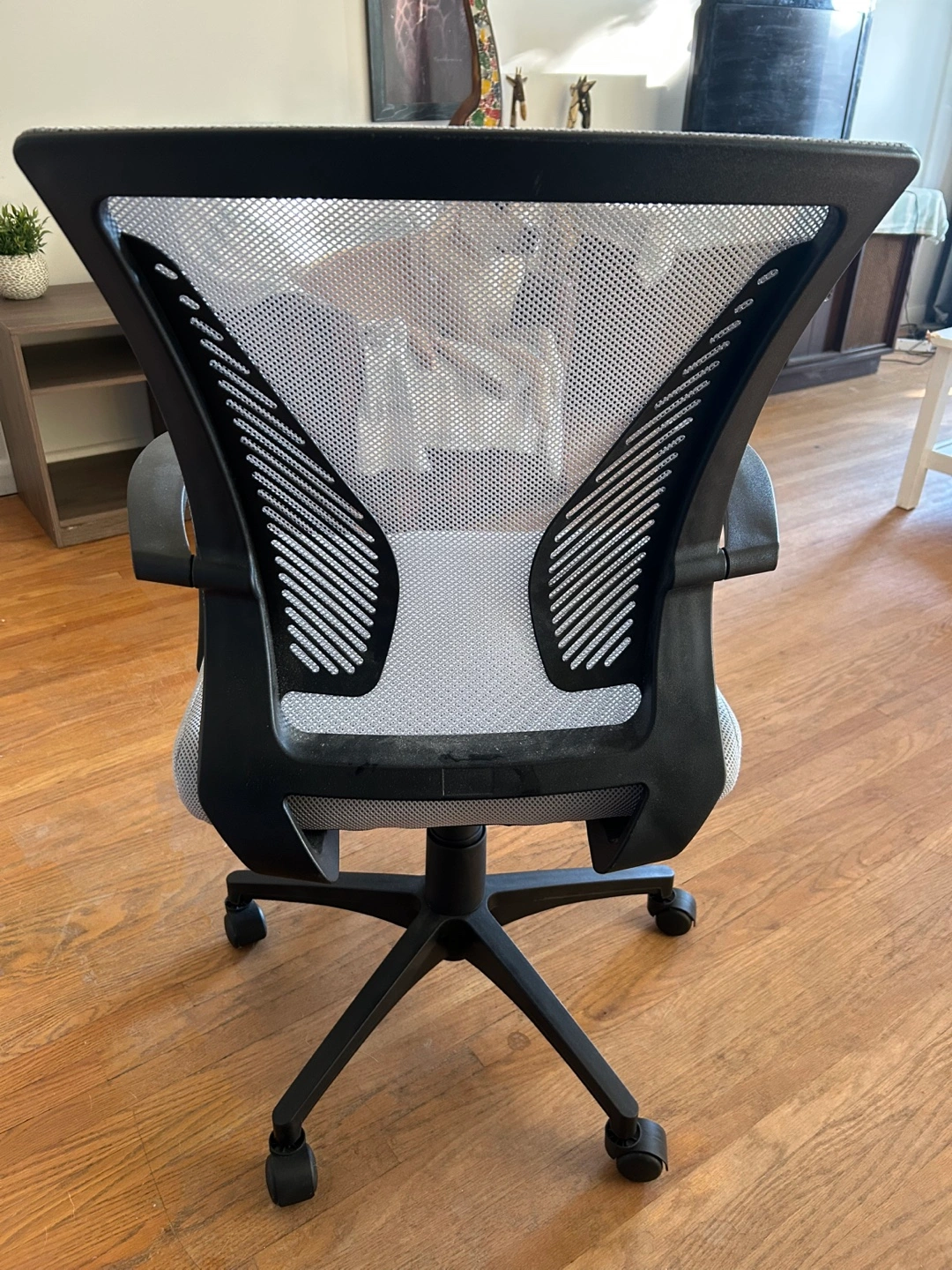 Selling a comfortable grey mesh office chair. It's in great shape and perfect for your home office or study space. The mesh back provides good ventilation, and the adjustable height makes it easy to customize to your needs