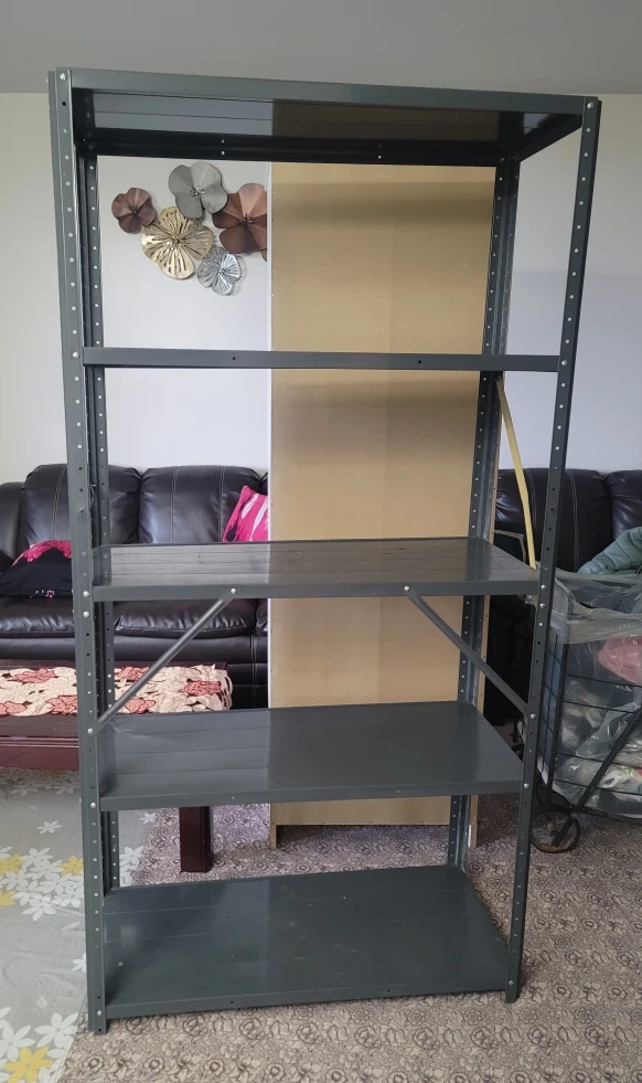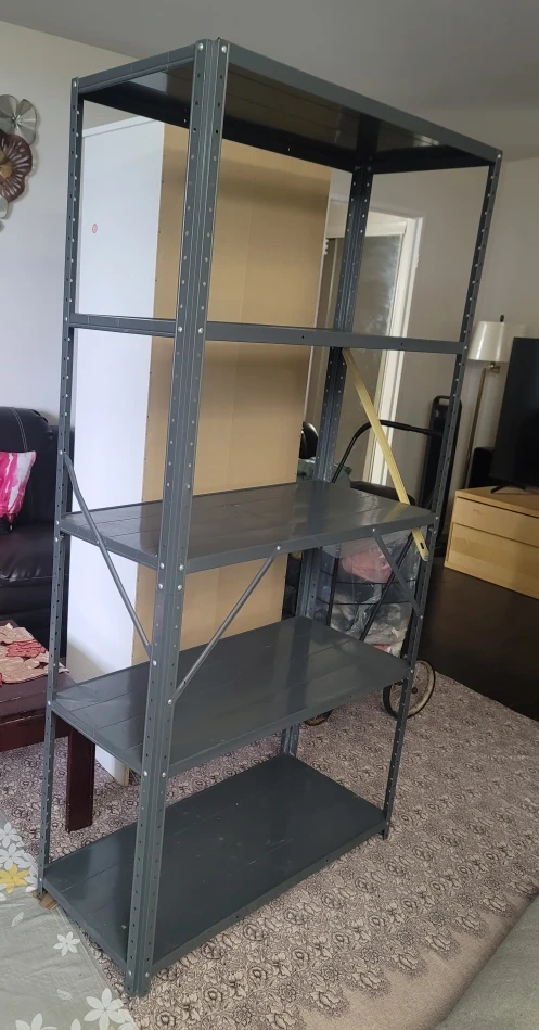 44Selling a grey metal shelving unit. It's in good condition and ready to organize your space! Great for storage in a garage, basement, or anywhere you need some extra shelving