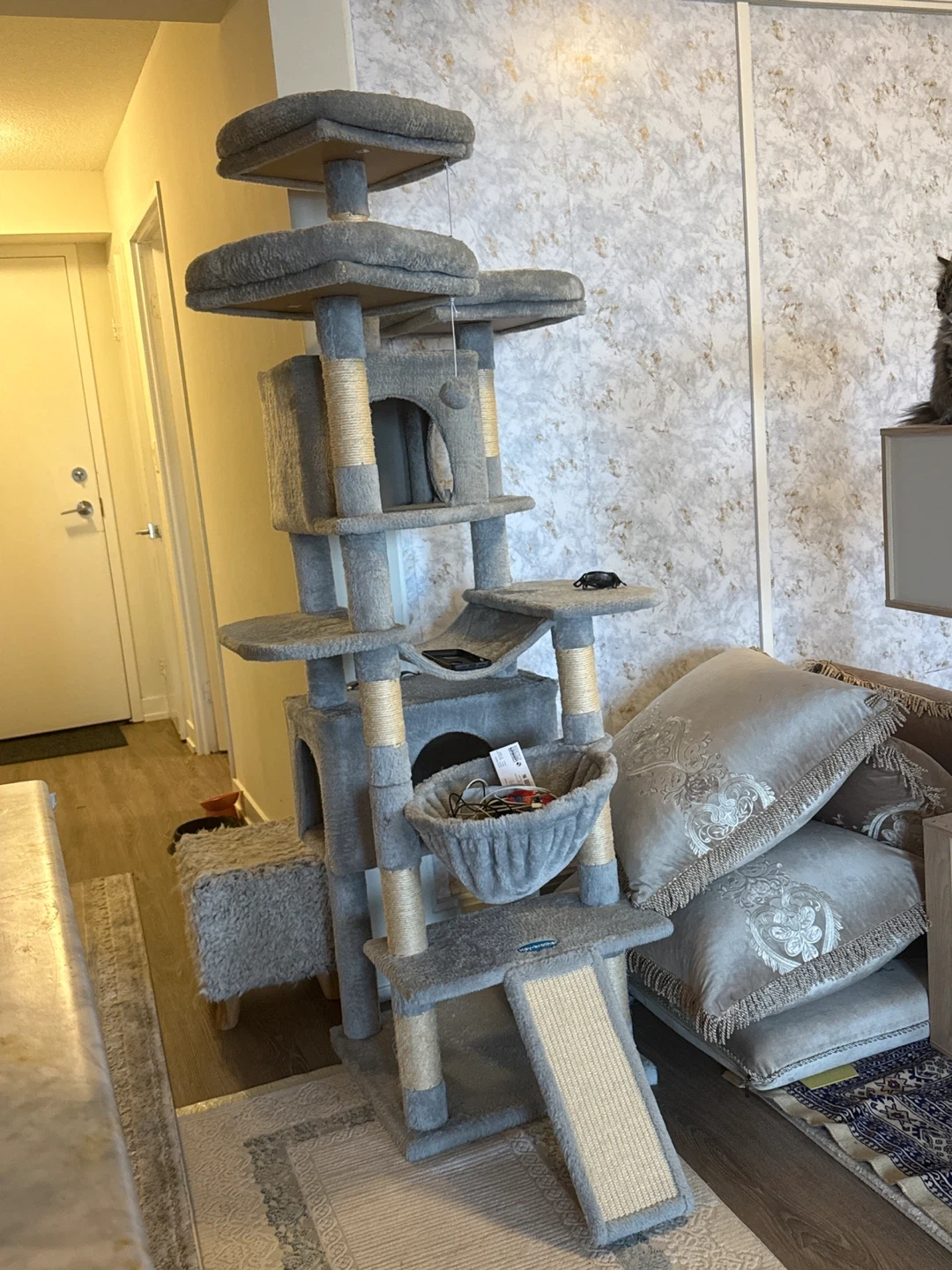 0Selling a multi-level cat tree in great condition! It's grey and has lots of fun spots for your cat to play and relax. Includes scratching posts, platforms, and a cozy hideaway. Perfect for keeping your furry friend entertained!