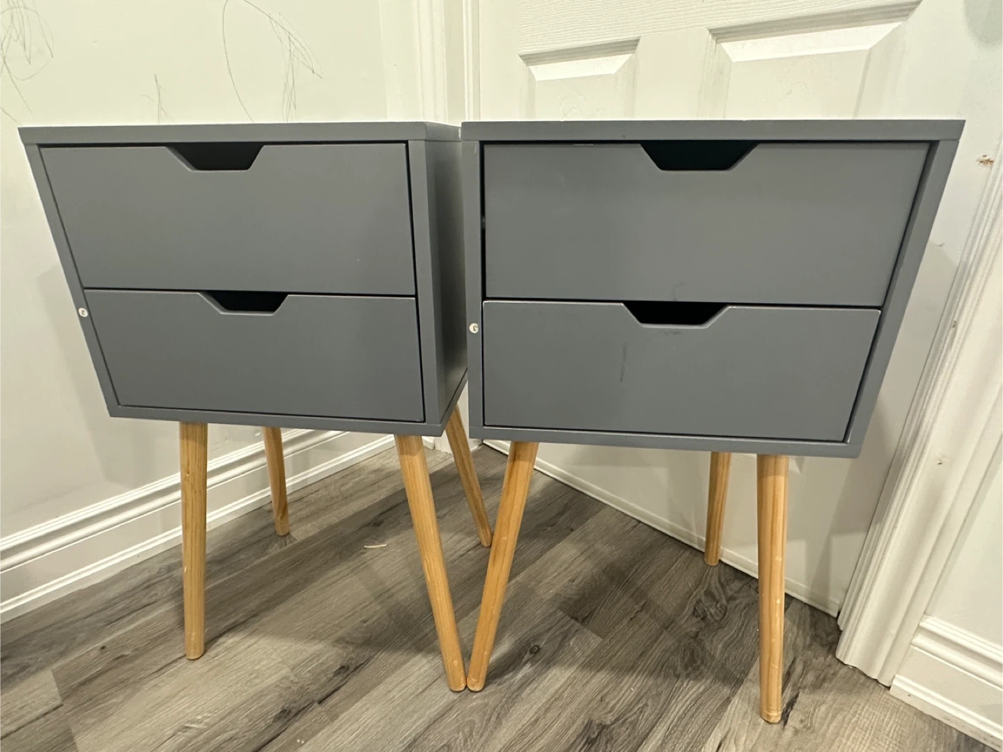 Selling a set of two grey nightstands. They have a sleek, modern design with two drawers each. Perfect for adding storage and style to your bedroom!