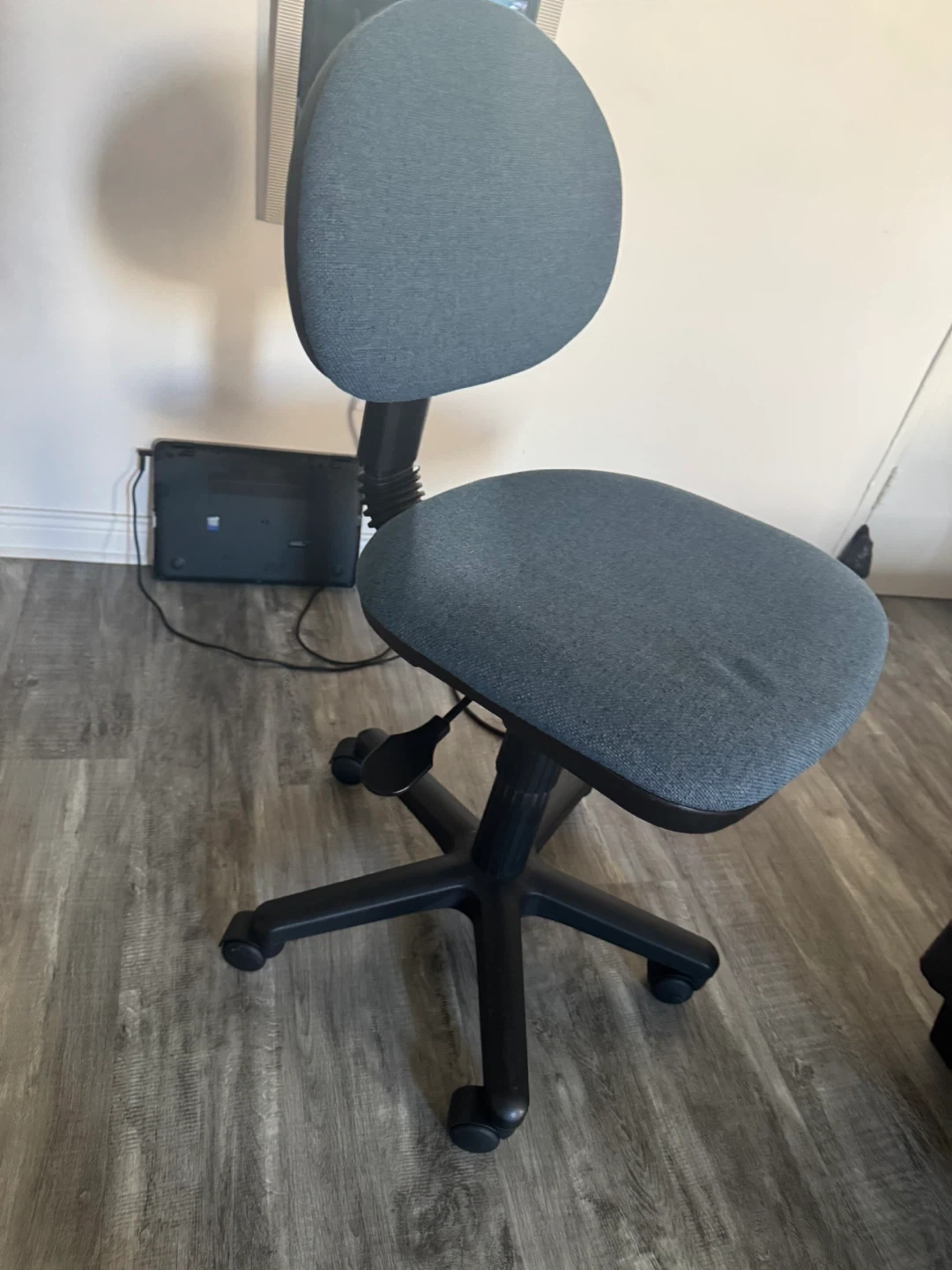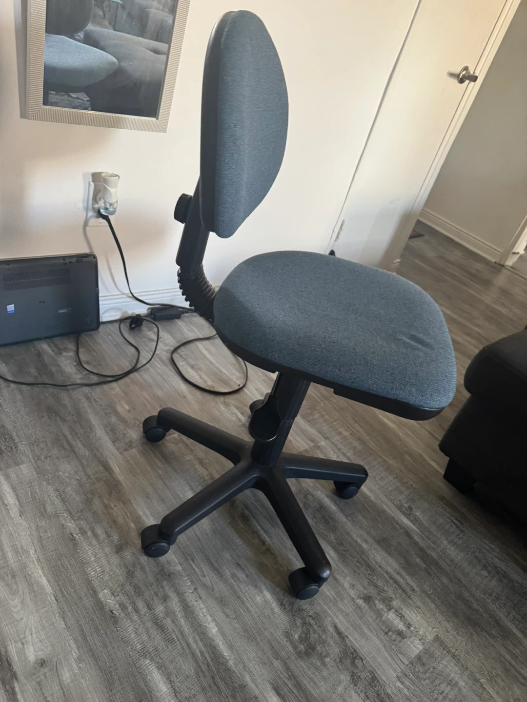 Selling a grey office chair. It's in great condition and ready for a new home office setup. It features a comfortable seat and back, and it's adjustable to your preferred height. Perfect for students or anyone working from home!