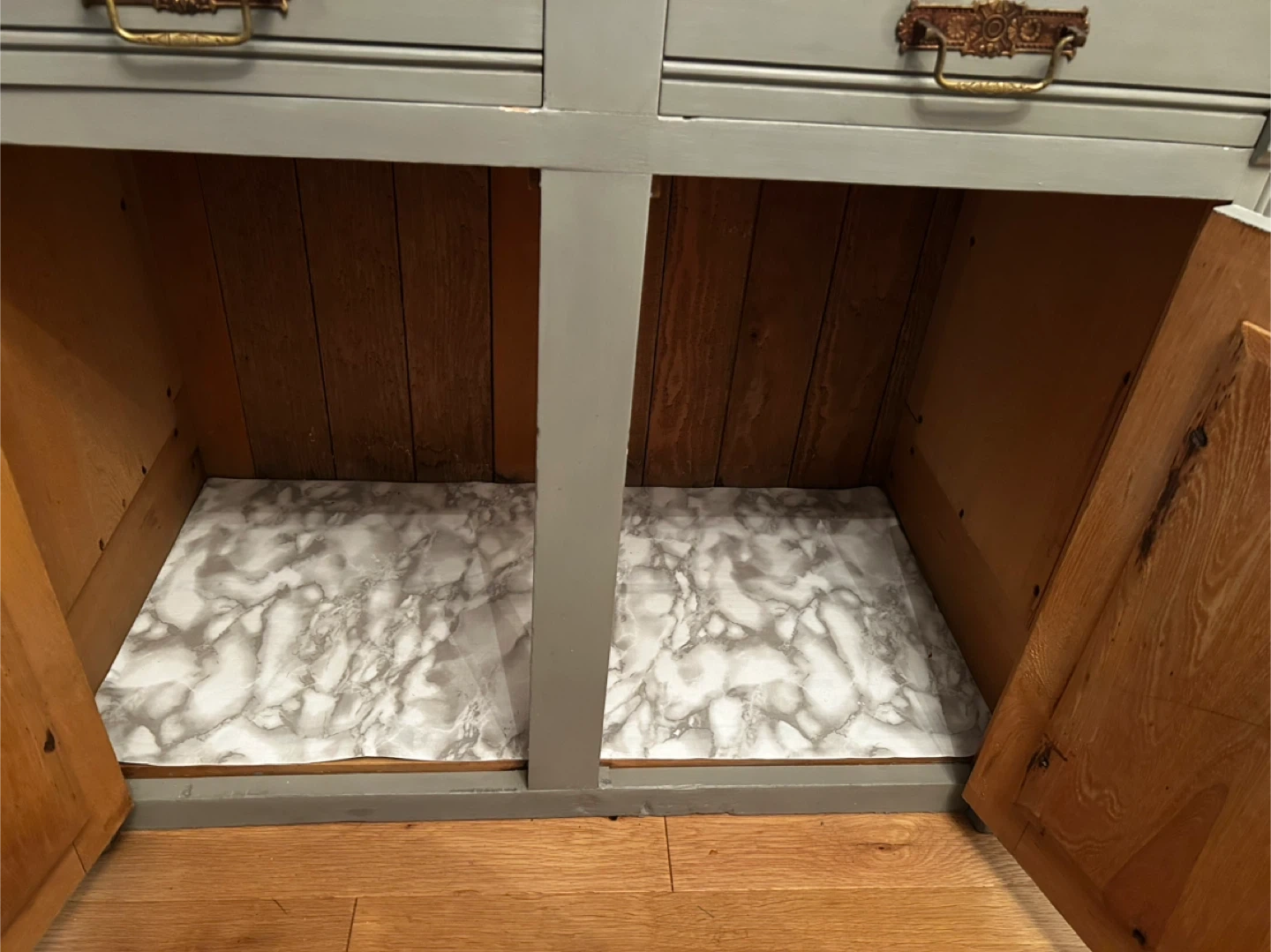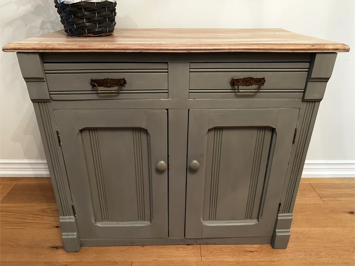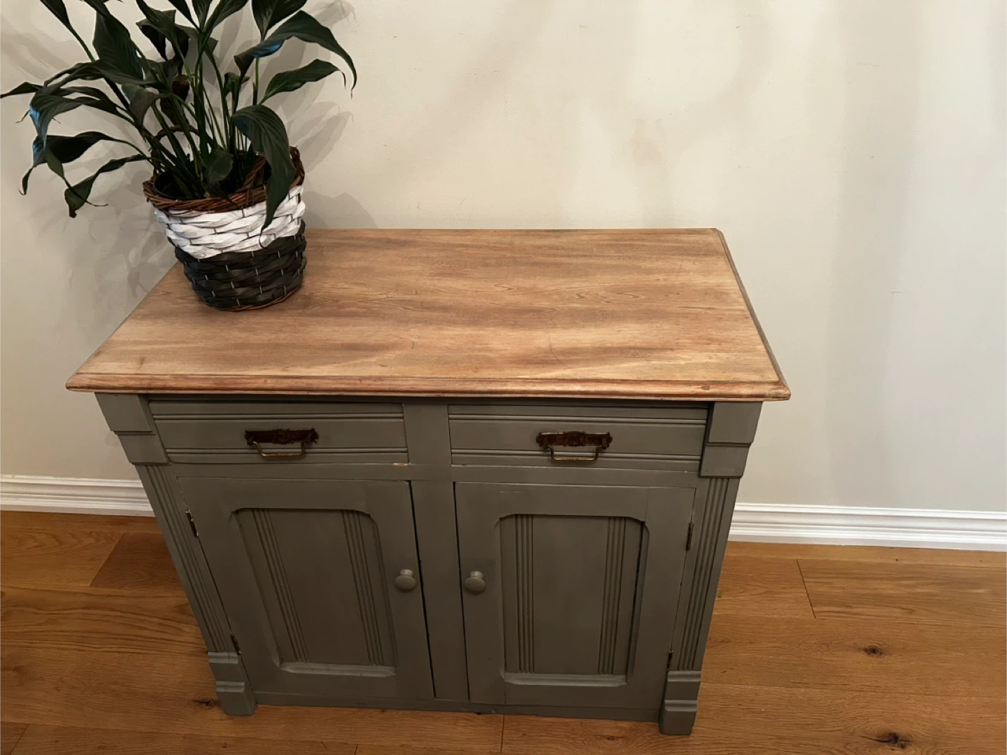 10Selling a charming grey painted cabinet with a natural wood top! It features two drawers and a two-door cabinet, offering ample storage space. The cabinet has been lined with a marble-patterned paper inside. A lovely piece for any room!