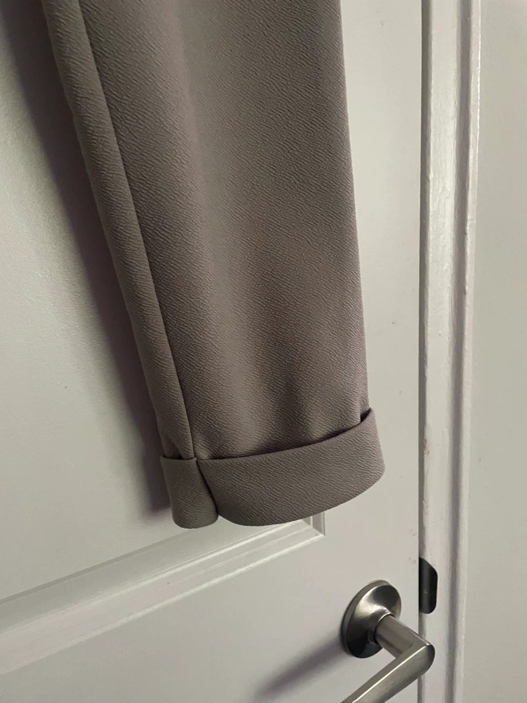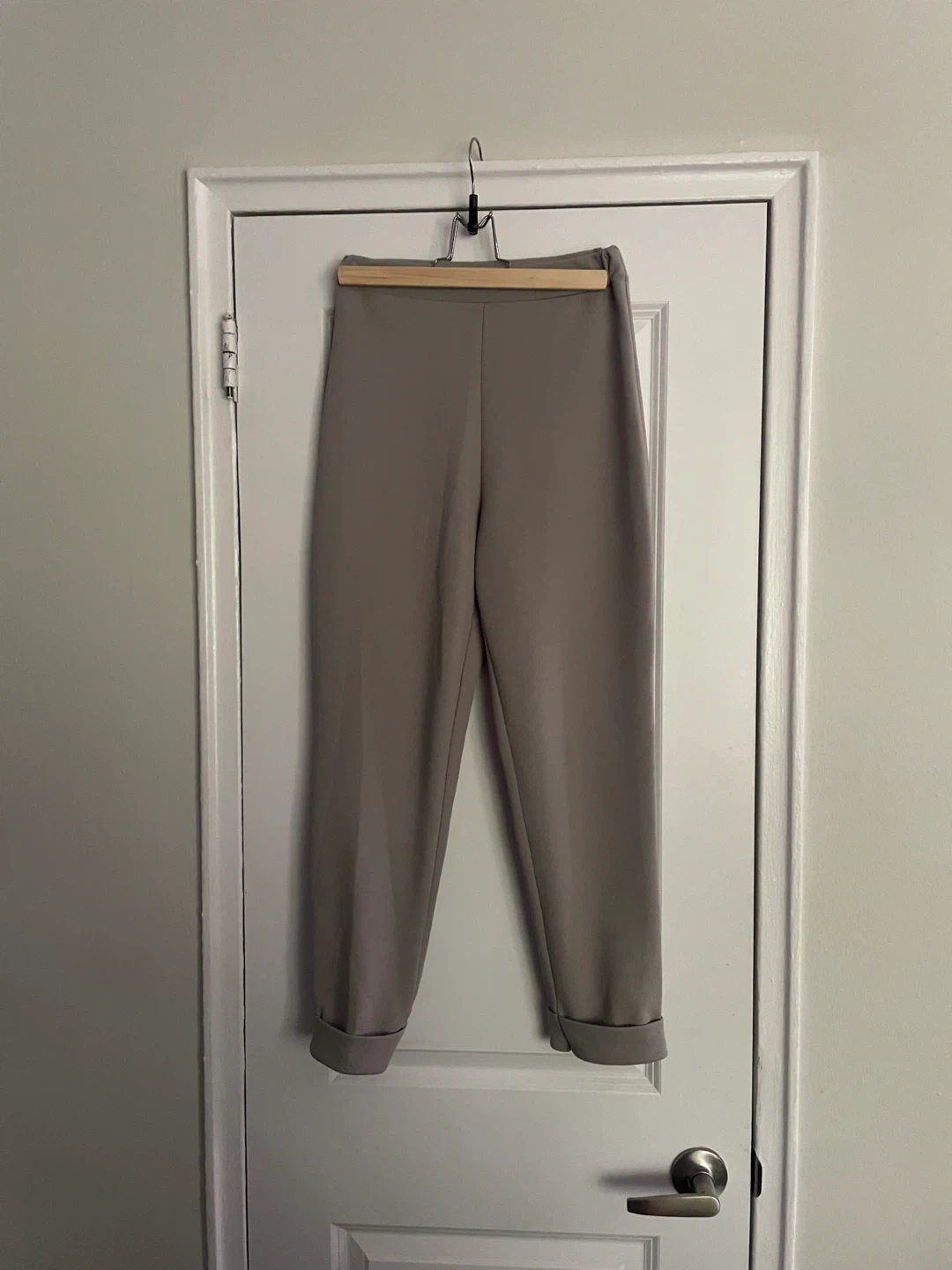 Grey stretchy, crepe-y material crops. High-waisted. Labelled as size 6 - fit is snug for a 6, loose for a 4 - so depends on which fit/look you’re going for. Slightly dressy look.