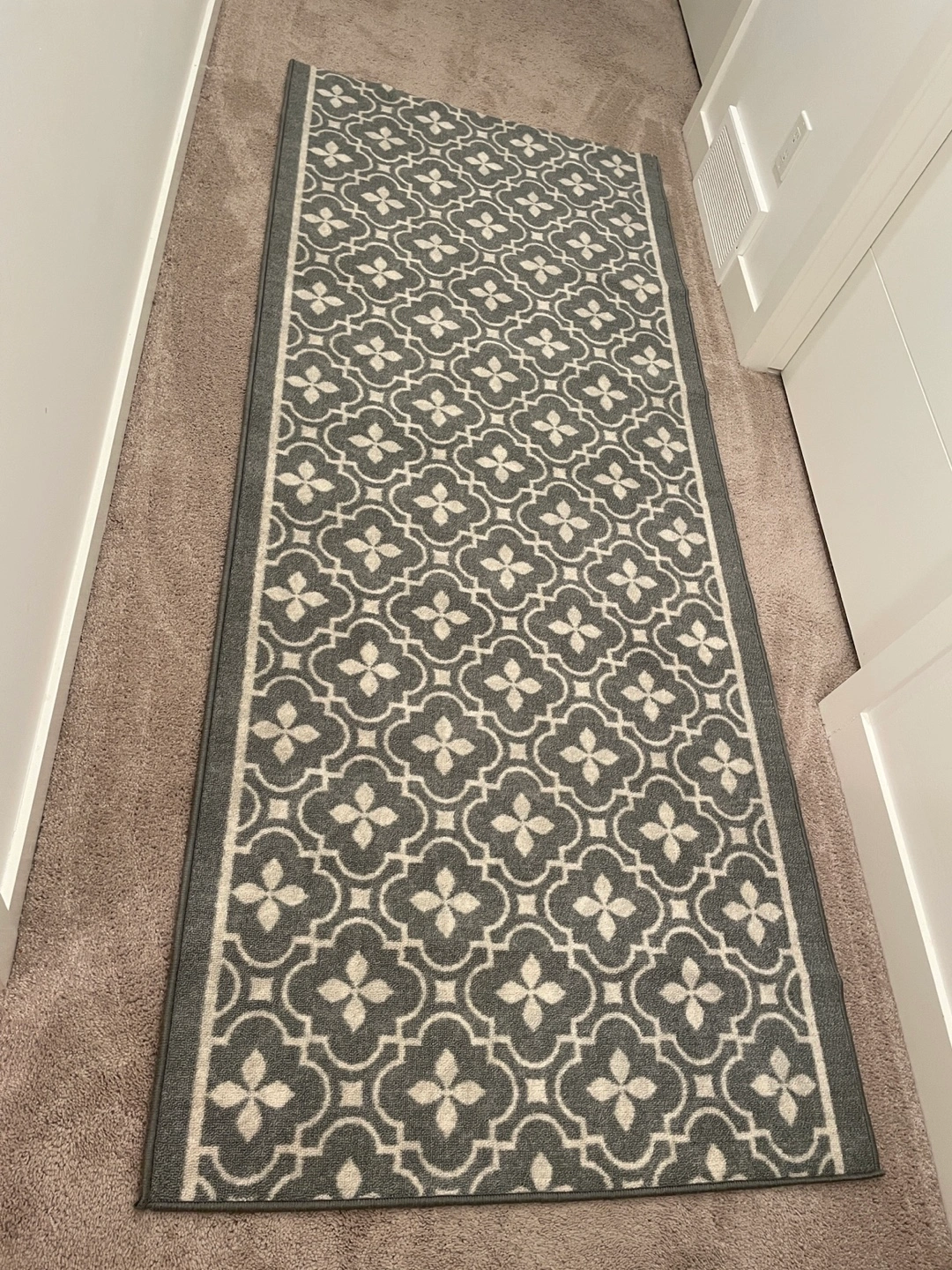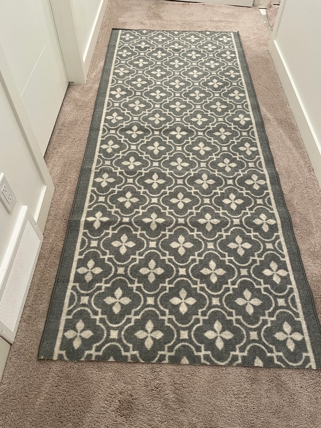 78Grey Patterned Hallway Runner Rug .Selling a grey hallway runner rug with a repeating floral pattern. It's in great condition and would be perfect for adding a touch of style to your hallway or entryway