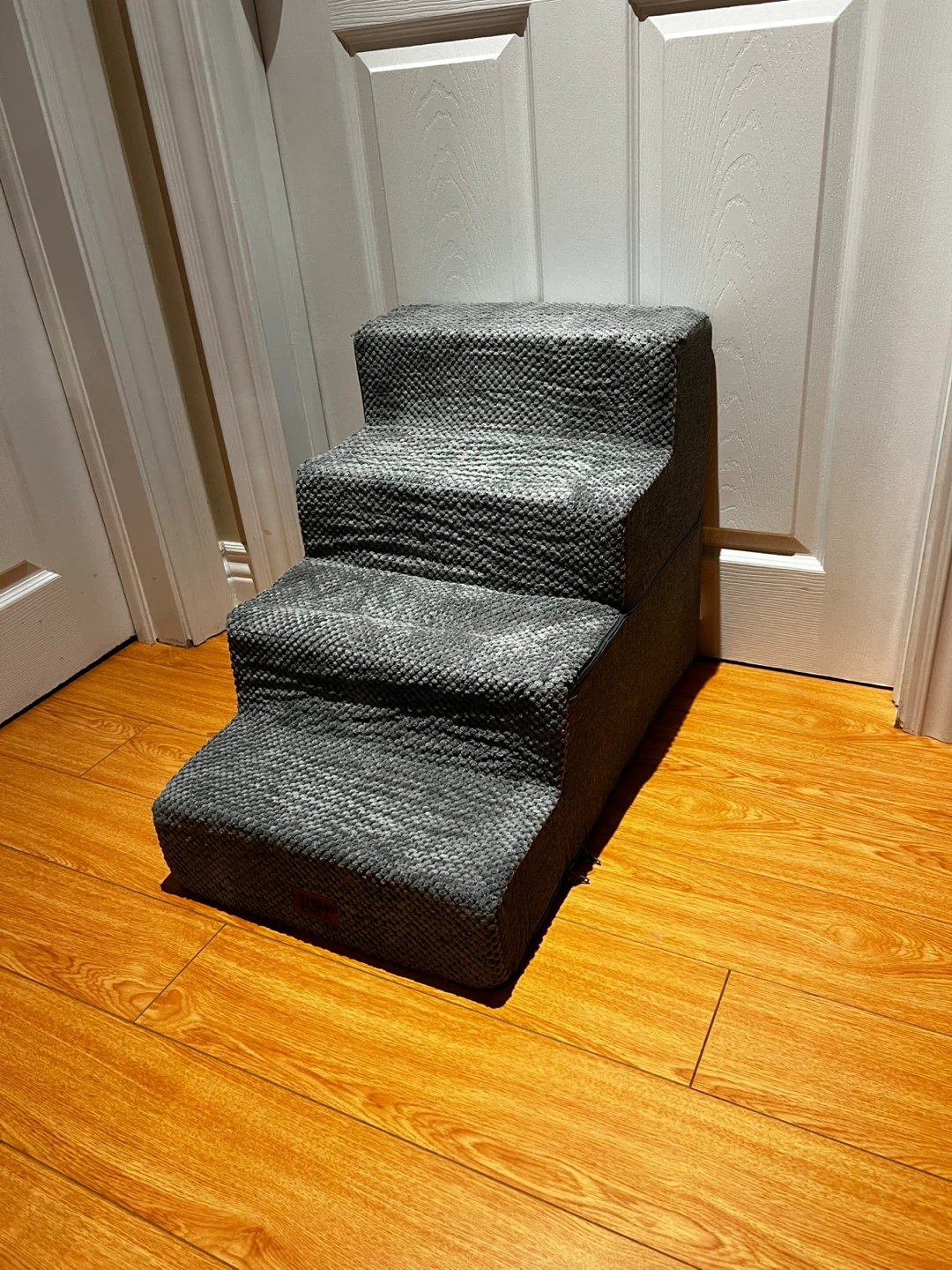 60Selling a set of pet steps, perfect for helping your furry friend reach higher places! The steps are covered in a soft, grey material, making them comfortable and easy to climb. Great for smaller dogs or cats! H16 x W15 x L24