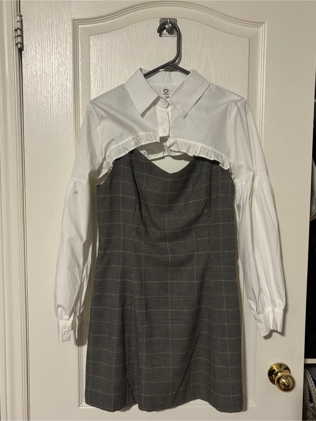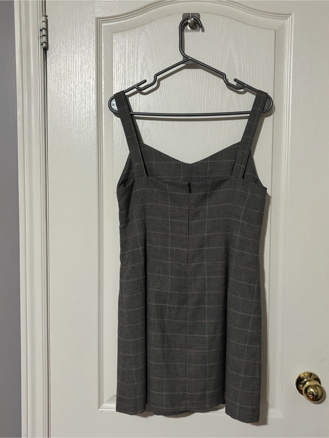 65Here's a cute grey plaid mini dress! It's in great condition and ready for a new home. Perfect for layering or wearing on its own, it's a versatile addition to any wardrobe. Two pieces, including a top