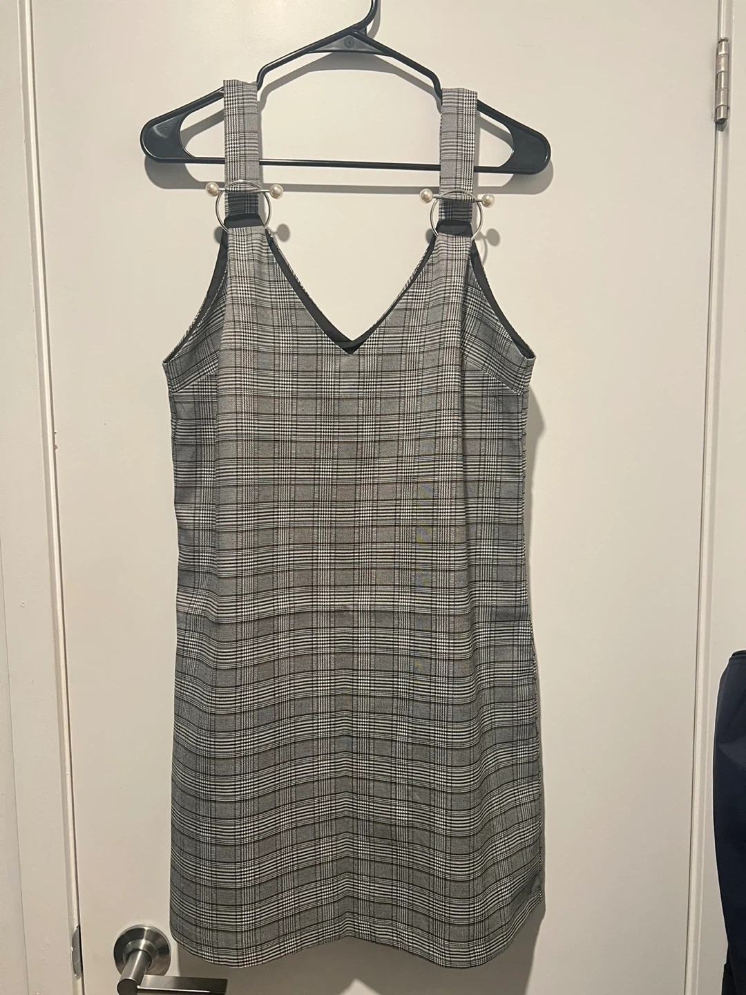 108Size medium Cute grey plaid mini dress! It has pearl details on the straps. Perfect for summer or layering in the fall! Cash only Pickup only