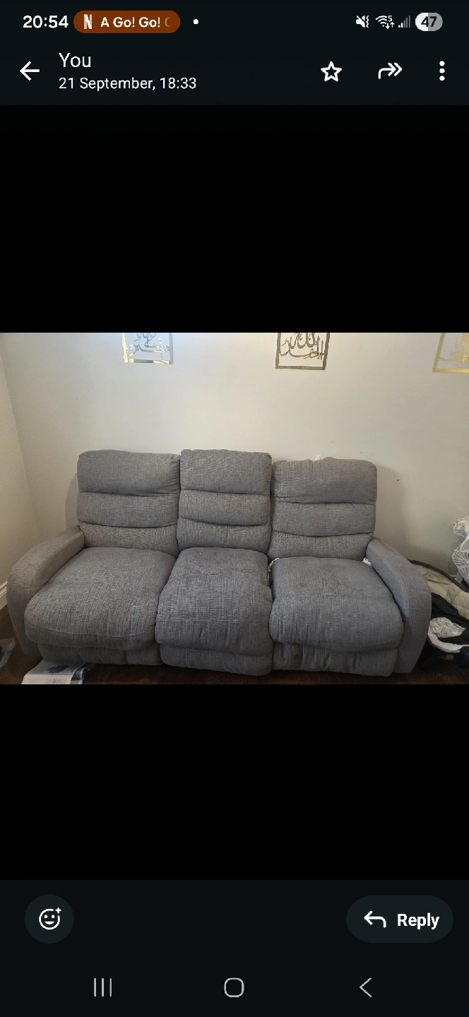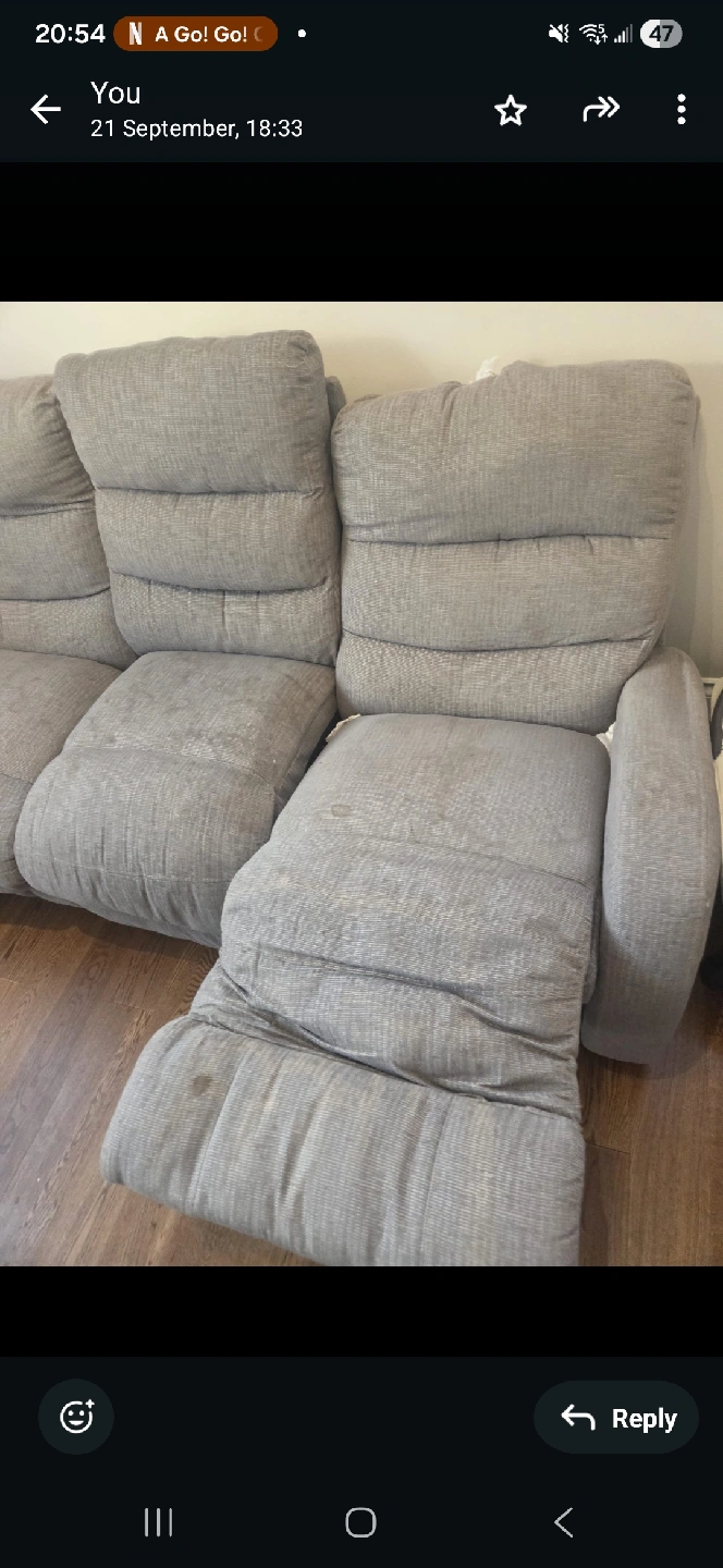 20Comfortable 3-seater recliner sofa in good working condition. All recliners work perfectly. The fabric has a few small tears and some stains, but overall it’s still in good shape and very comfortable. Perfect for a cozy living room or basement setup. Pickup only.