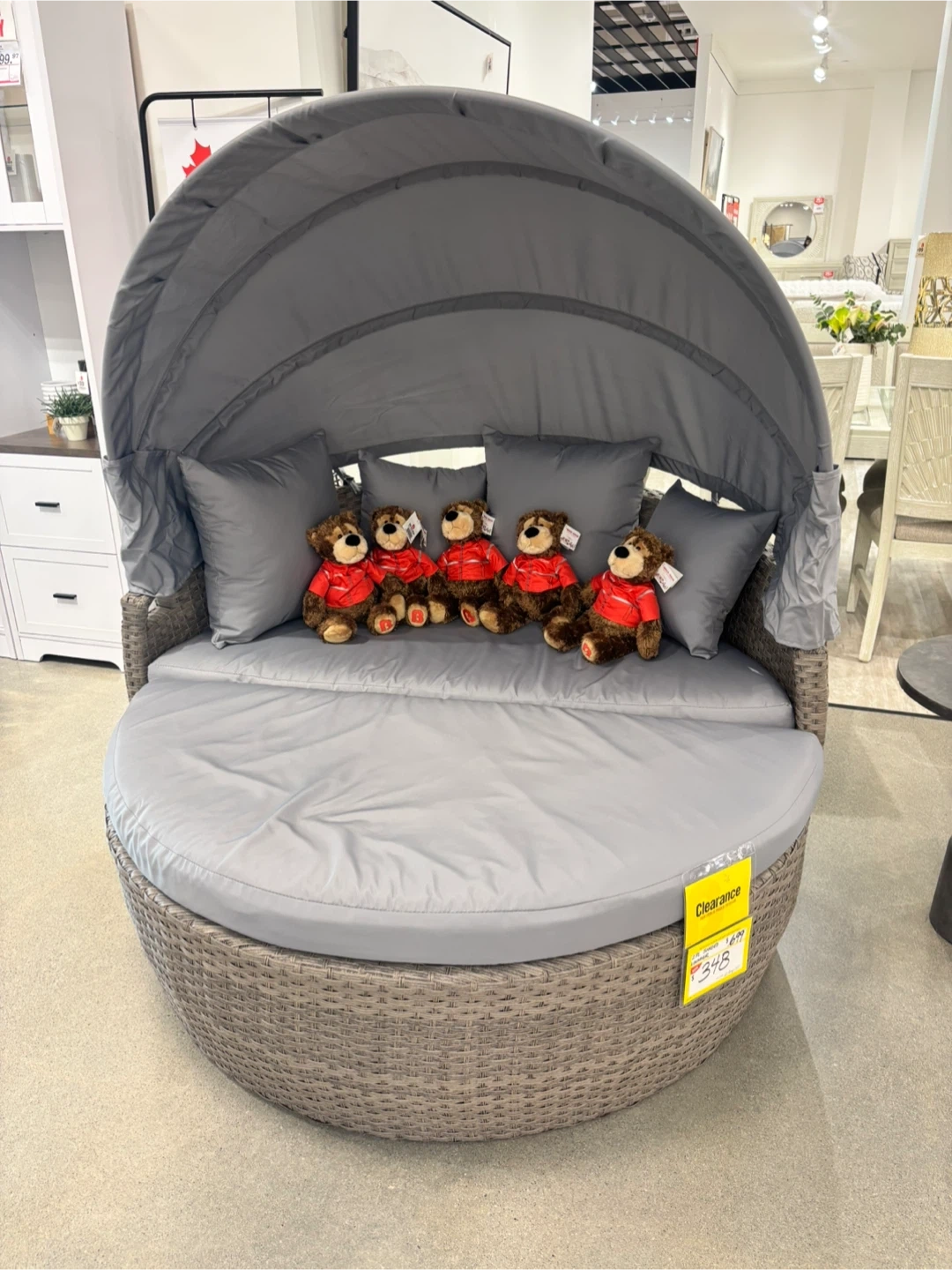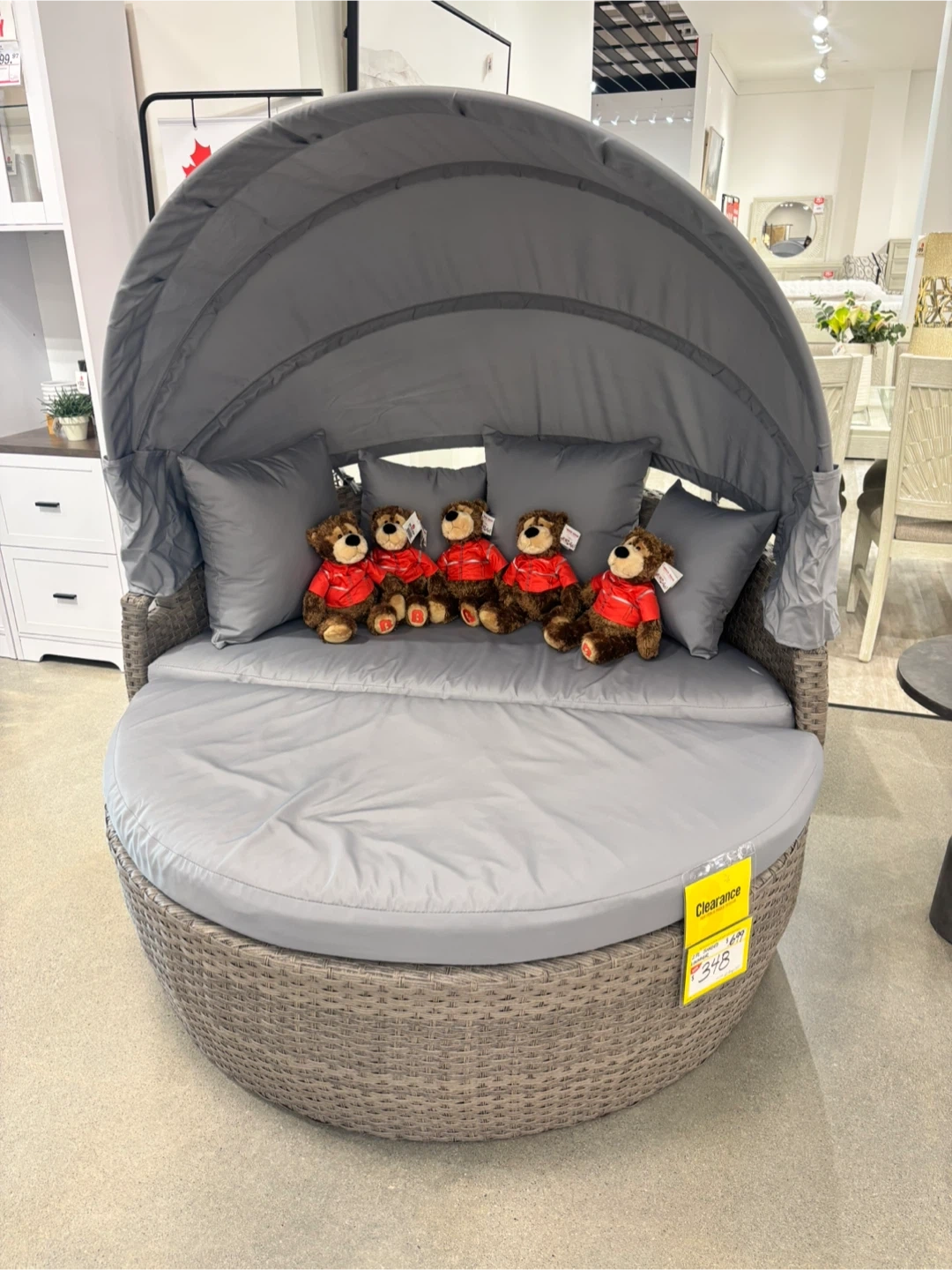 Selling a stylish grey round daybed, perfect for relaxing outdoors or indoors! It features a comfortable cushioned seat and a canopy for shade. The woven wicker base adds a touch of elegance to any space. Originally marked at $348.