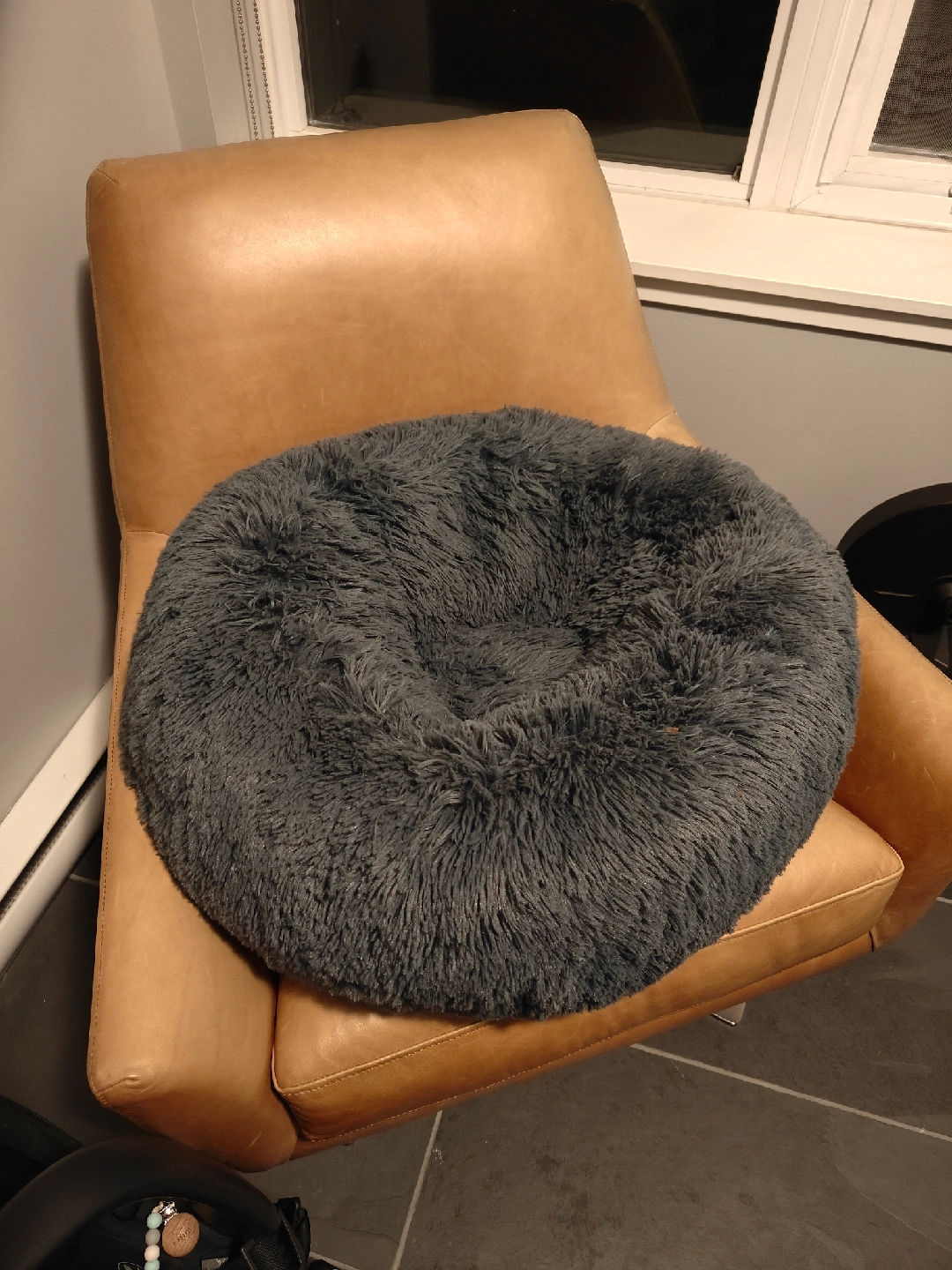 Selling a comfy grey round plush pet bed! It's in great condition and ready for a new furry friend to enjoy. Perfect for cats or small dogs who love to curl up in a soft, cozy spot. Diameter is 23 inches.