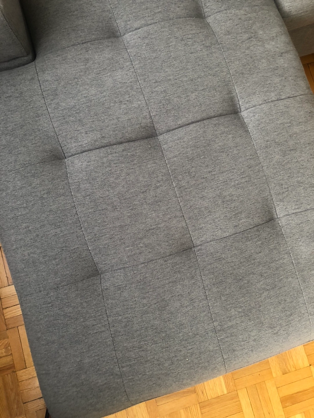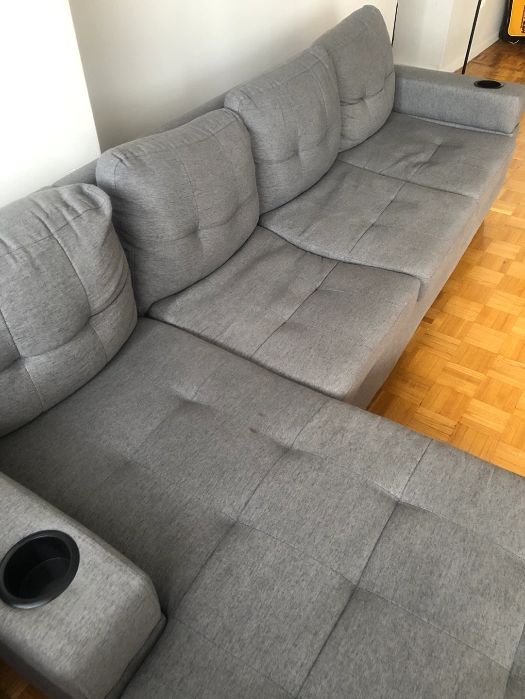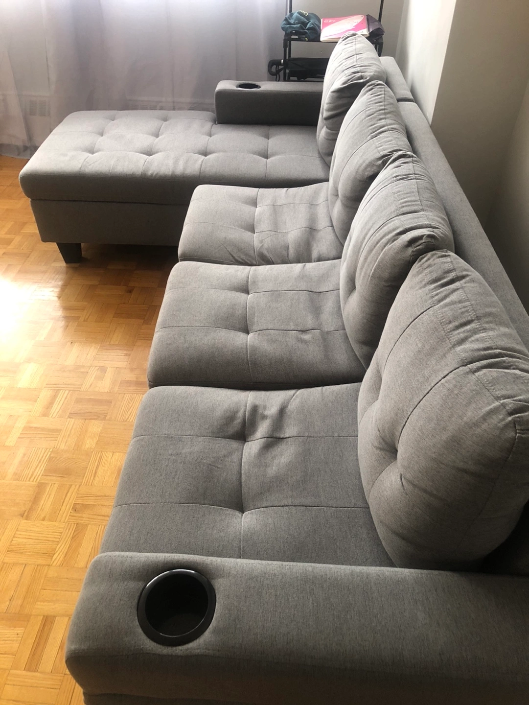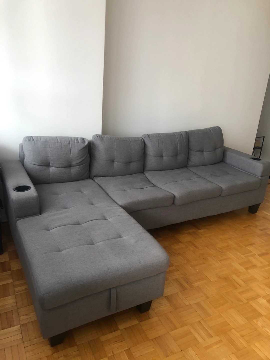 10Comfortable grey fabric sectional sofa. Features a chaise lounge and cup holders on both sides. Good for apartments or smaller spaces. Pet and smoke free Pickup only Moving out