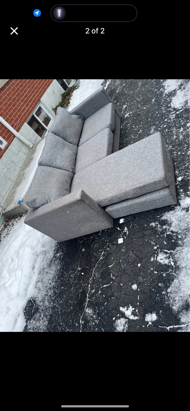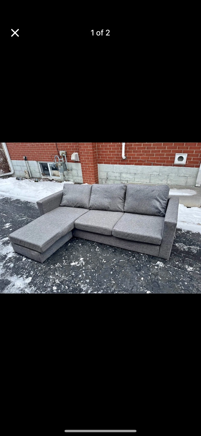 15Comfortable grey sectional sofa. Three-seater with chaise lounge. Fabric upholstery. Good condition. Perfect for living room.