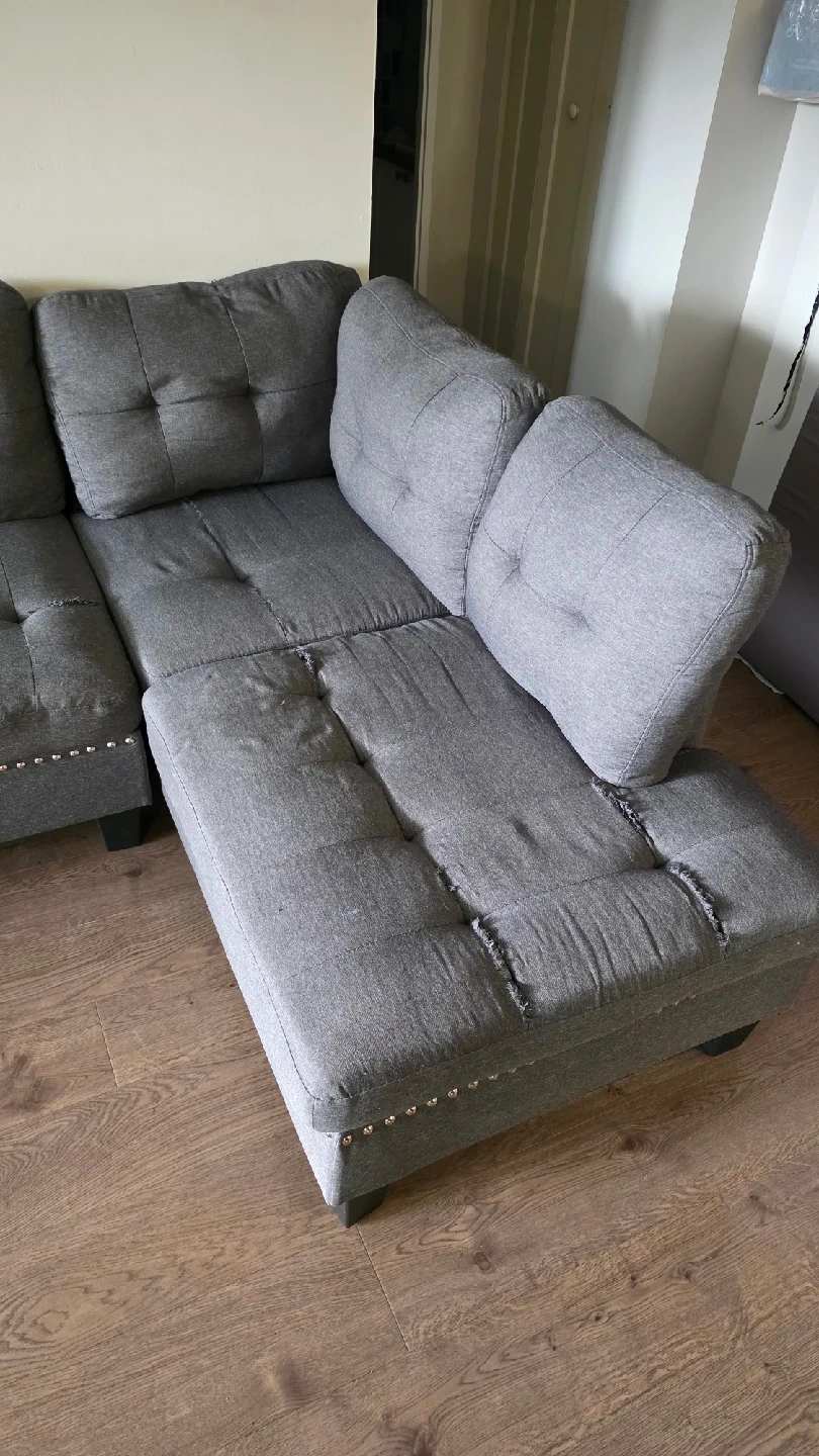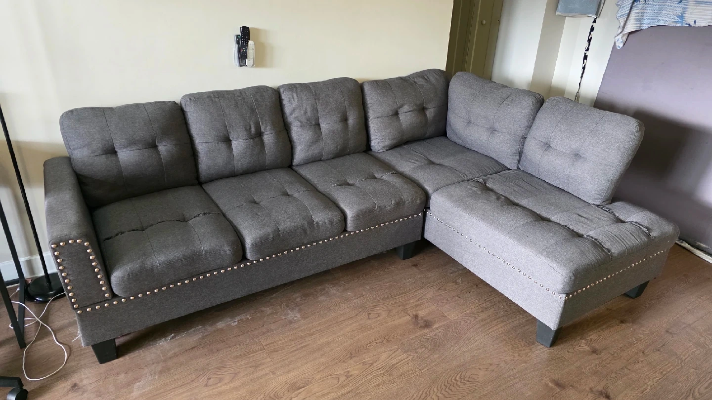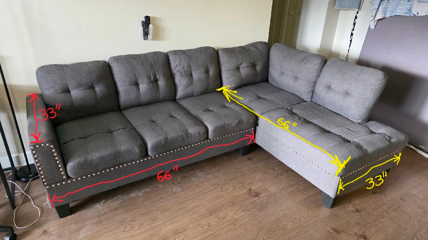 60Modern L-Shaped Sectional Sofa with Chaise Lounge. Size: Sofa Base: 33" D X 66" W Sectional Base: 33" D X 66" W Moving out sale!!! Wear: Used condition with notable wear and tear, mainly snagging/pulls on the tufted seams of the chaise cushion (see close-up photos). The structure and back cushions are still good. Tip: This sofa is perfect for someone looking for a great deal on a modern piece. It would look brand new with a universal sofa cover (easily purchased online for around $30-$40). Purchased 6 months ago.