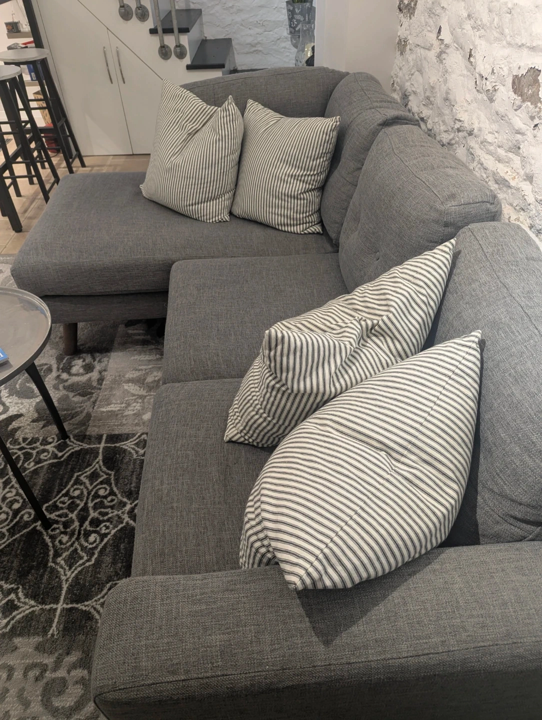 92Selling a comfy grey sectional sofa. It comes with the bespoke pillows shown in the pictures. It's in great condition and would be perfect for a living room or den. It's a great spot to relax and watch movies or read a book! Comes from a Non smoking adult only home.