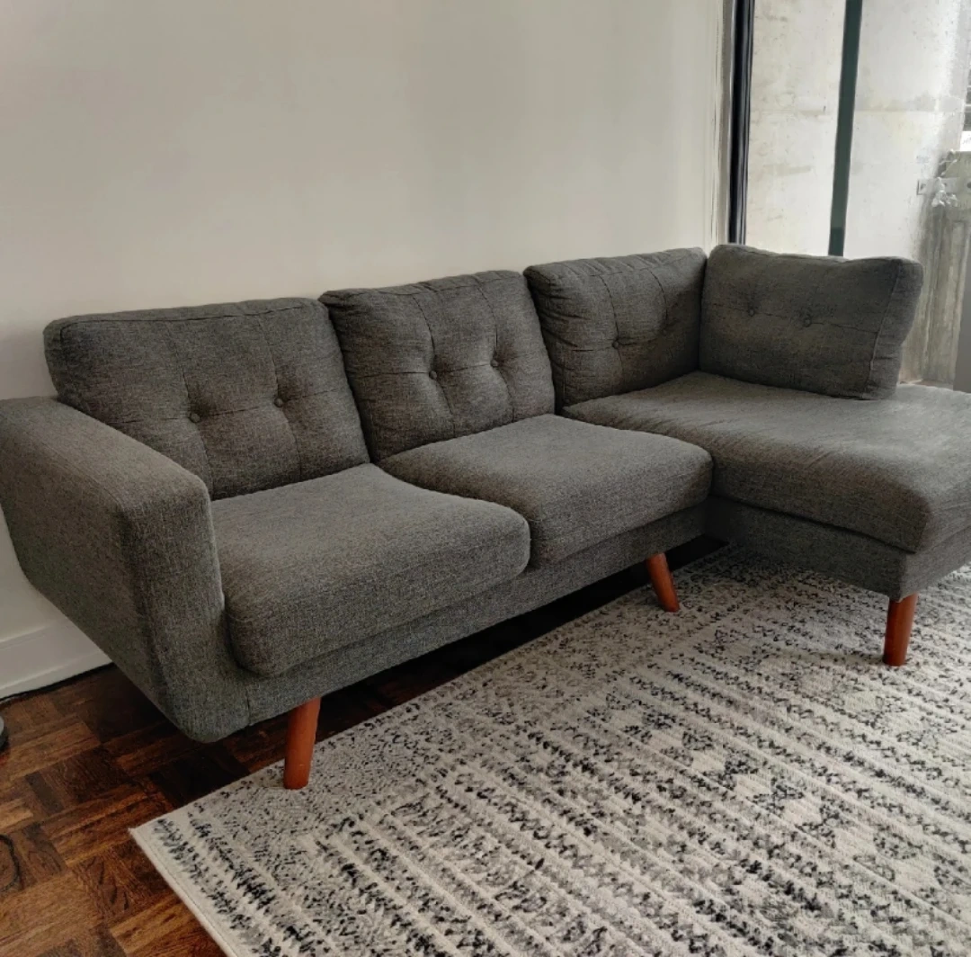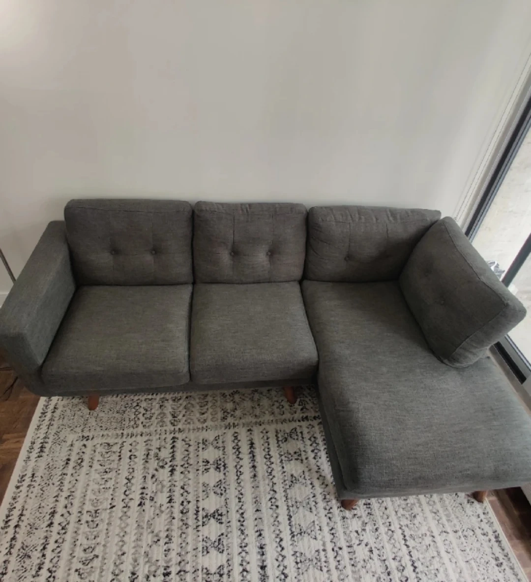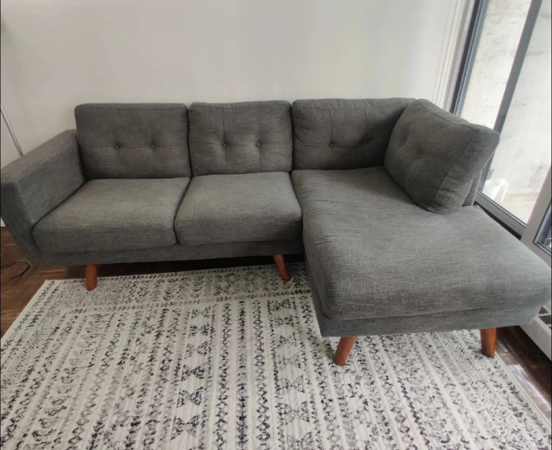 5Selling a comfy grey sectional sofa with a chaise lounge! It's in great shape and would be perfect for a living room or den. The chaise is super comfortable for lounging. It's a great piece to add to your home Margot is a classic sectional sofa inspired by Mid-Century Modern design, with its clean lines and tailored cushions for a buttoned-up sense of elegance. Sit upright, or relax on this tuxedo-style sofa with tufted-back cushions that promise firm support and extra comfort with a luxurious right arm chaise. This is versatile seating at its finest, fashioned from bespoke synthetic fabric that makes it easy to choose complementary companion pieces to complete your living space. PRODUCT DIMENSIONS: Width: 213 cm (84") Height: 86 cm (34") Depth: 136 cm (54")