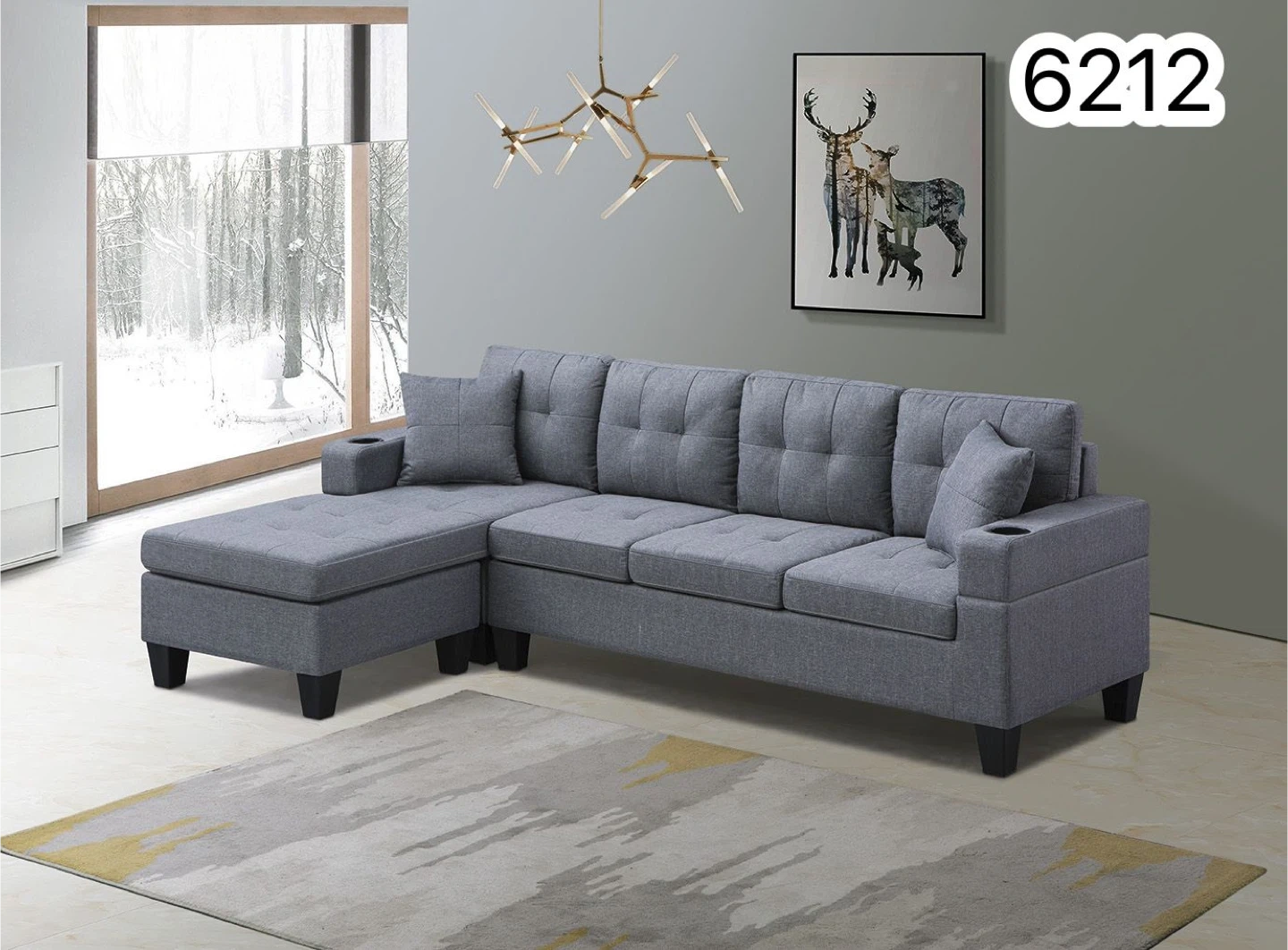 15Selling a comfy grey sectional sofa! It features a chaise lounge and convenient cup holders on the sides. Perfect for relaxing in your living room or entertainment space. The material is a soft, durable fabric, and the cushions are nice and plush