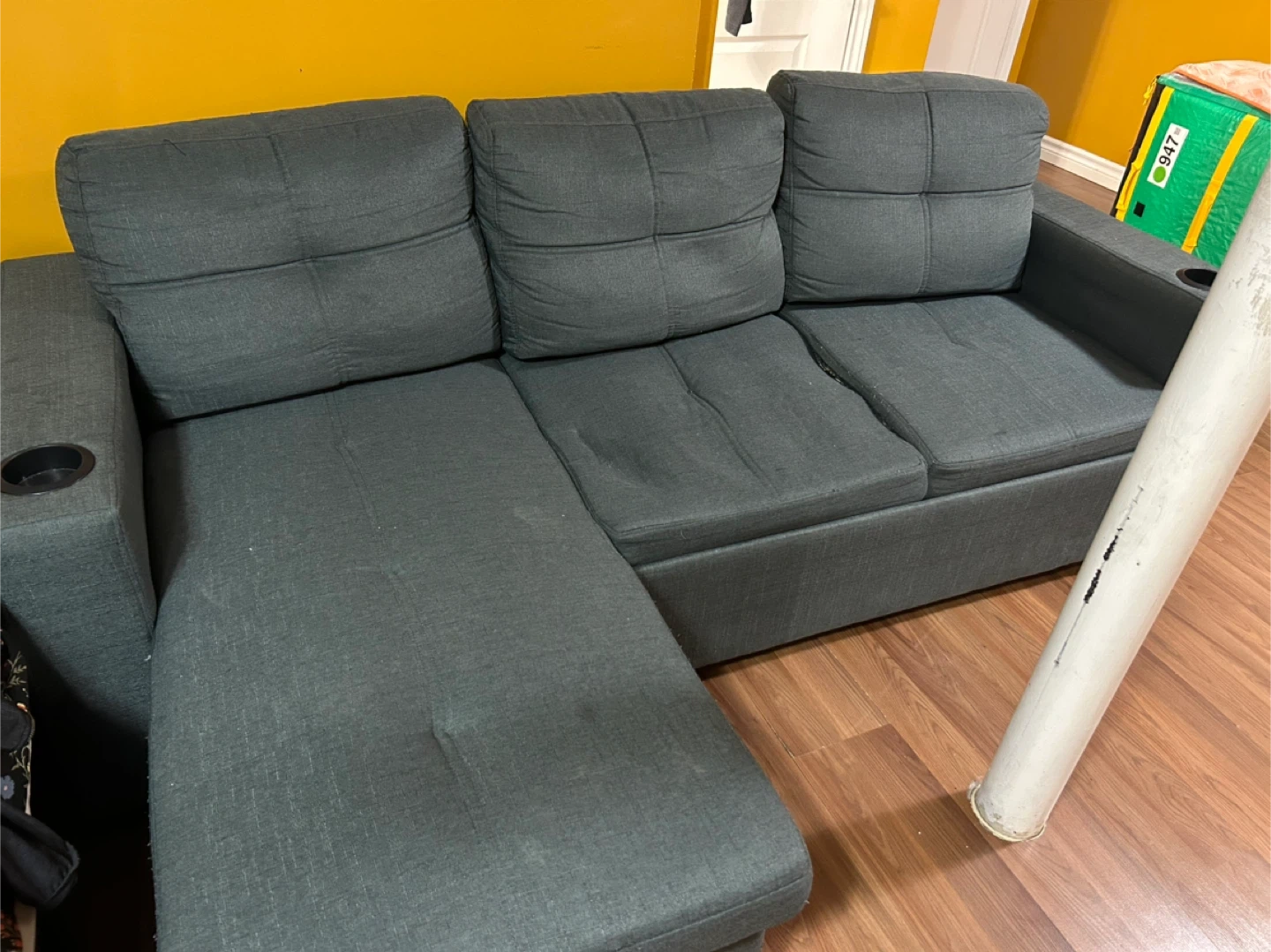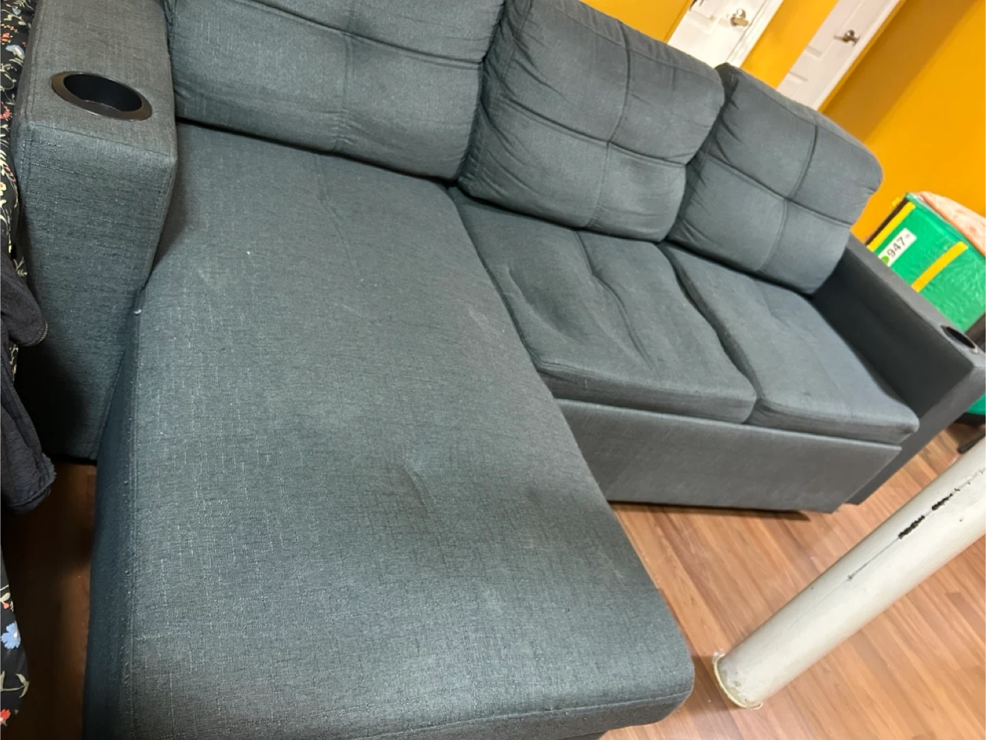 10Selling a comfy grey sectional sofa, perfect for lounging! It features a chaise on one side for extra relaxation and built-in cup holders on the armrests for your convenience. This sofa is in good condition and ready to find a new home
