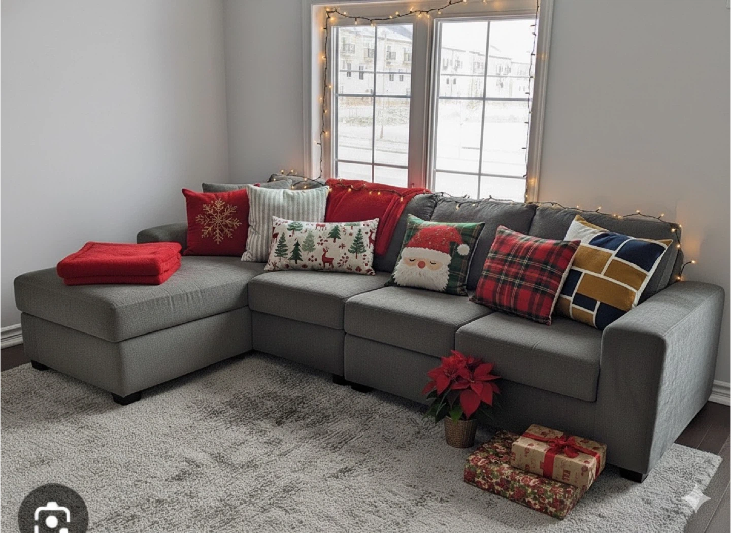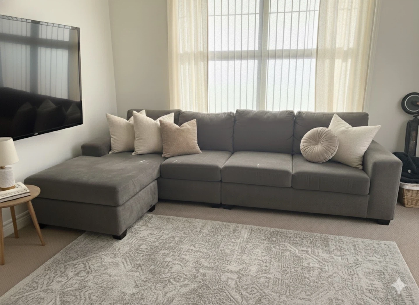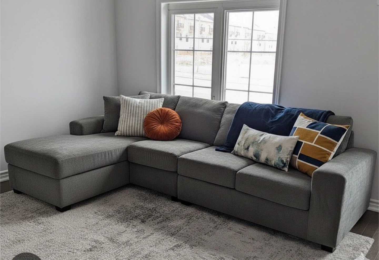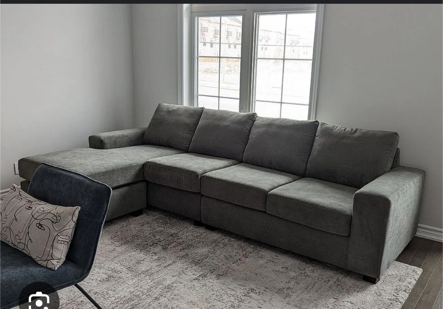 60Selling a comfy grey sectional sofa! It features a chaise lounge on one end, perfect for relaxing. The sofa appears to be in great condition and would be a welcome addition to any living room