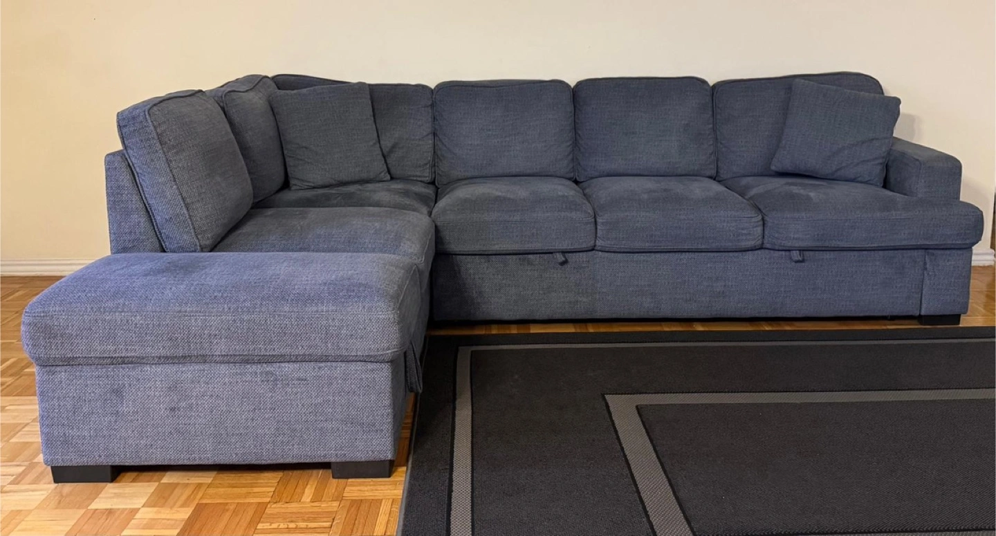 15Selling a comfy grey sectional sofa! It features a chaise lounge for extra relaxation. The sofa appears to be in good condition and would be a great addition to any living room. Perfect for lounging and movie nights!