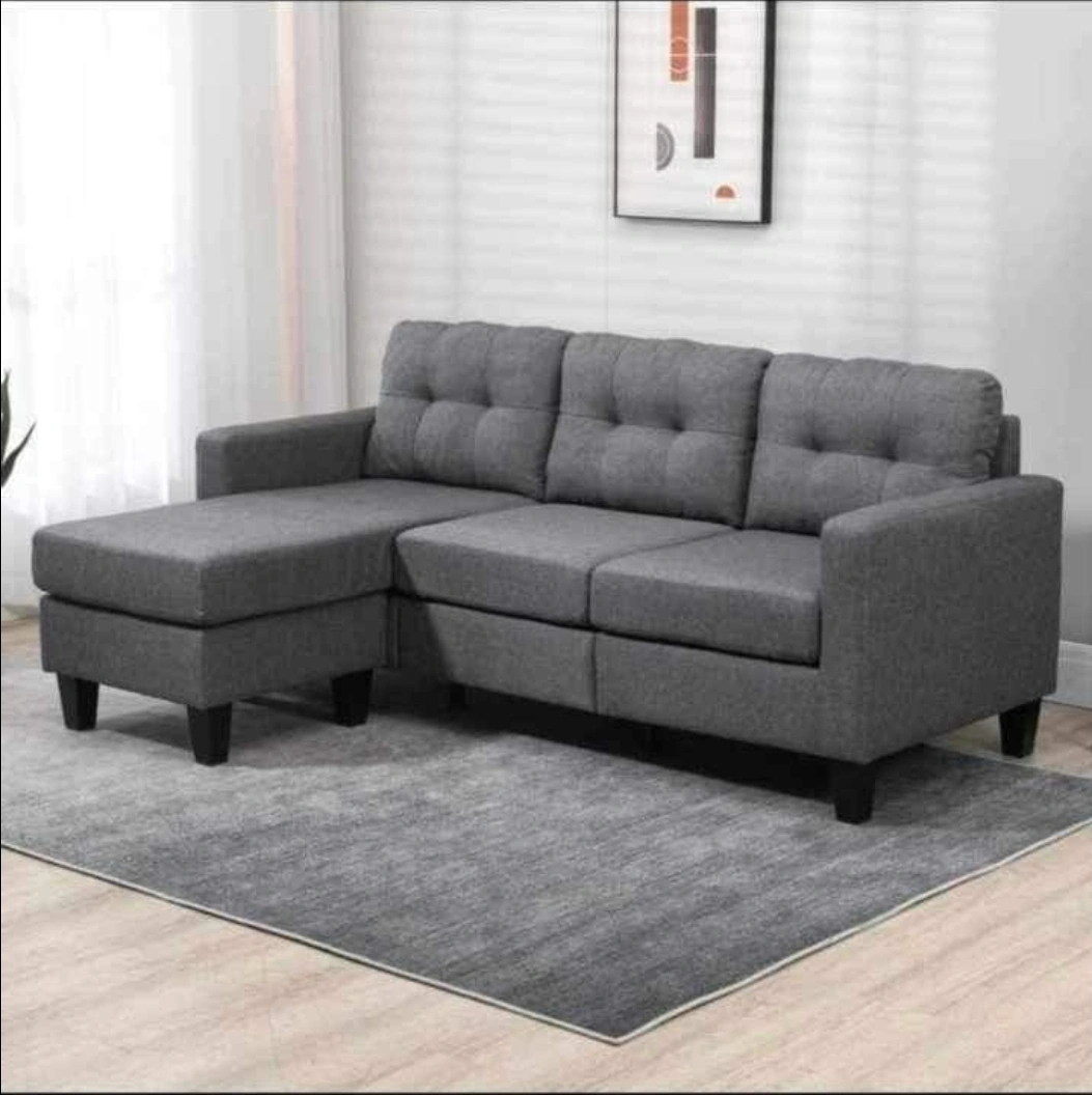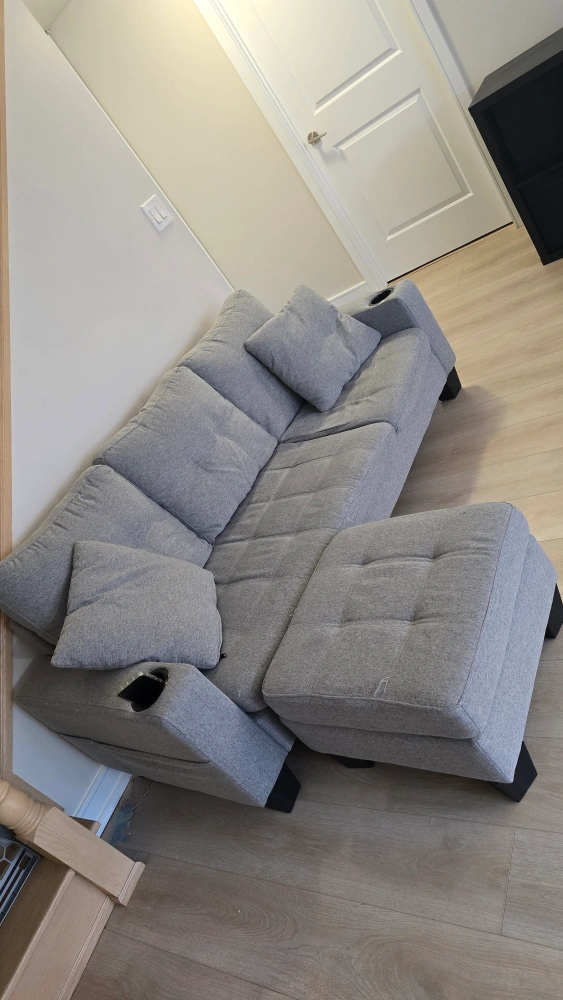 Location: Downtown Toronto Price: $250 CAD (negotiable) $ Beautiful modern grey sectional sofa with matching ottoman. Used only 3 months - in like-new condition (no stains, no damage, no pets, non-smoking home). Convertible design: chaise can be placed on either side (left or right). Comfortable and sturdy with cup holders on each armrest. + Perfect size for condos or apartments. Dimensions: Width: 76.8 in (195 cm) Depth: 55.1 in (140 cm) Height: 33.5 in (8 Seat heiaht. 18 1 in (46 cm) Chaise length: 45.3 in (115 cm) Reason for selling: I bought a larger sofa to fit my big family. Easy to assemble and clean.