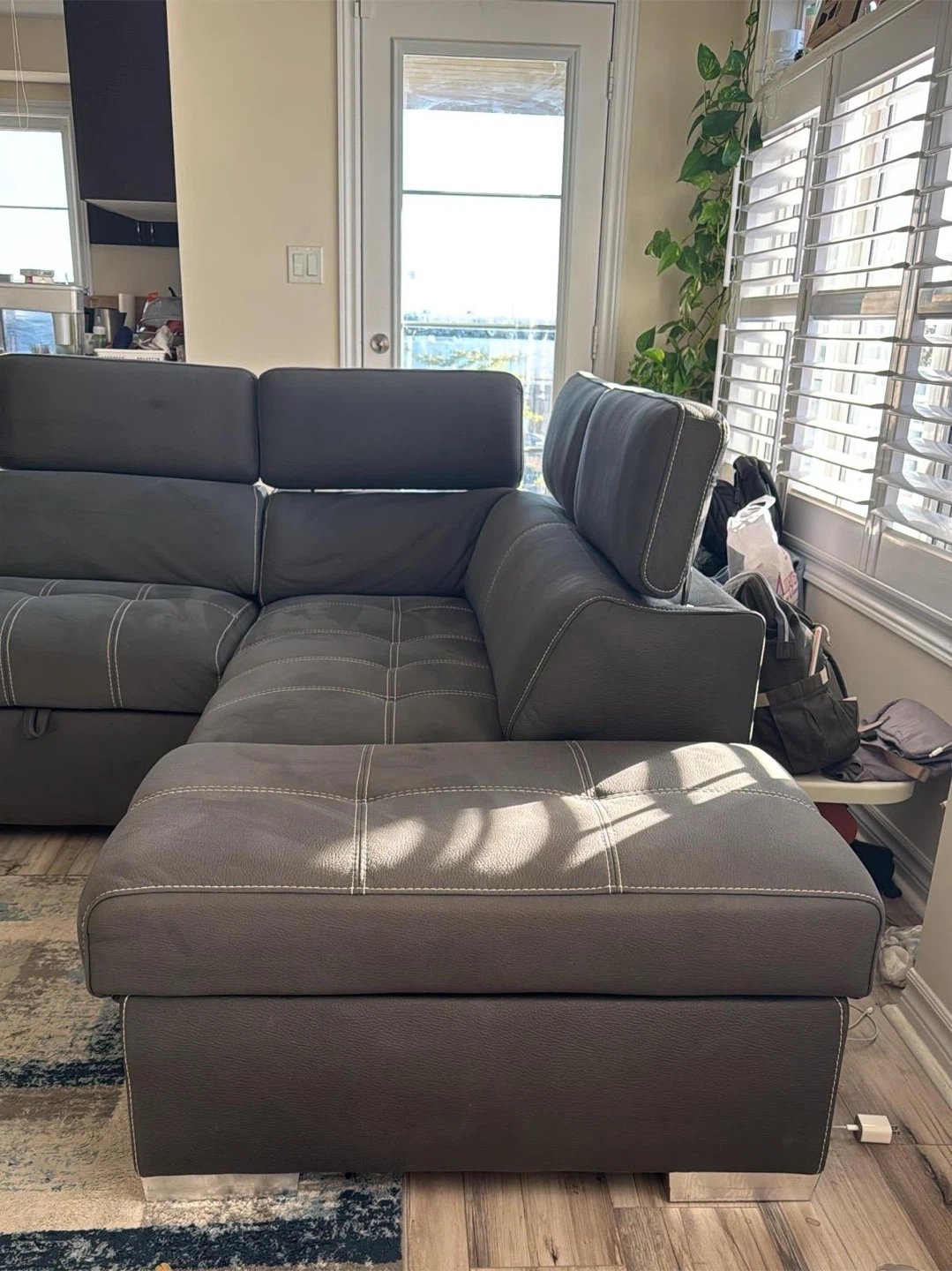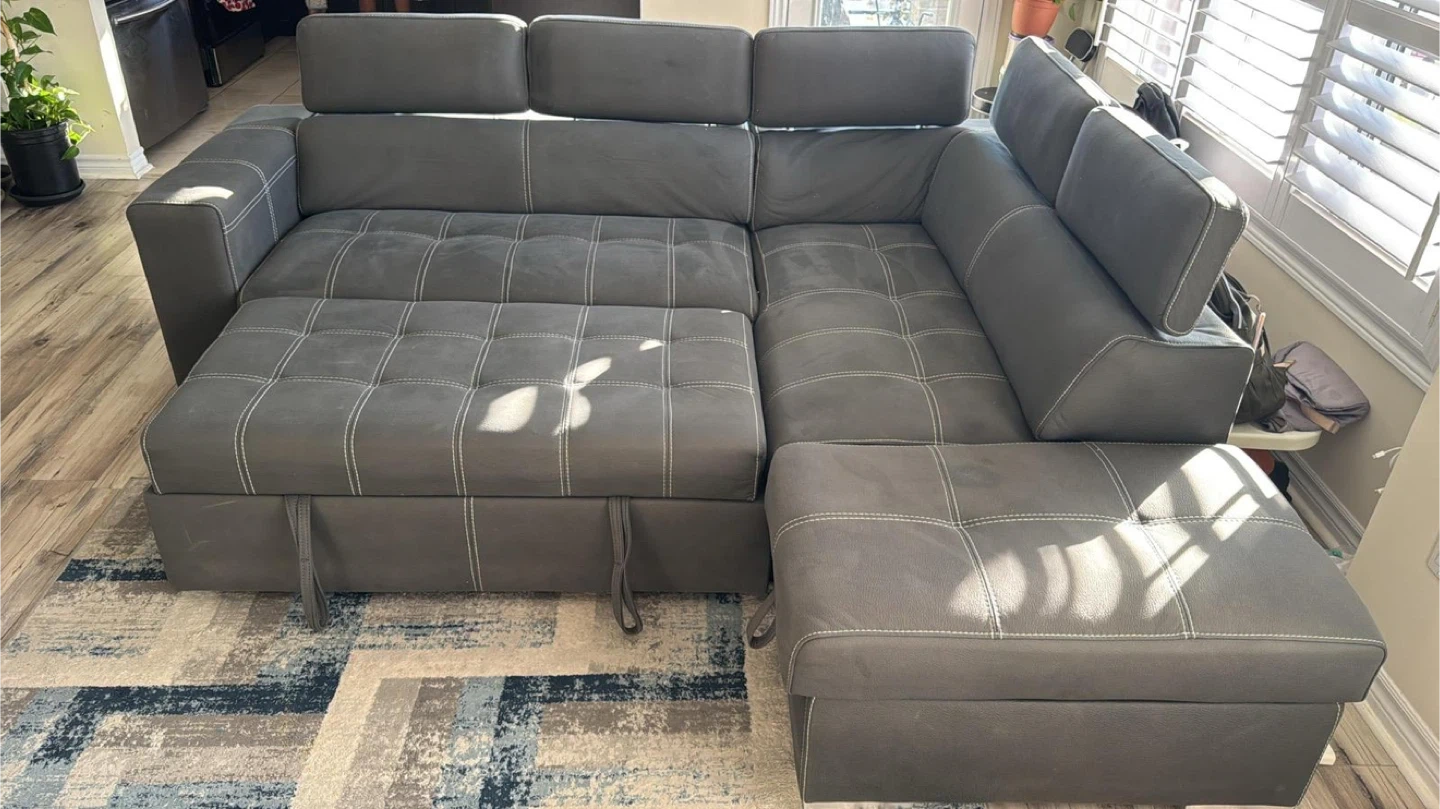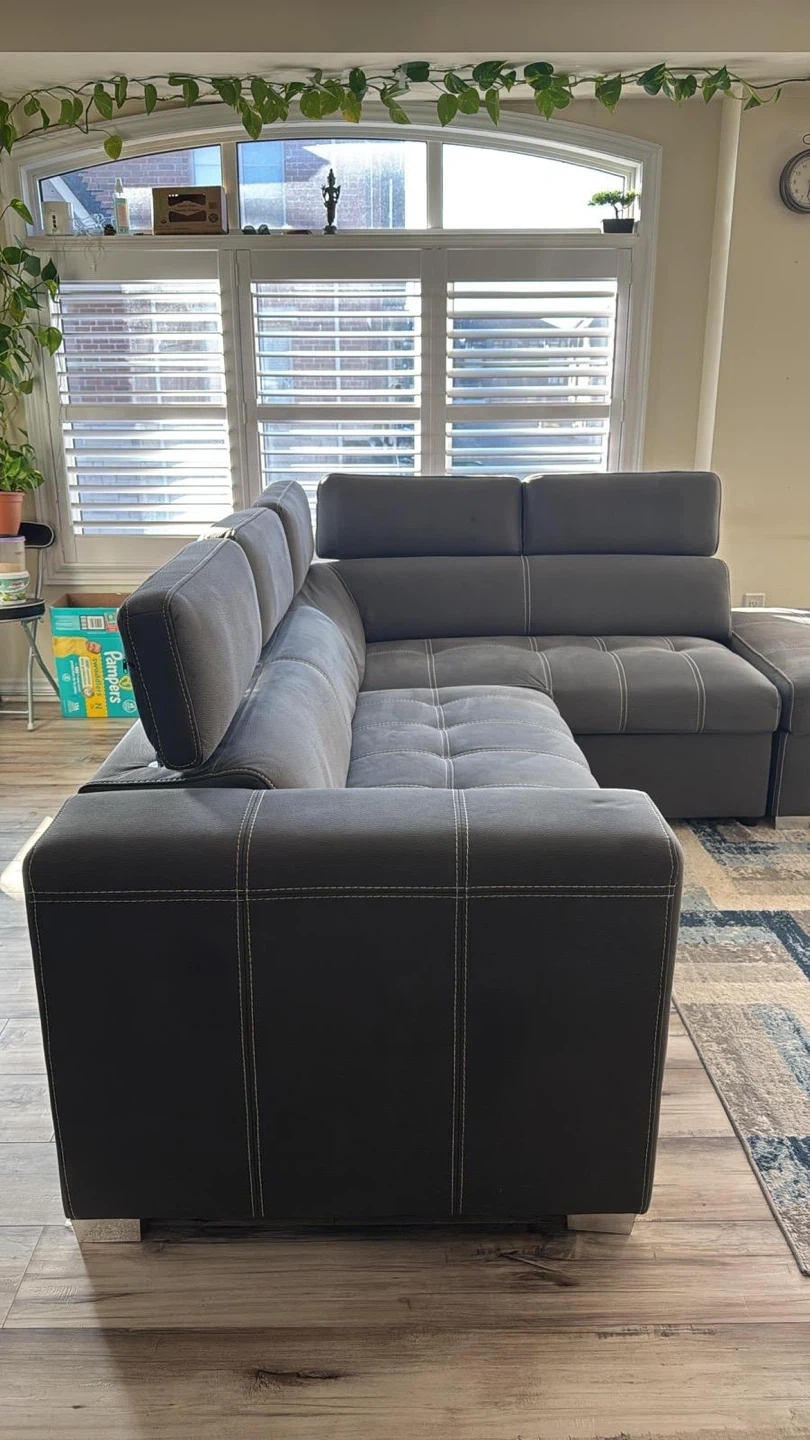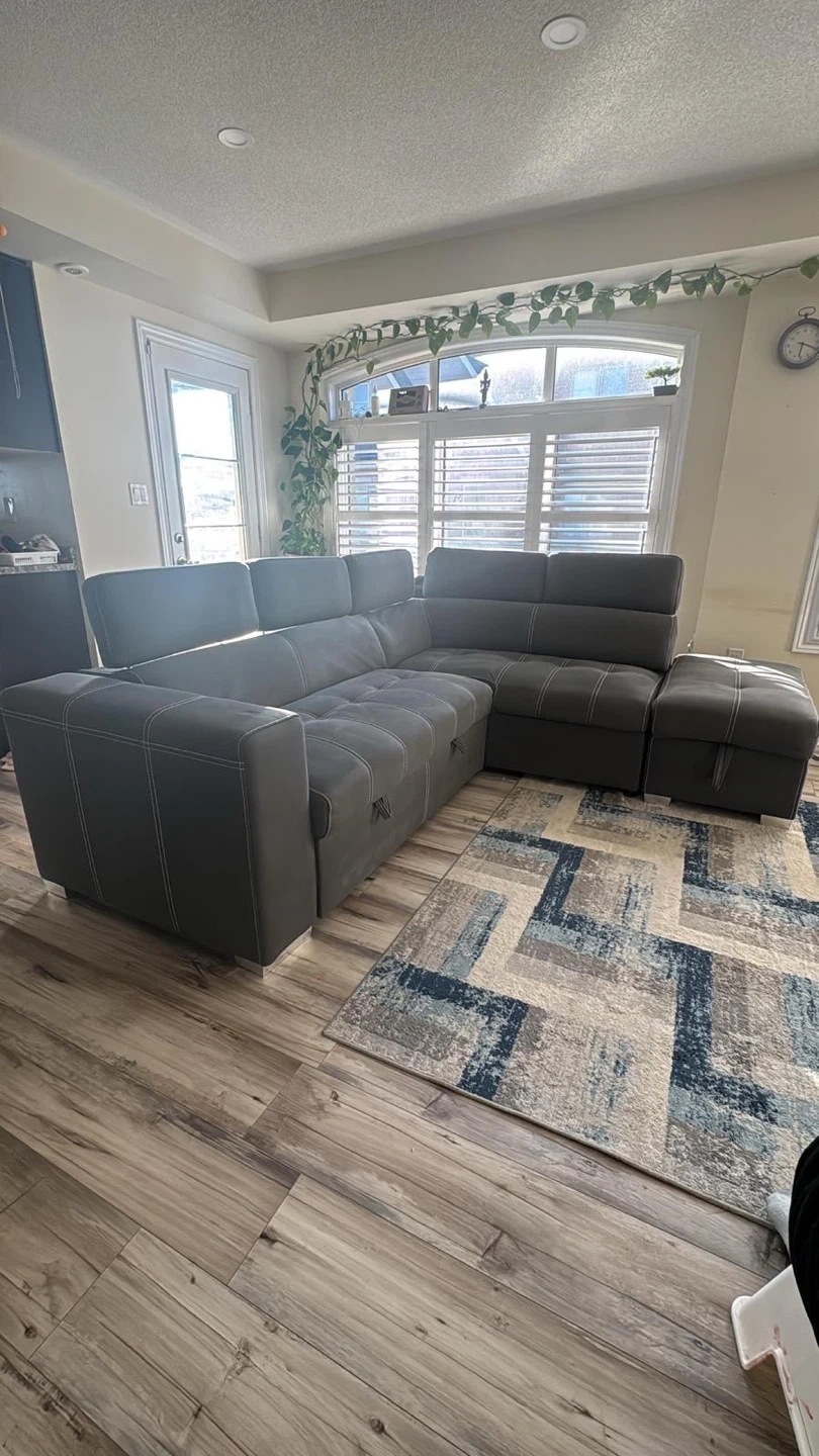 93Selling a comfy grey sectional sofa that's perfect for a living room! It comes with an ottoman, great for kicking back and relaxing after a long day. The sofa has a modern look with its clean lines and neutral colour, fitting well with any decor. It also looks like it has a pull out portion for storage or a bed!