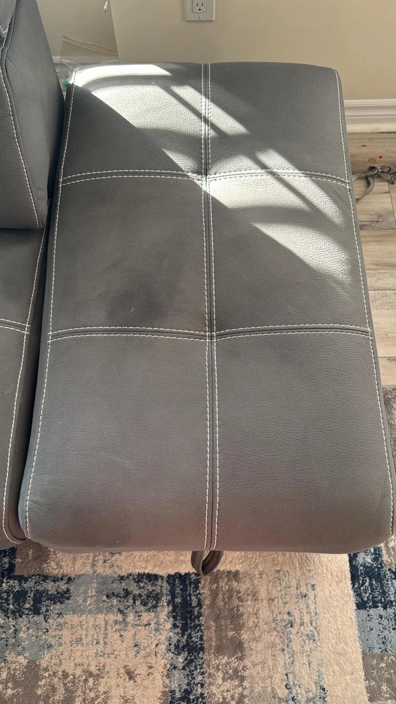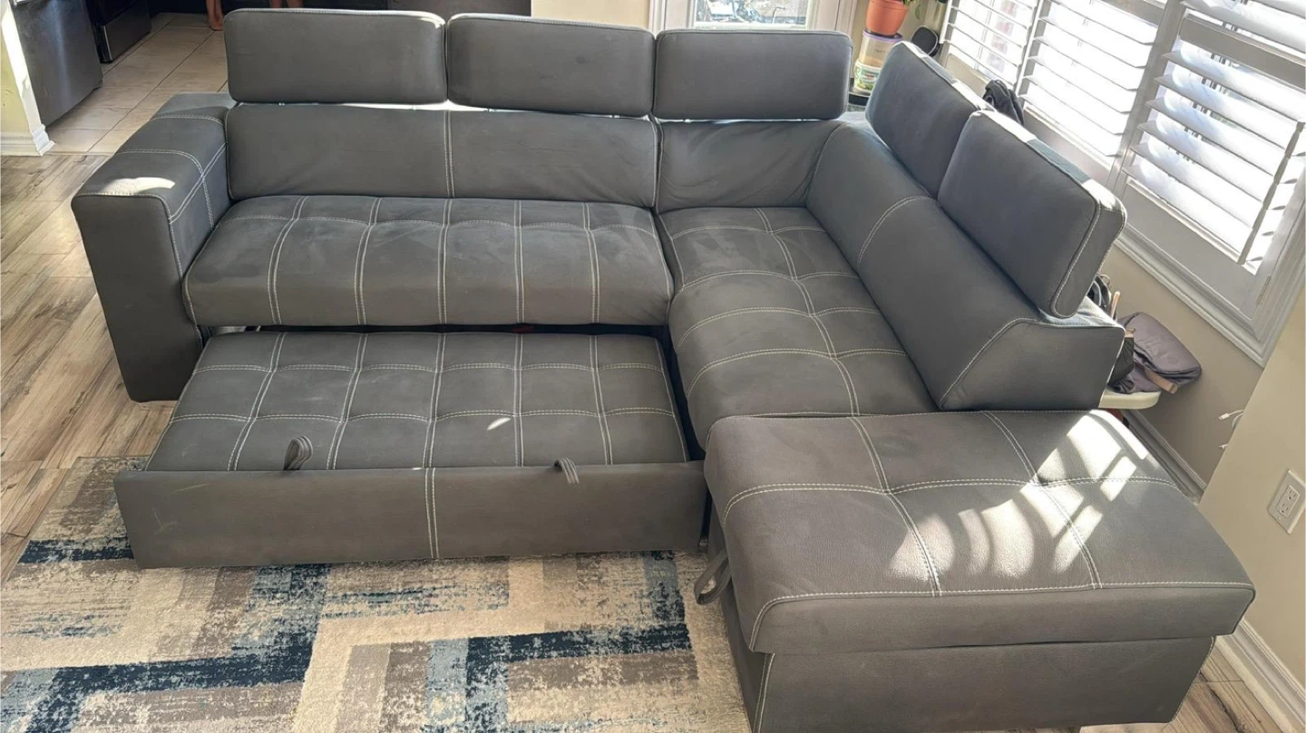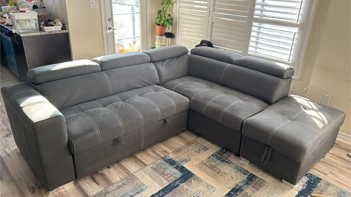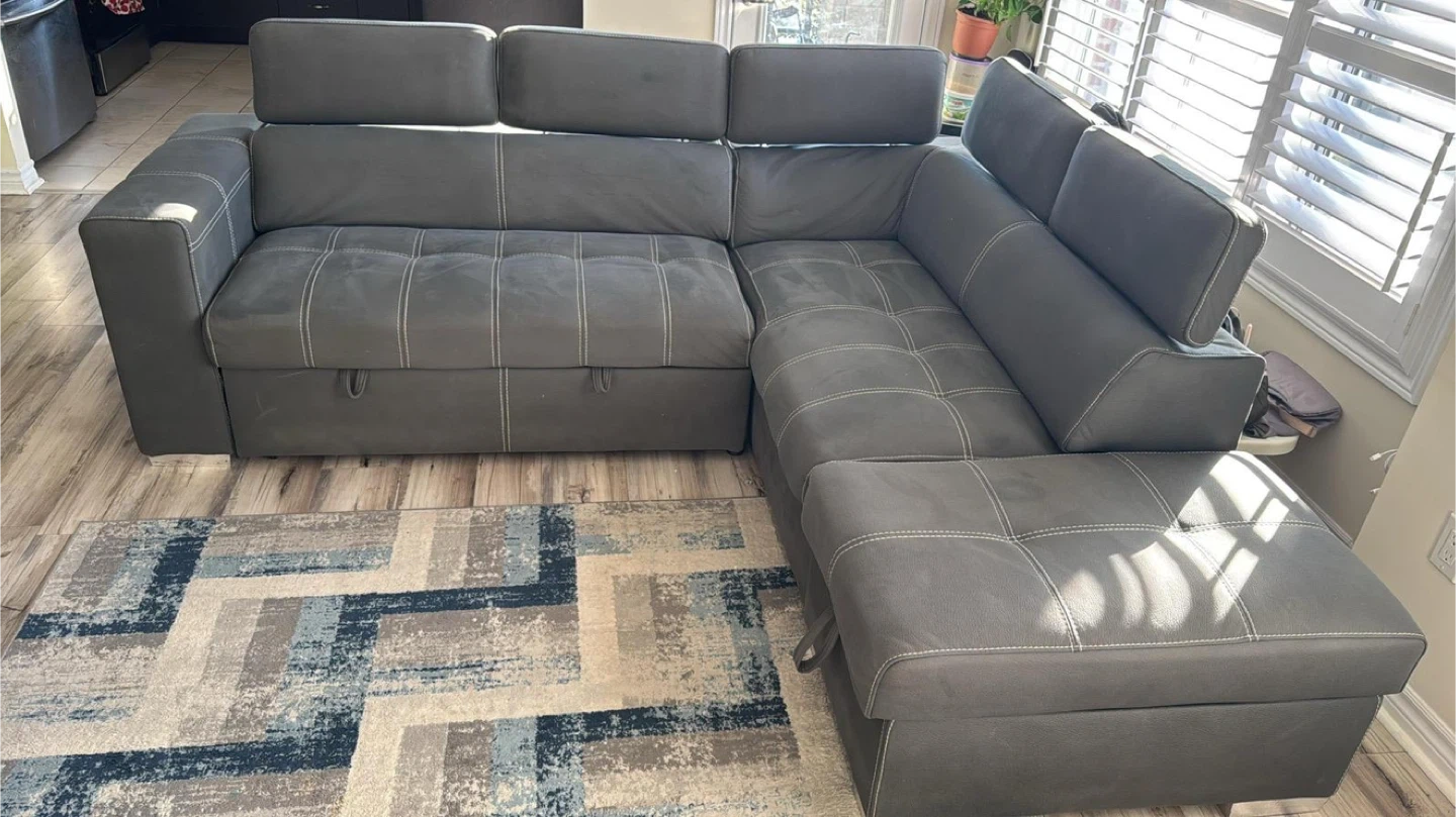 93Selling a comfy grey sectional sofa that's perfect for a living room! It comes with an ottoman, great for kicking back and relaxing after a long day. The sofa has a modern look with its clean lines and neutral colour, fitting well with any decor. It also looks like it has a pull out portion for storage or a bed!