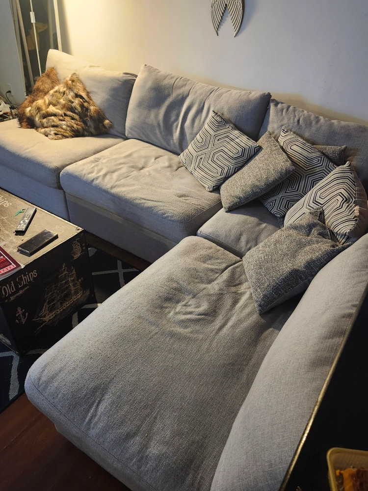 Selling a comfy grey sectional sofa! It comes with a set of decorative pillows to complete the look. Perfect for a living room or den. from a clean and smoke free home. No rips or stains. can deliver +delivery fee