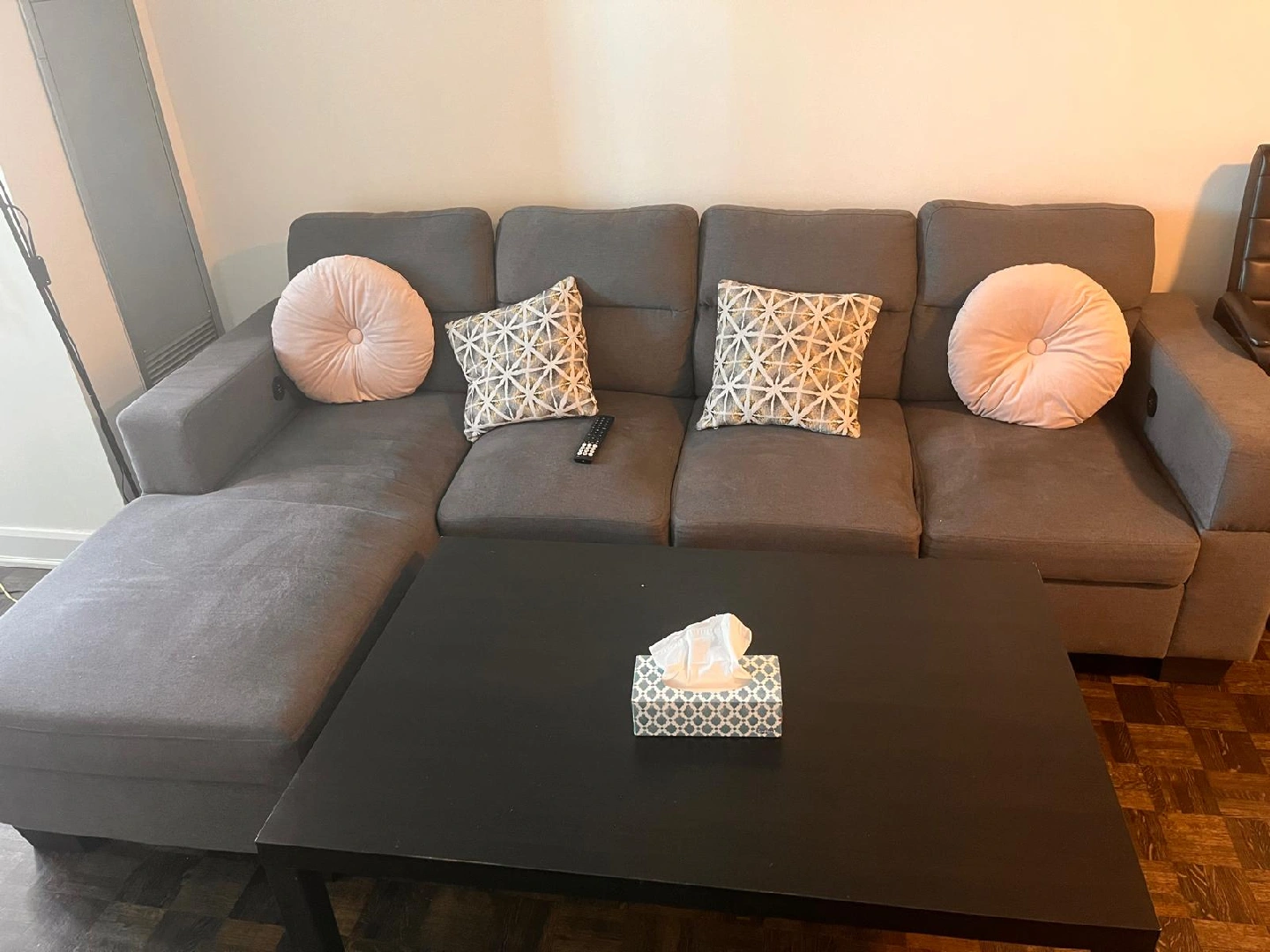 10Selling a comfy grey sectional sofa! It comes with the cushions shown in the pictures. Perfect for a living room or den. It's in great condition and ready for a new home!