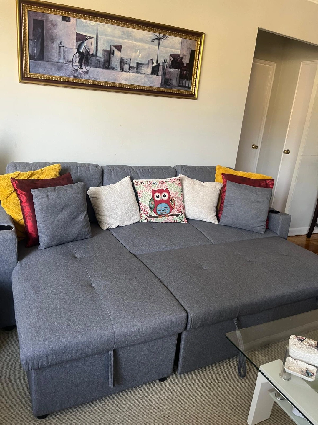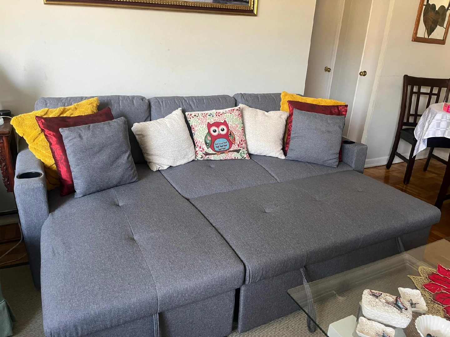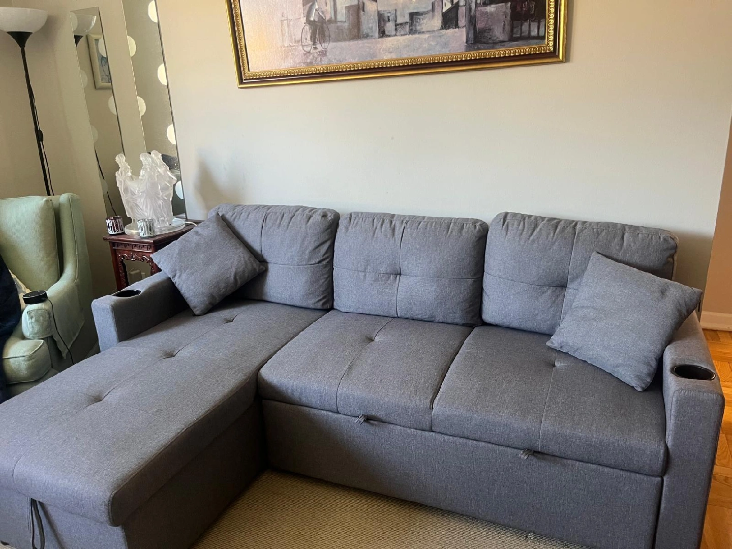 Selling a comfy grey sectional sofa that also pulls out into a bed! It’s in great condition and perfect for a living room or guest room. The sofa has a modern look and is super functional for everyday use and when you have guests over. It's a great space-saver!