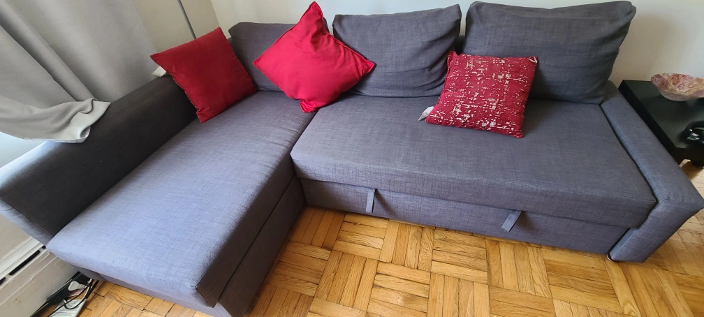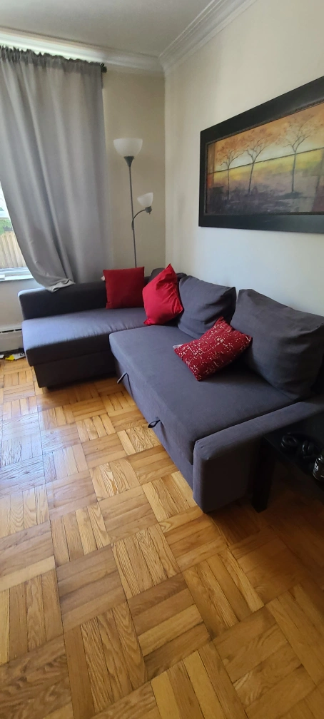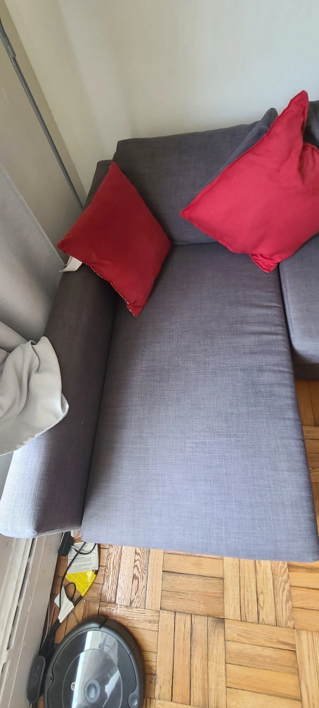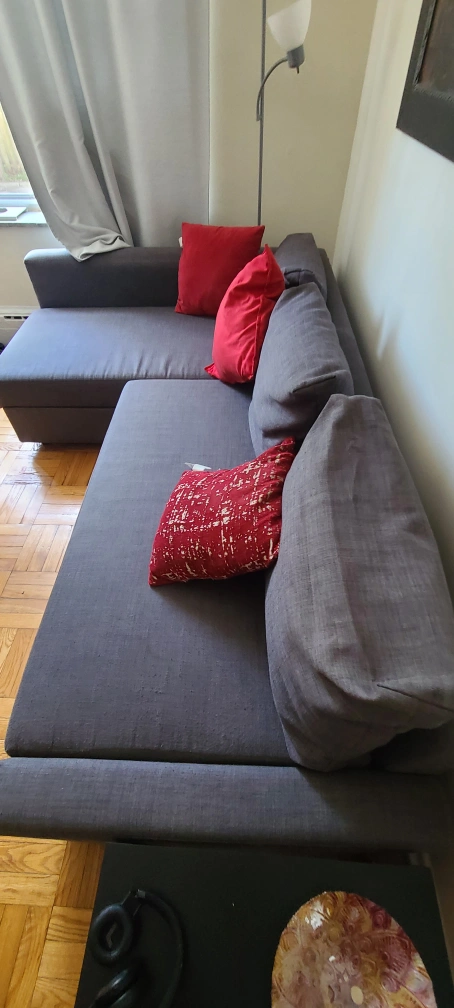 Selling a comfy grey sectional sofa, perfect for lounging and relaxing! It comes with a set of red decorative pillows to add a pop of colour to your living space. This sofa is in great condition and ready for a new home