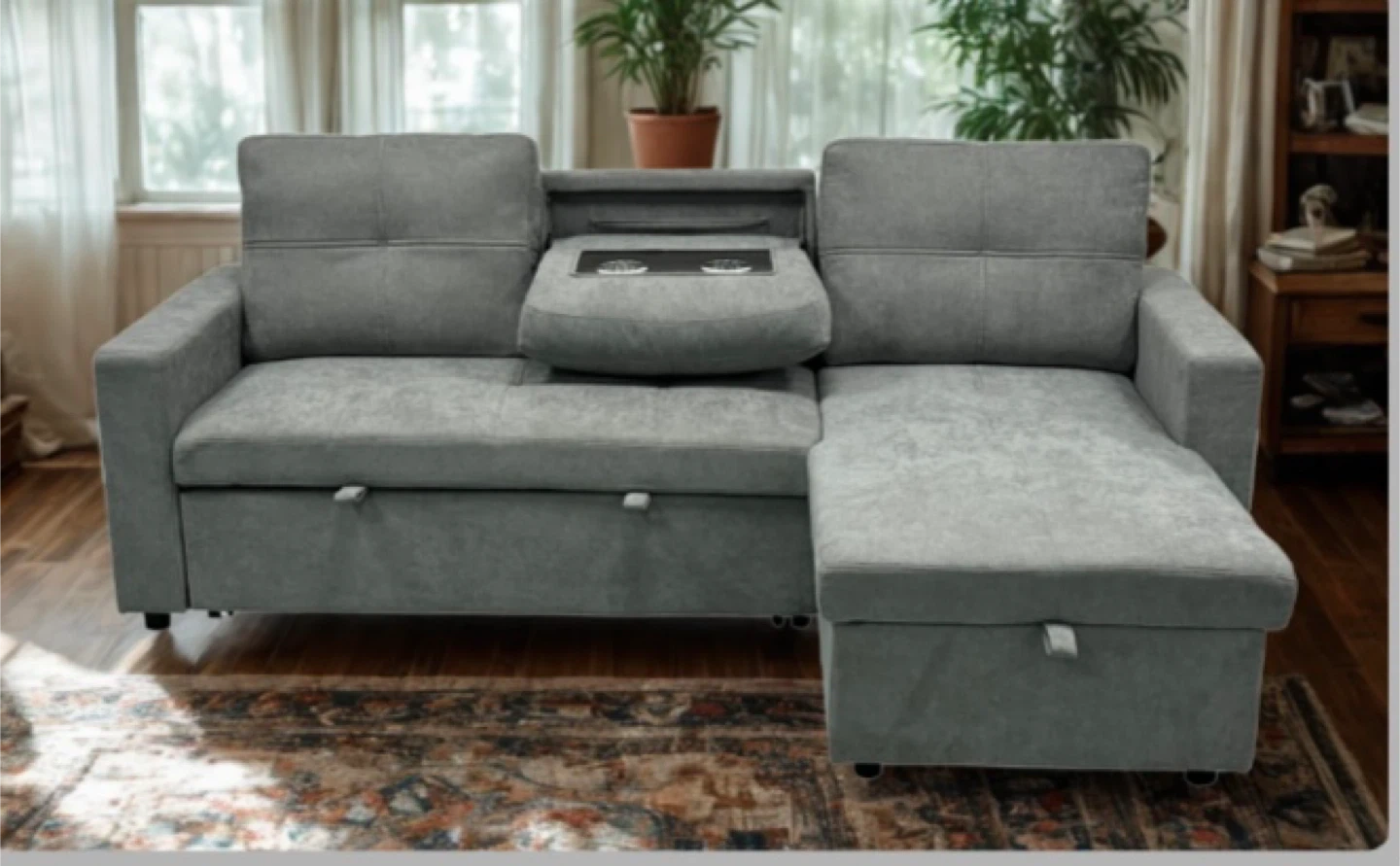 Cream Sectional Sofa with Storage Ottoman & Cup Holders