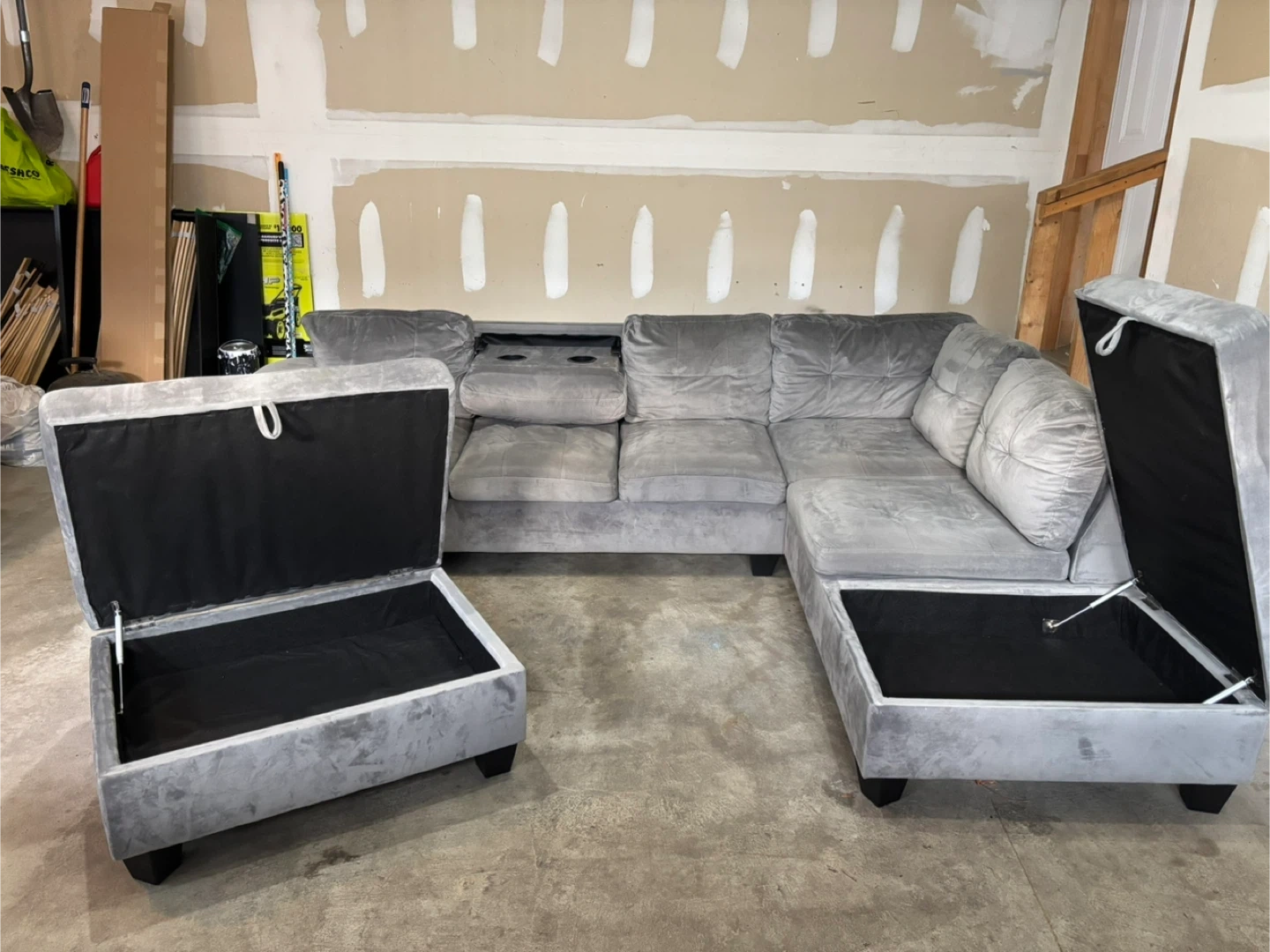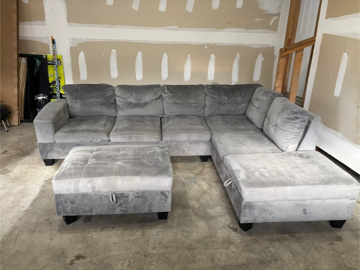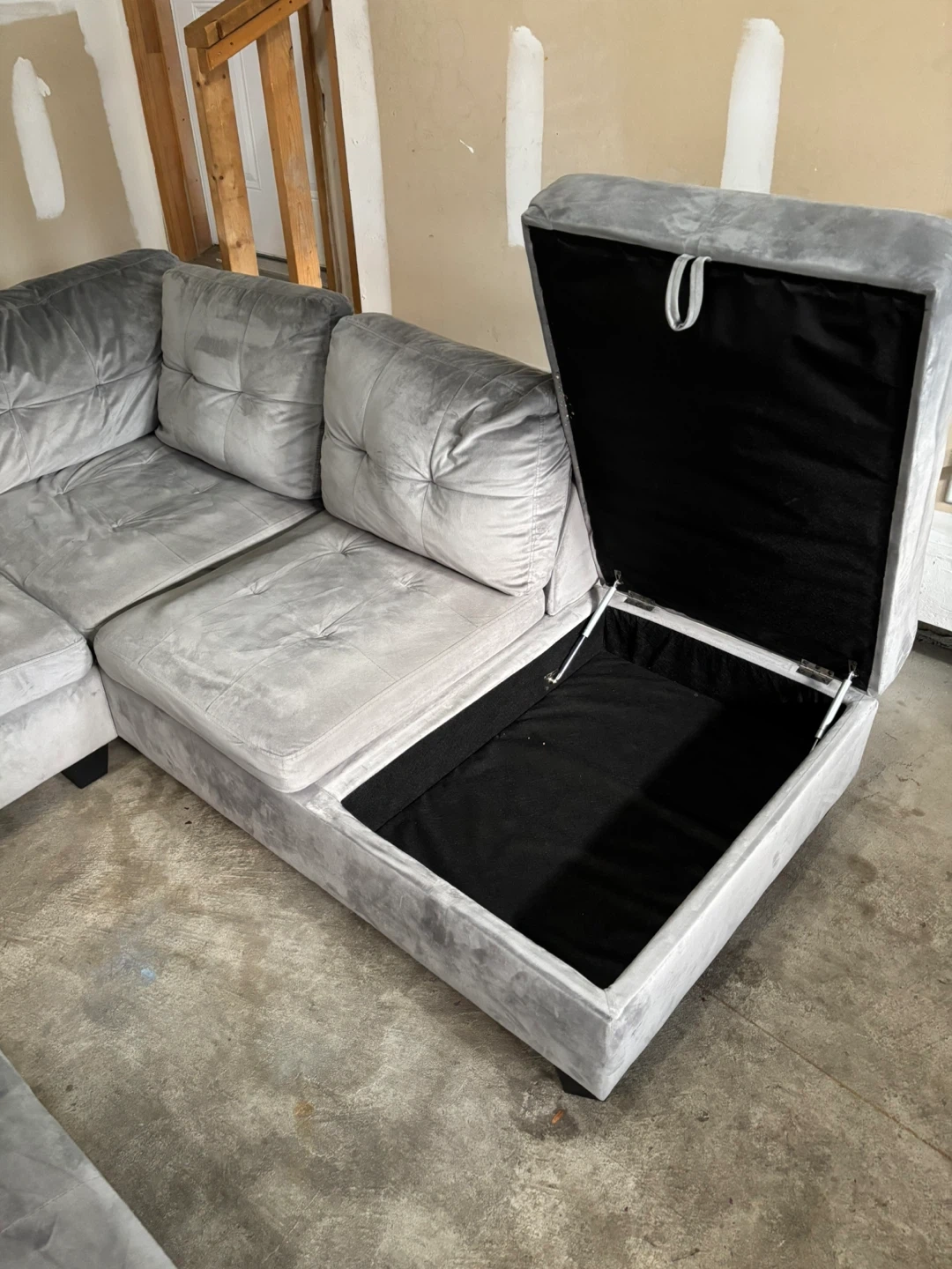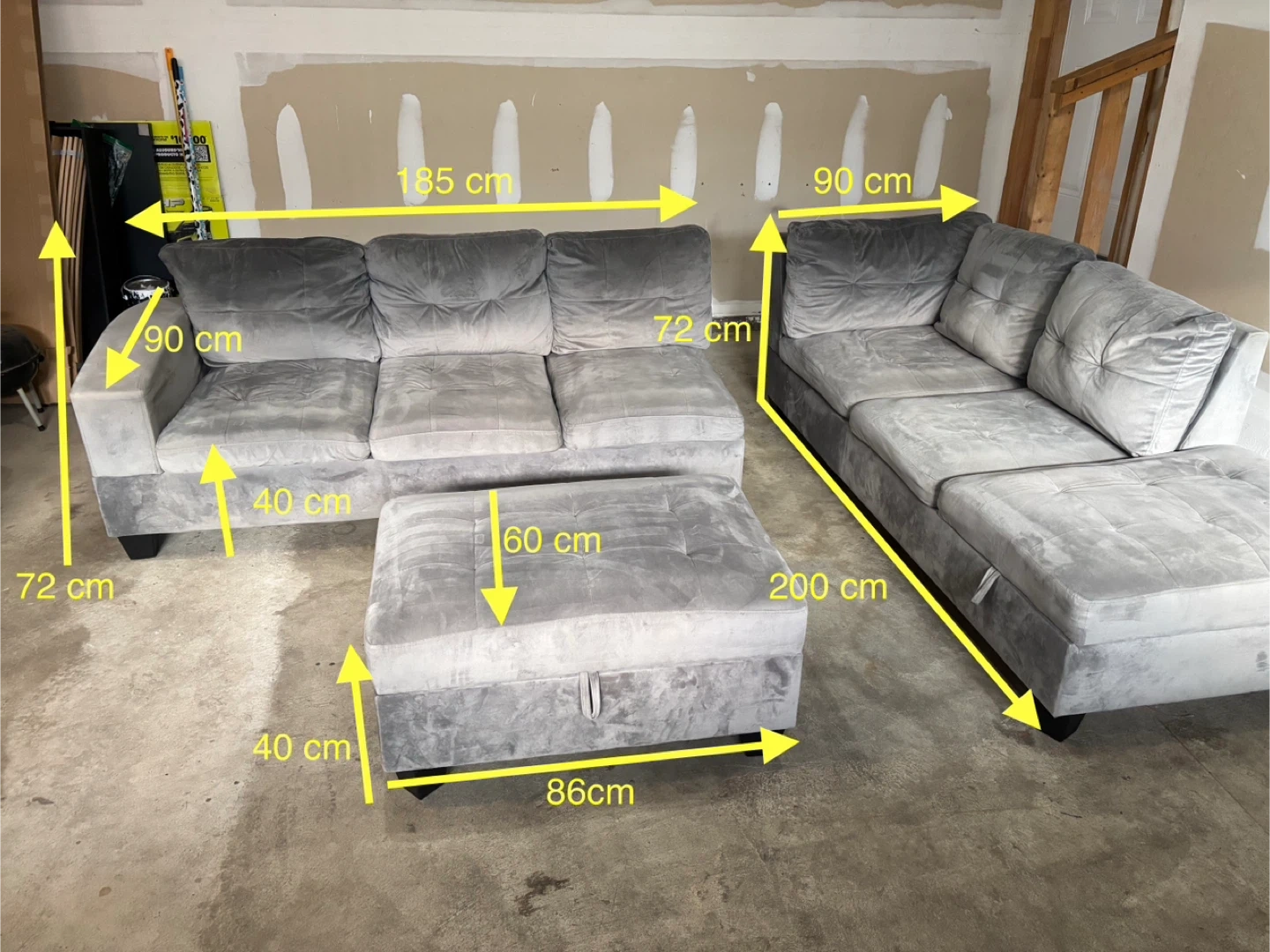 10Selling a comfy grey sectional sofa! It comes with a storage ottoman, perfect for storing blankets or games. The sofa has a built-in cupholder, so you can relax with your favourite drink and also another storage space. It's in great condition and ready for a new home!! Inquire about sofa dimensions!!!
