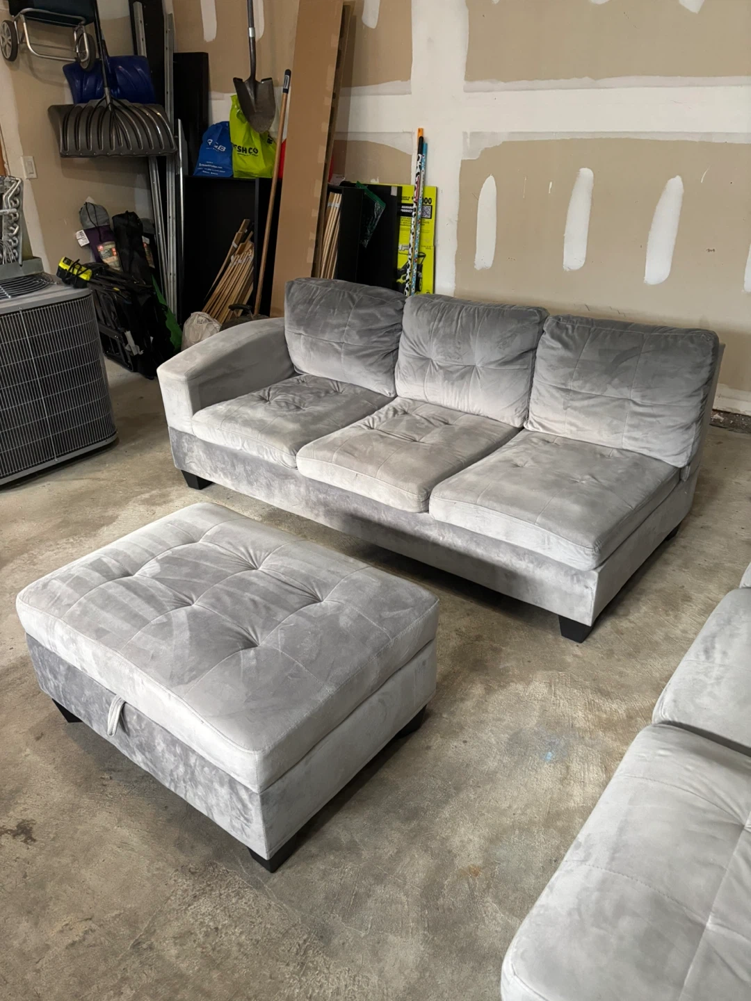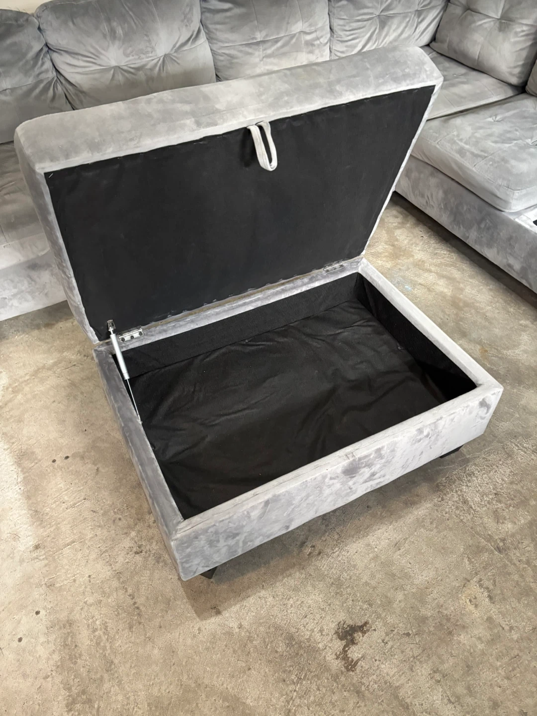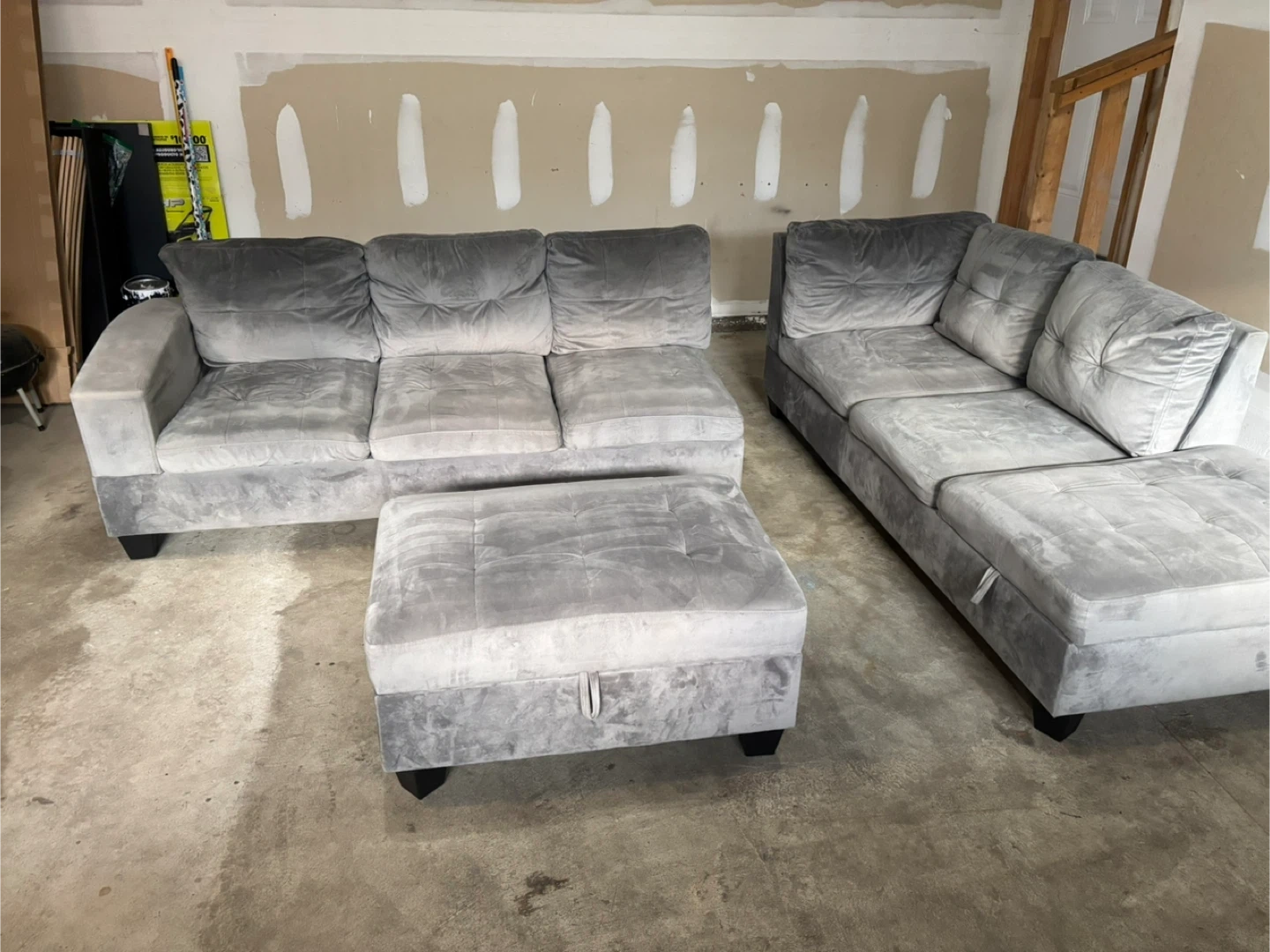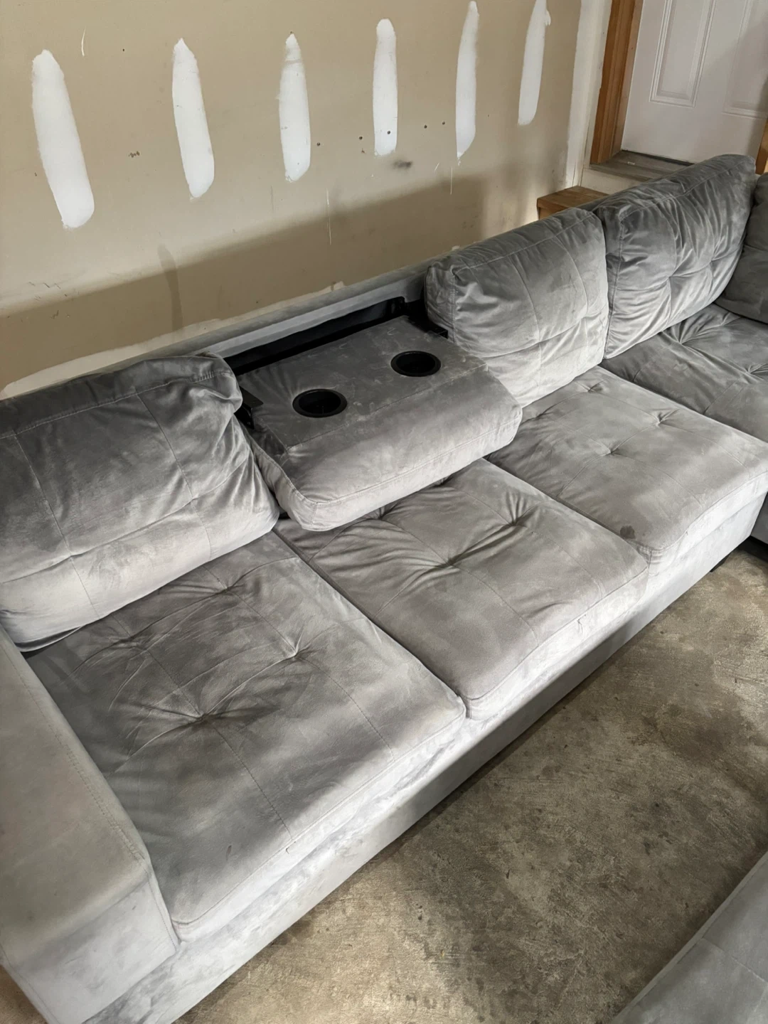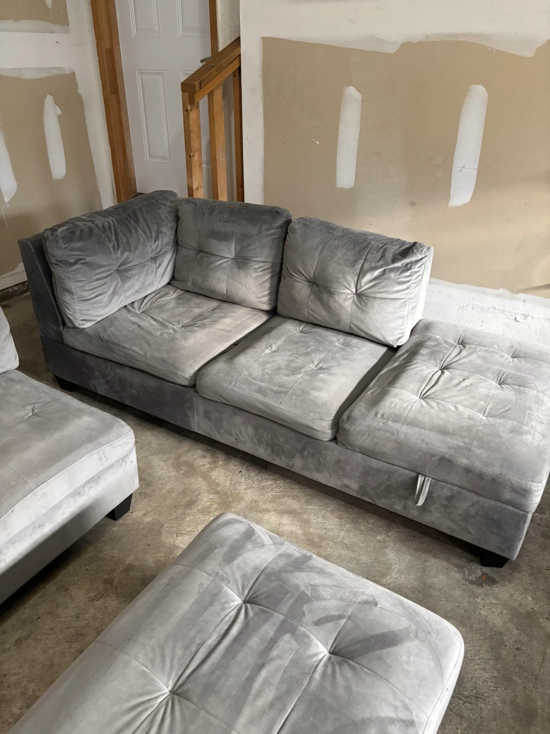 10Selling a comfy grey sectional sofa! It comes with a storage ottoman, perfect for storing blankets or games. The sofa has a built-in cupholder, so you can relax with your favourite drink and also another storage space. It's in great condition and ready for a new home!! Inquire about sofa dimensions!!!