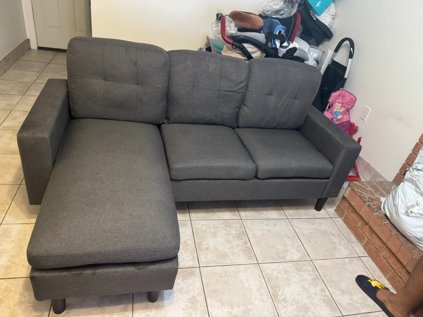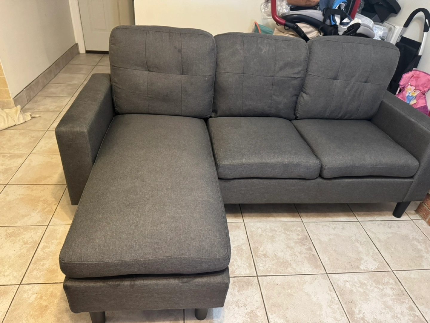 10Selling a comfy grey sectional sofa. It's in great shape and would be perfect for a living room or den. The sectional design offers plenty of seating and a cozy spot to relax. If you're looking for a stylish and functional piece of furniture, this could be it!