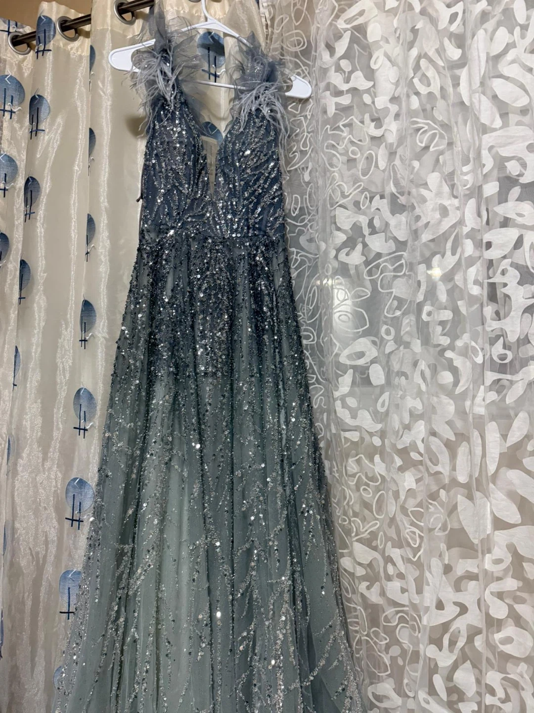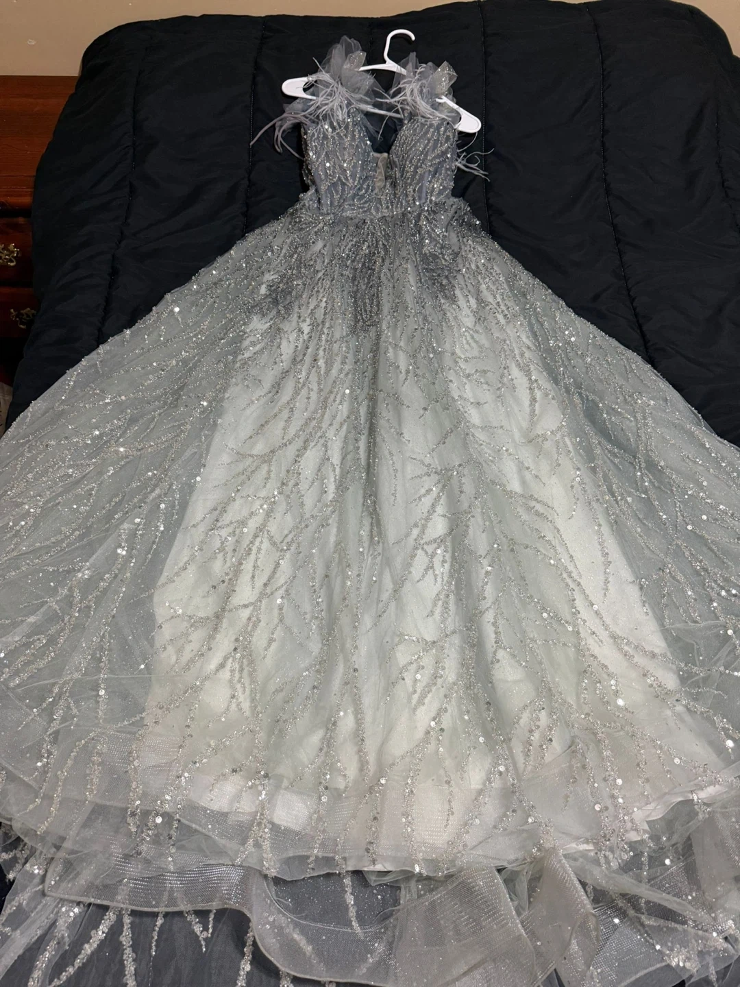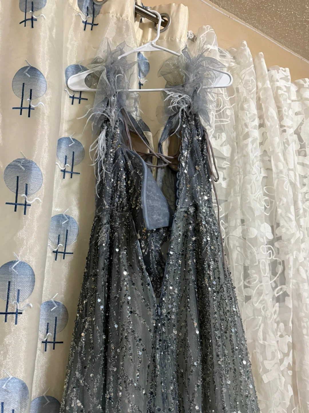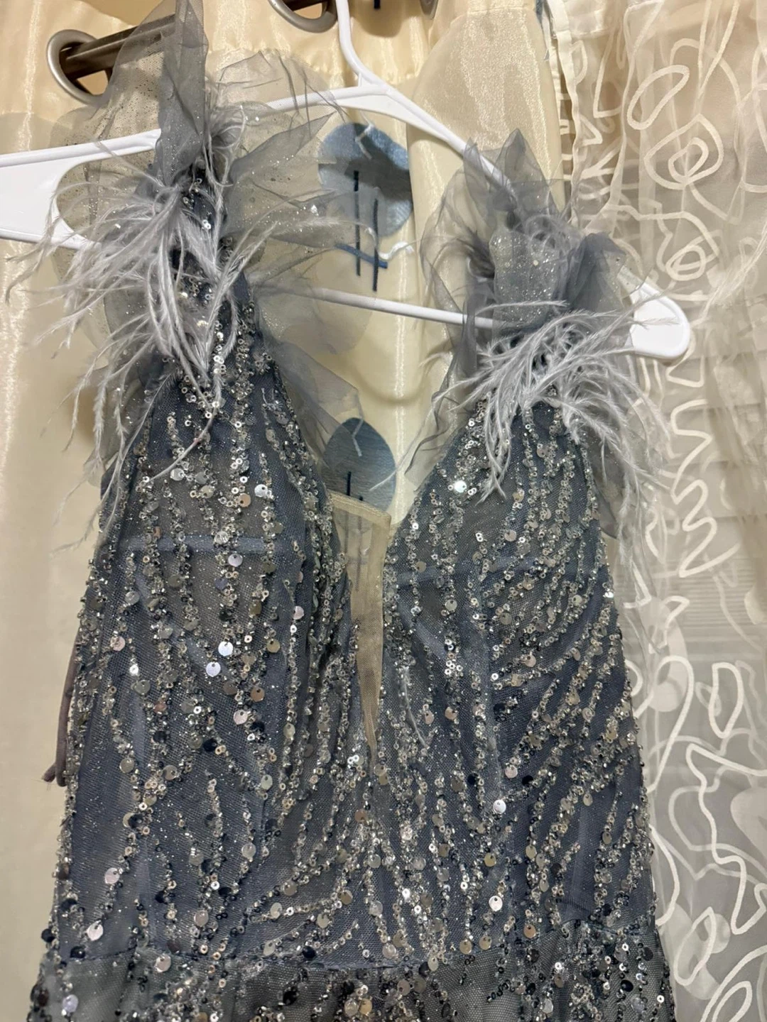 Selling a beautiful grey formal dress with sequin detailing! It features a halter neckline with feather accents. Perfect for a special occasion!