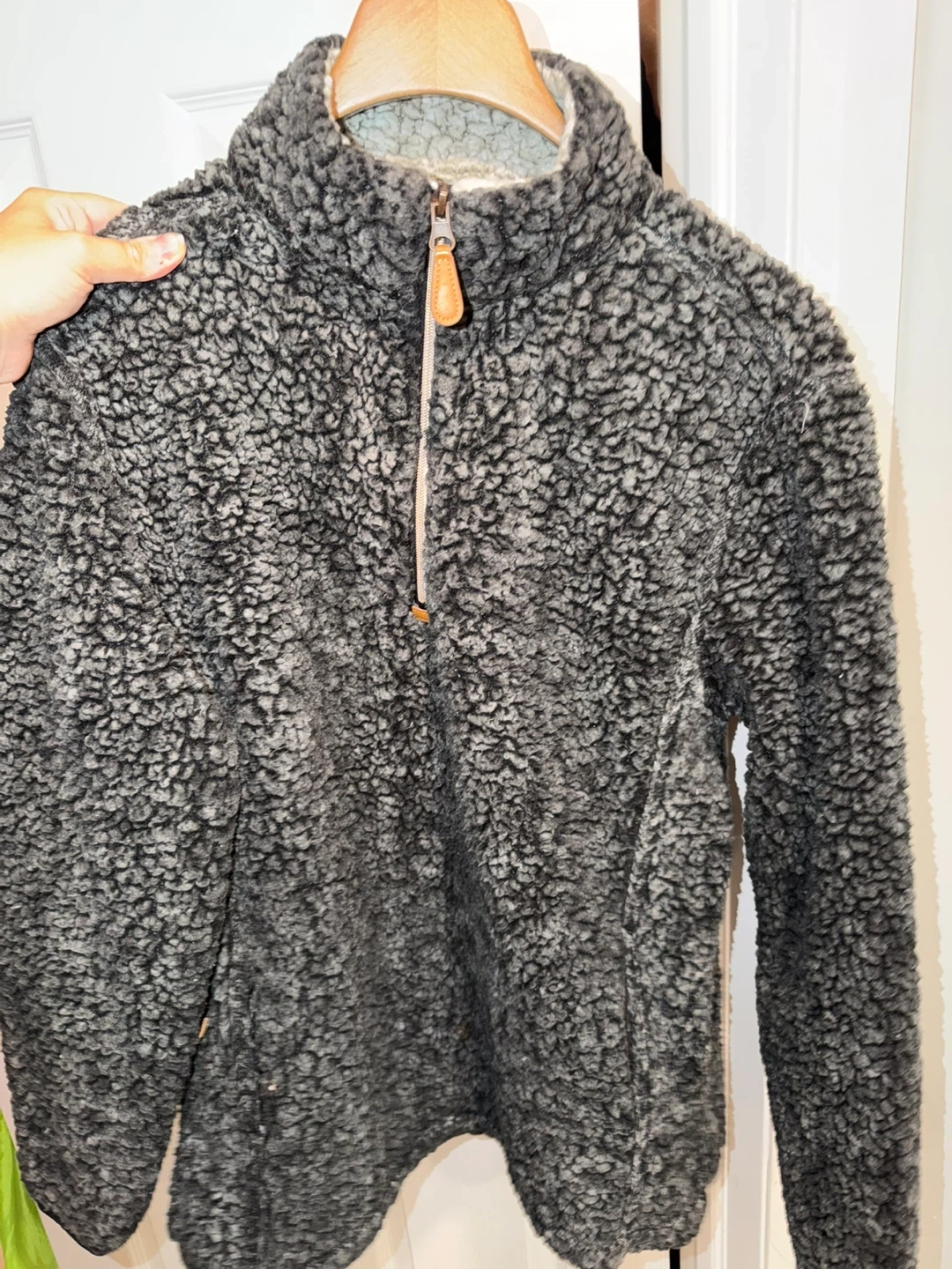 Cozy up in this super soft grey sherpa pullover! It's perfect for chilly days and evenings. The material is very plush and comfy, making it great for lounging around the house or running errands. It's in great condition and ready for a new home!
