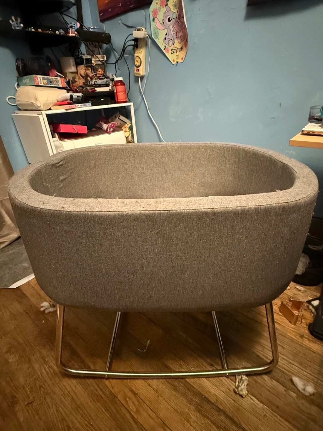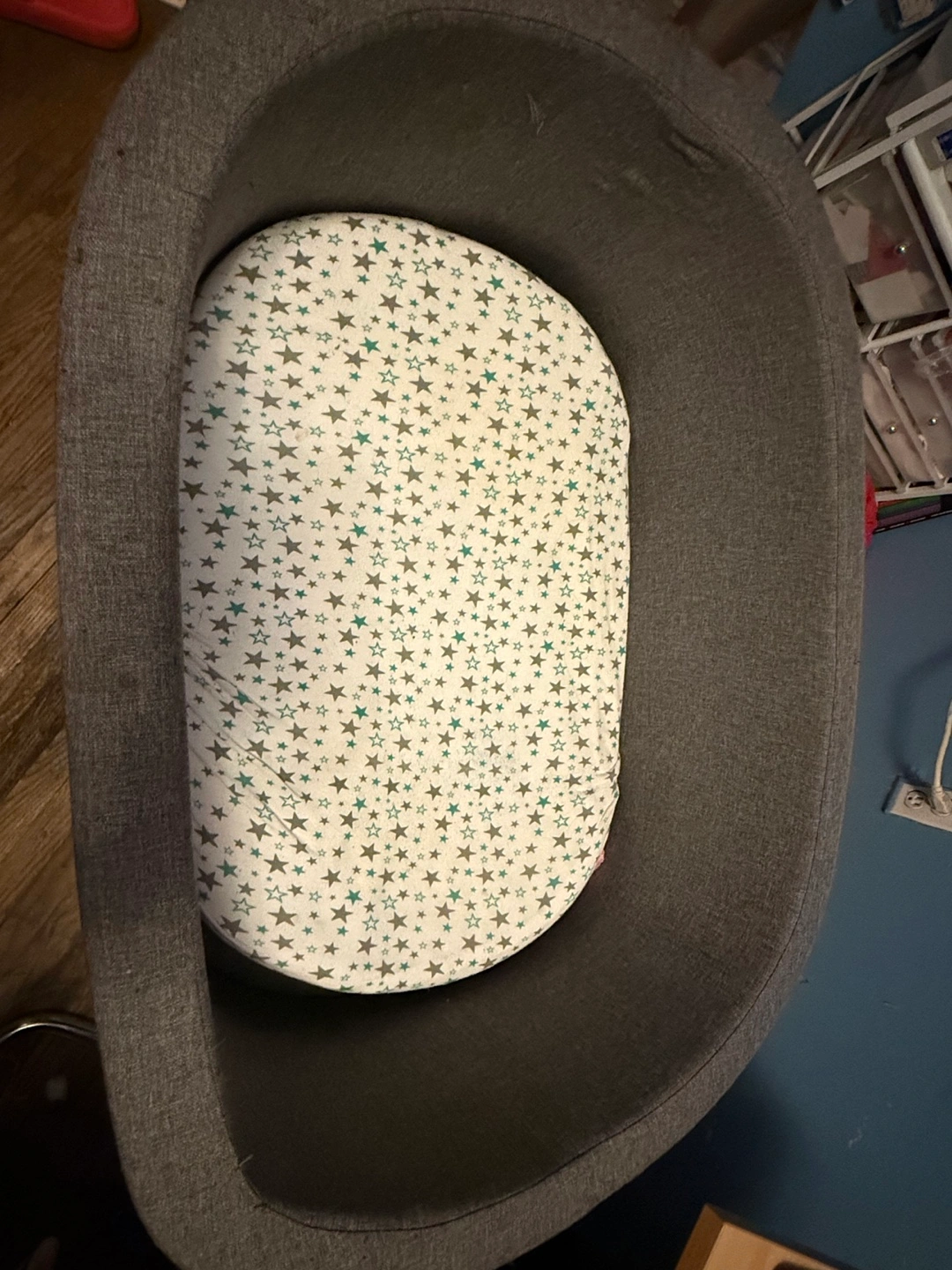 Selling a Snoo bassinet in grey! It's in great condition and has been well taken care of. Perfect for newborns and helps to soothe them to sleep. The bassinet features a soft, comfortable mattress with a star pattern.