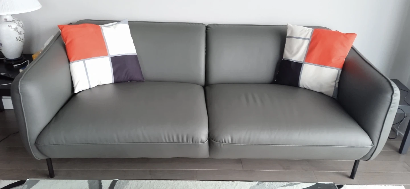 5Selling a comfy grey sofa. It would look great in any living room or den. The sofa has a sleek, modern design with slim black legs. Can sit 3 people. Cushions not included(but negotiable)