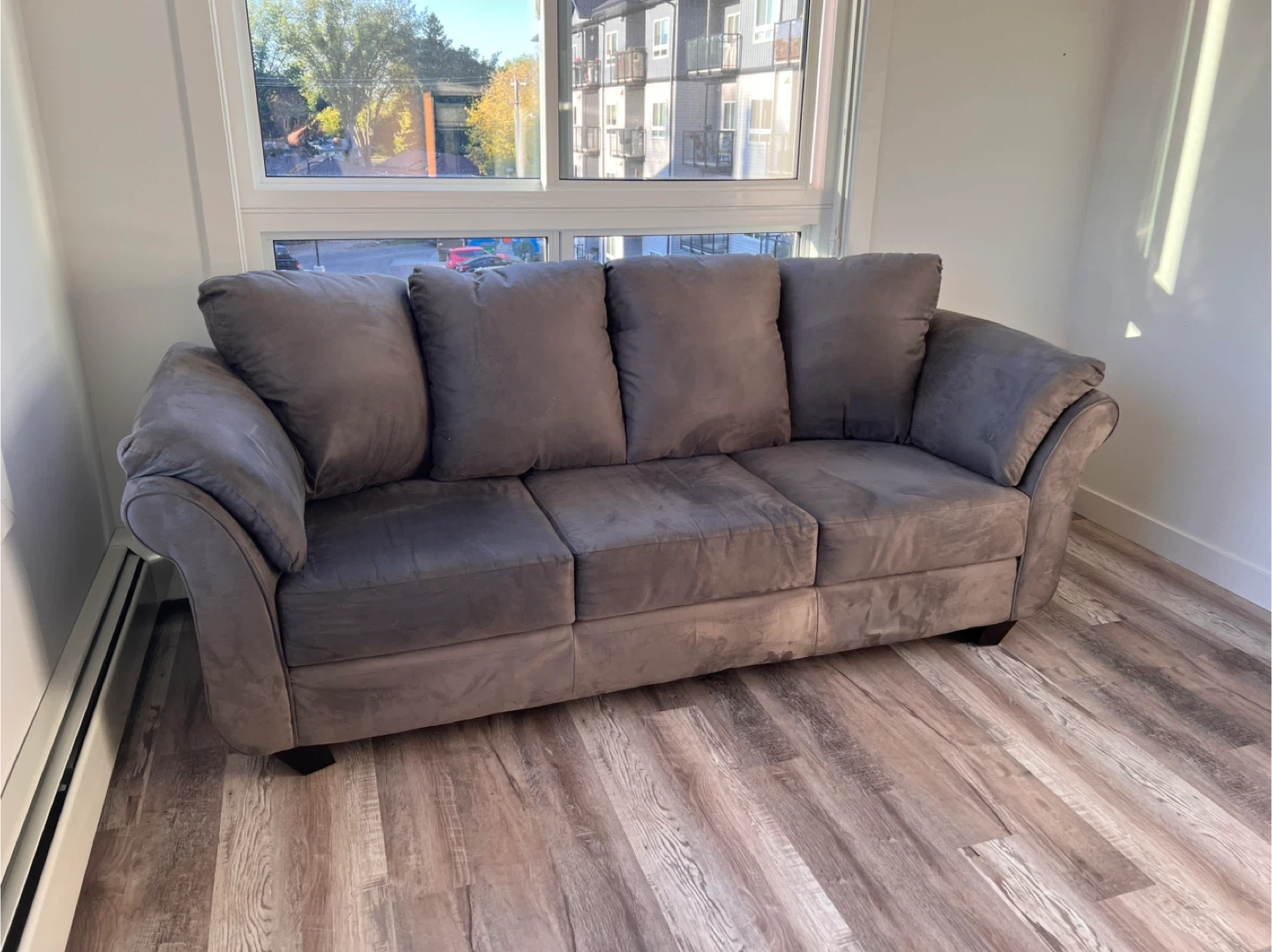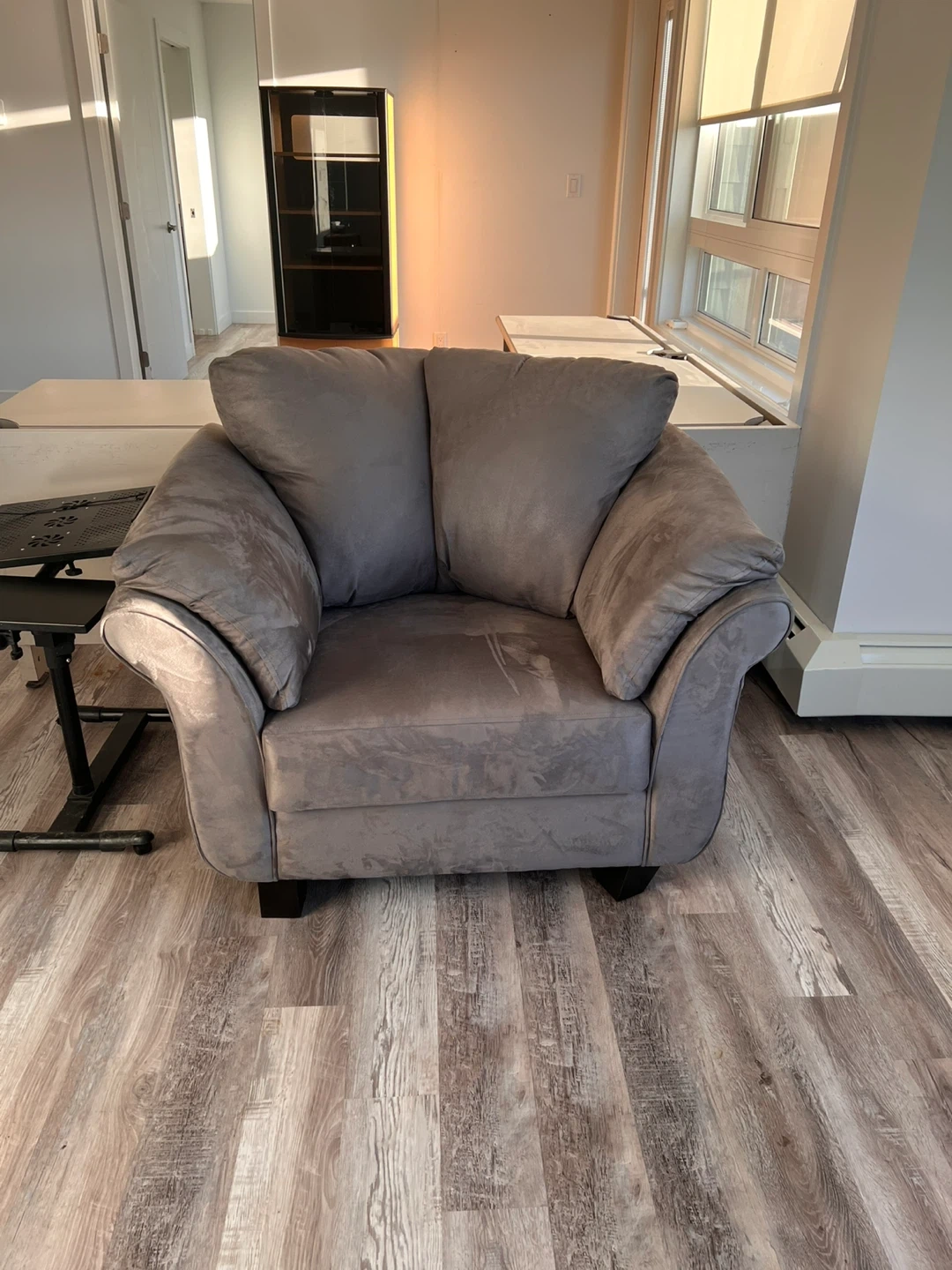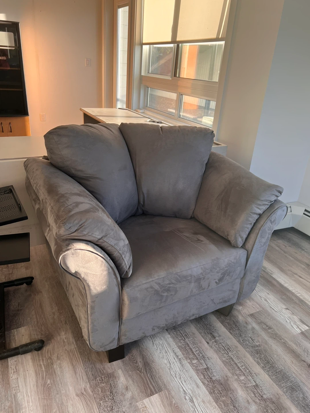 Selling a comfy grey sofa and matching armchair. They're in great shape and would be perfect for a living room or den. The material is soft and cozy! They're a great set to relax on after a long day only 3 months old from Leon’s doesn’t fit in my Dads new seniors residence room