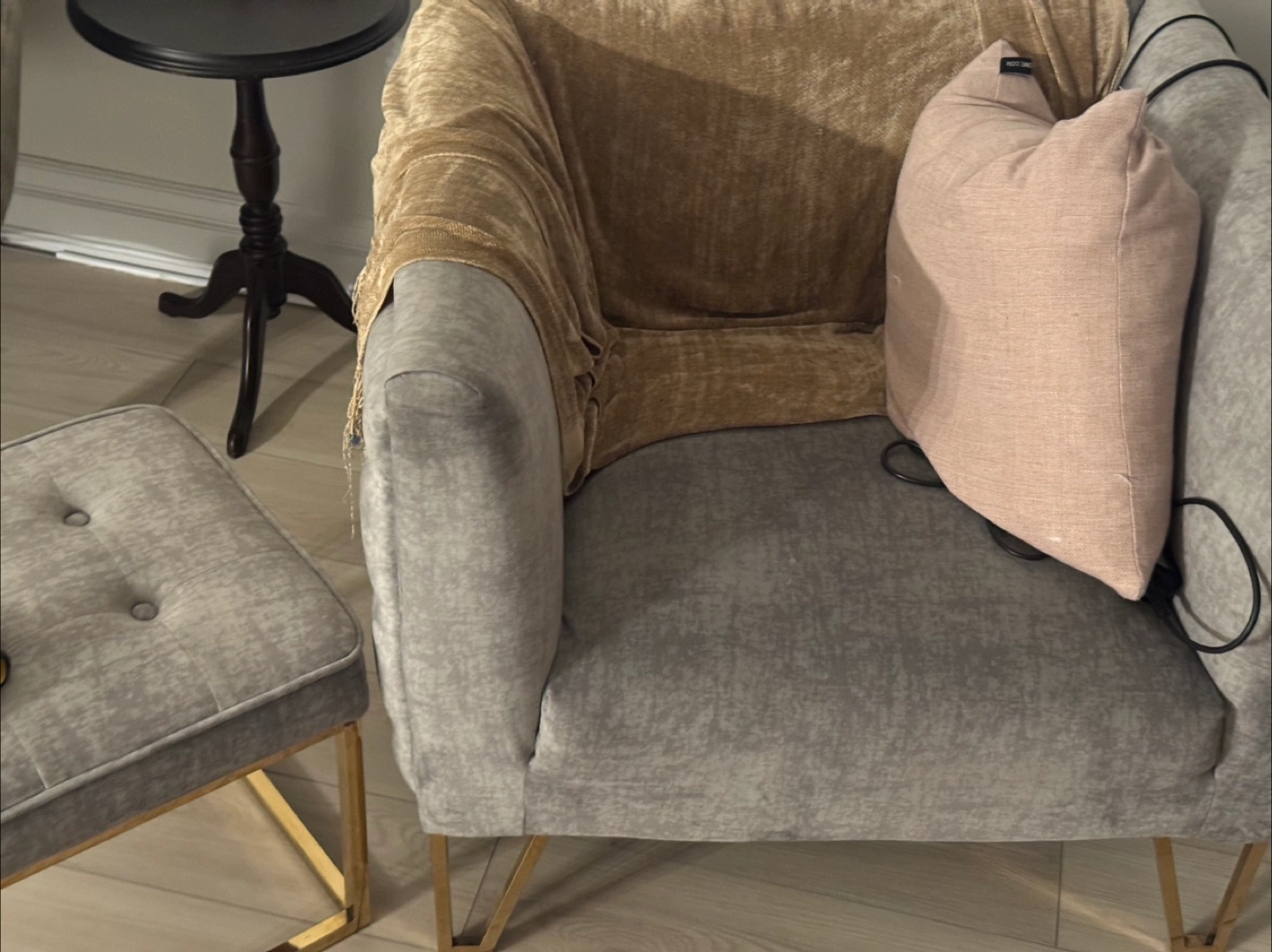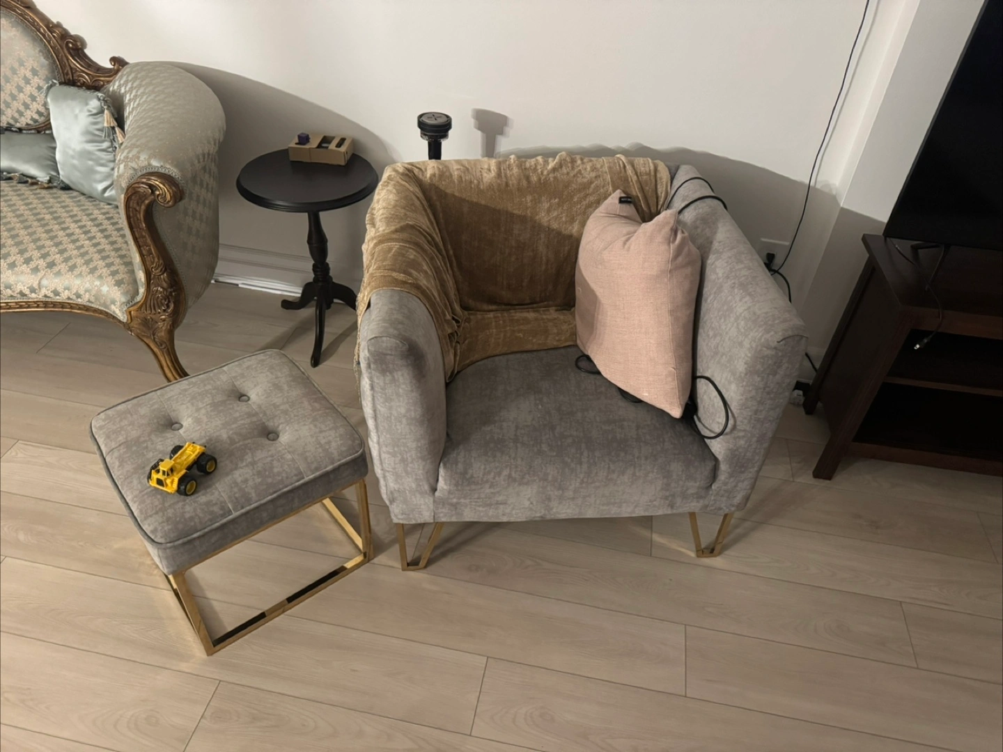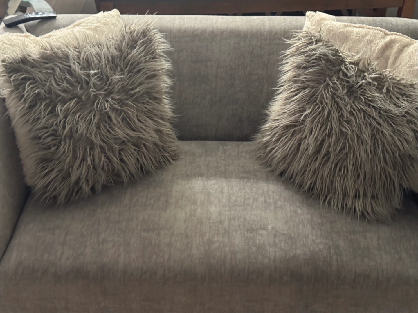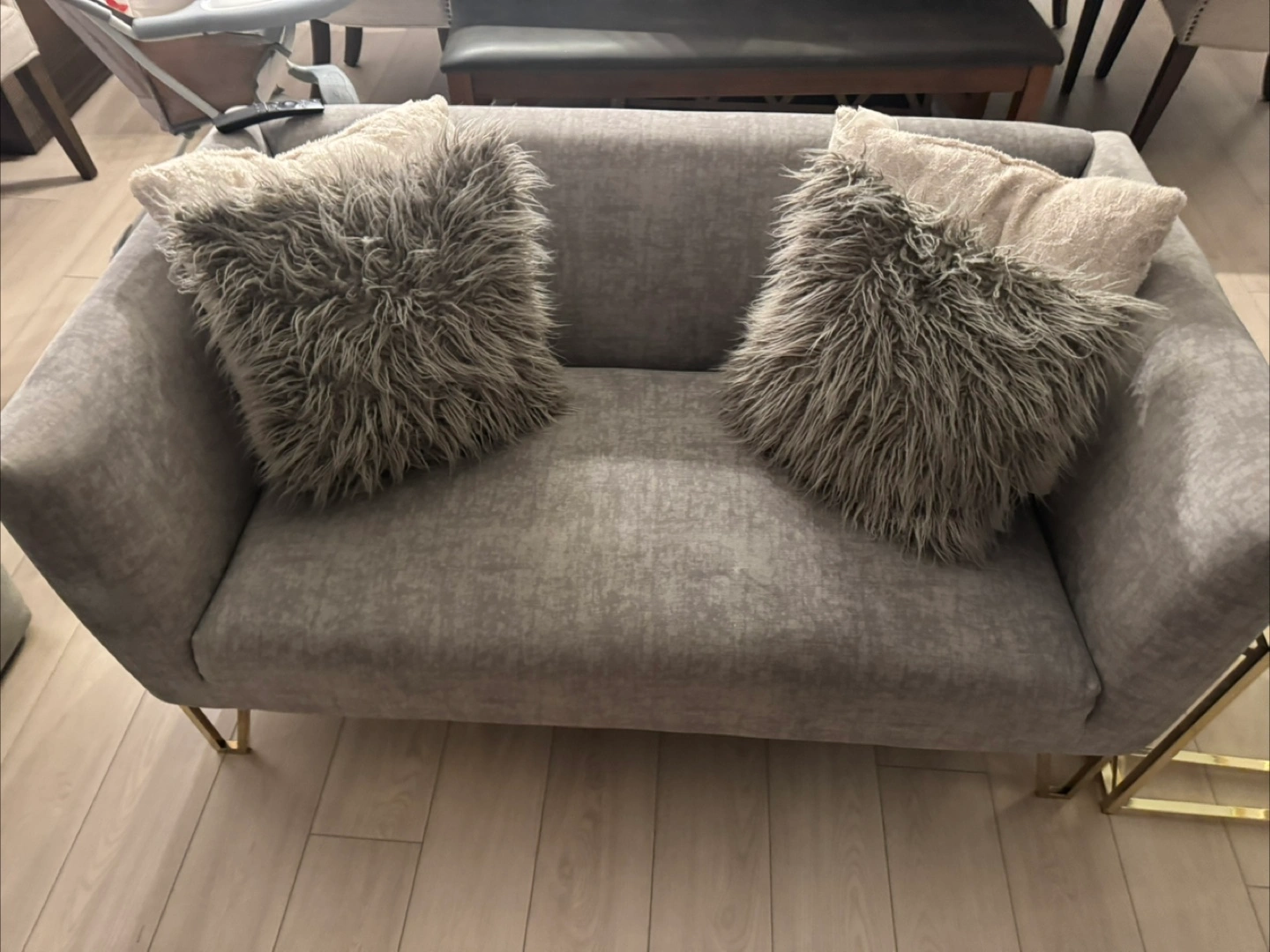 Selling a comfy grey sofa and ottoman set. It's in great condition and would look lovely in any living room or den. The sofa comes with stylish pillows as shown in the pictures. Let me know if you're interested!
