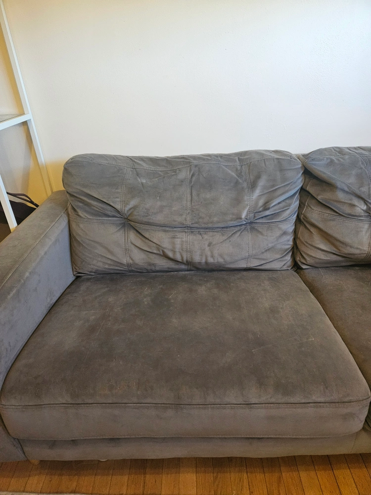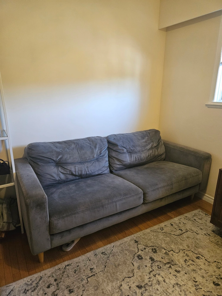 Selling a comfy grey sofa! It's in good condition and ready for a new home. Perfect for a living room or den. cat friendly home, however they cats rarely go i to this room. Will clean the sofa with a Fabric cleaner before pick up. cushions are not removable, however the legs are.