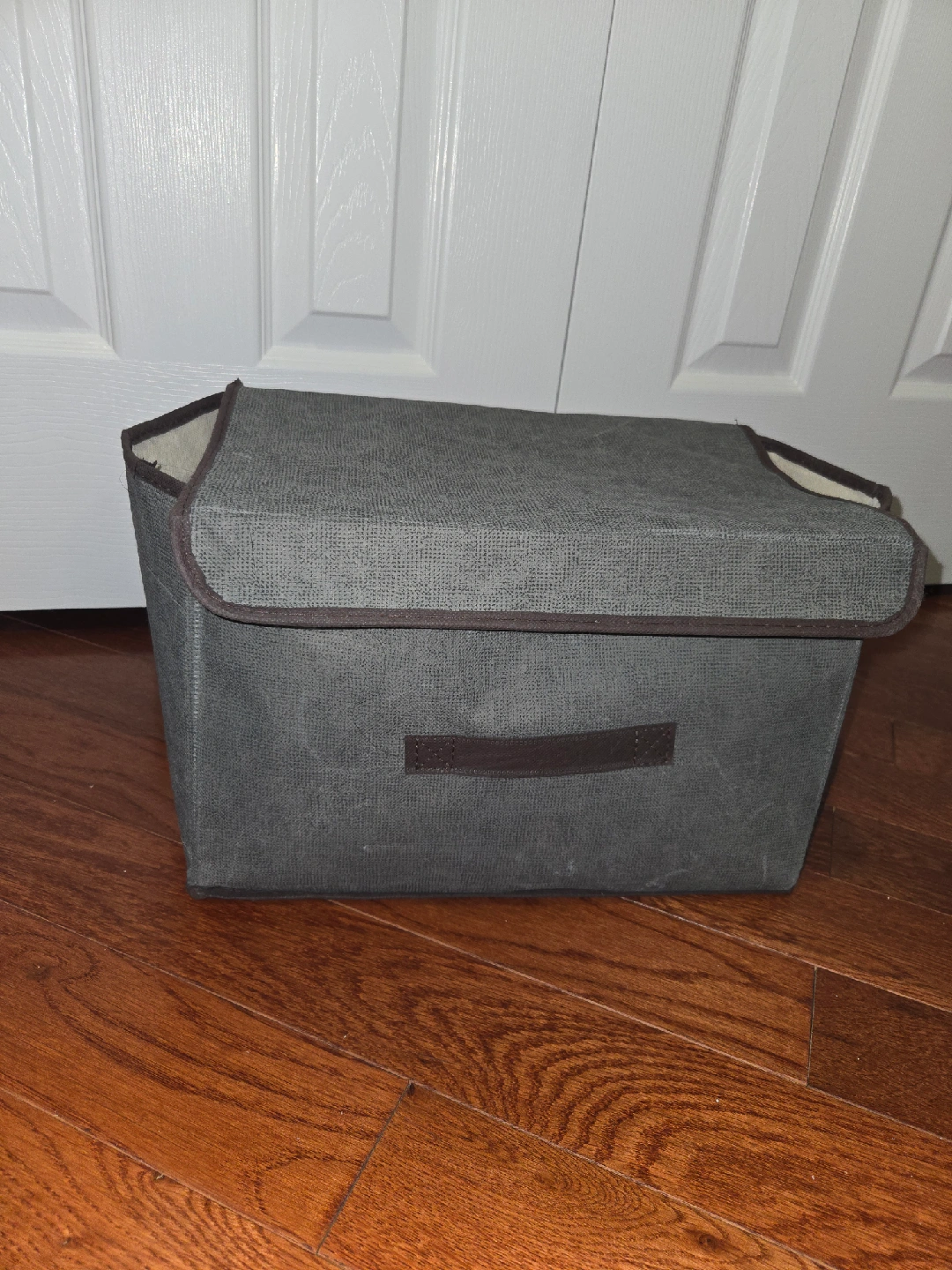 54This is a grey storage box with a handle, perfect for organizing your space! It's in great condition and ready for a new home