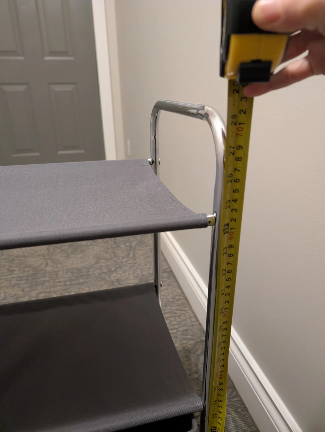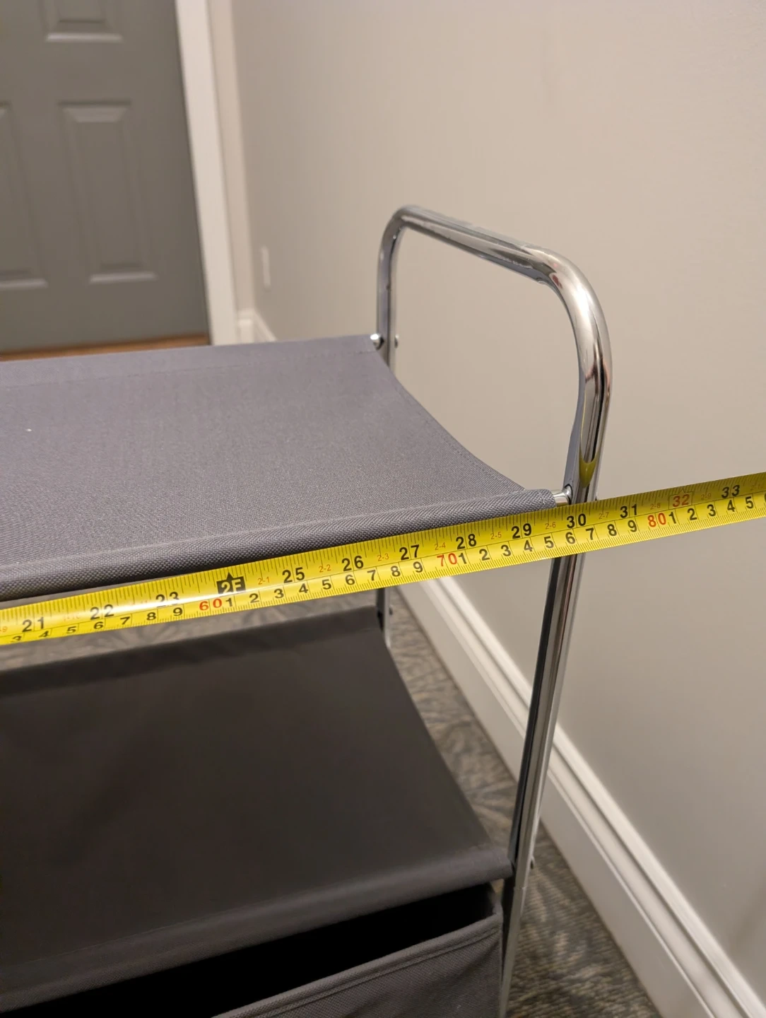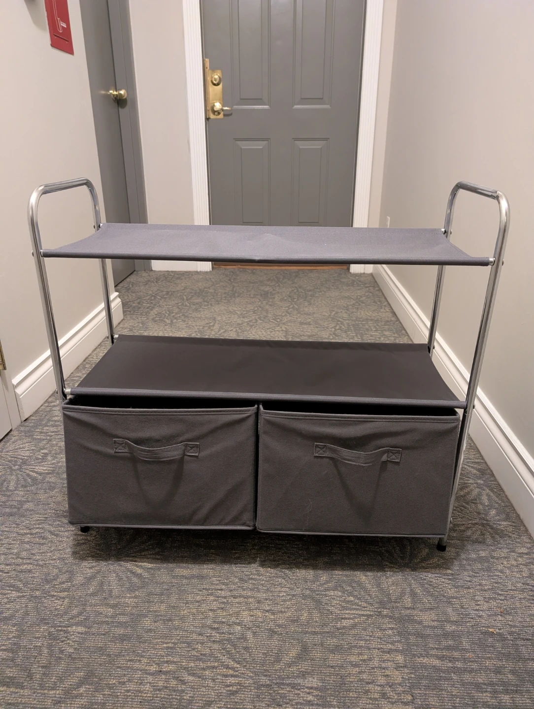 55Selling a grey storage shelf that comes with two fabric bins! The shelf is in great condition and is perfect for organizing any room. The dimensions are approximately 12 inches deep, 27 inches wide, and 20 inches tall
