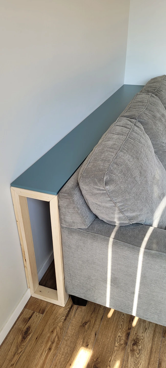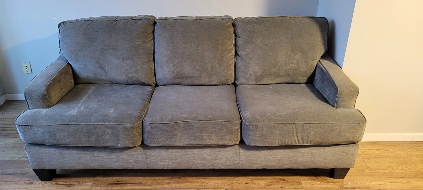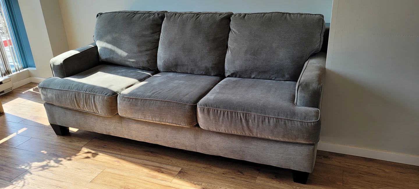 46Grey medium-sized couch with custom sized console table. Zipper cushion covers are easy to remove and machine wash. The console table fits perfectly behind the couch. Great for smaller spaces or if you do not have/ want a coffee table. Solid wood frame. Ikea countertop. Dimensions for the console table: W 210cm x D 23.5cm x H 78.5cm Dimensions for the couch: W 210cm x D 95 cm x H 90cm From a smoke-free home with one cat. Available for pickup near Kitsilano/ Fairview area.
